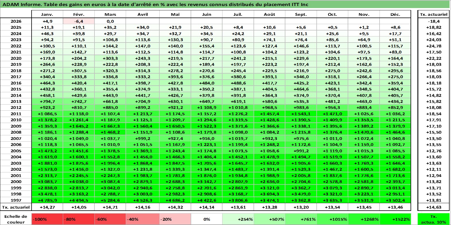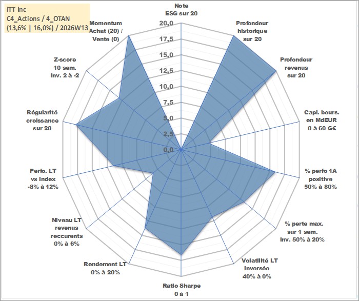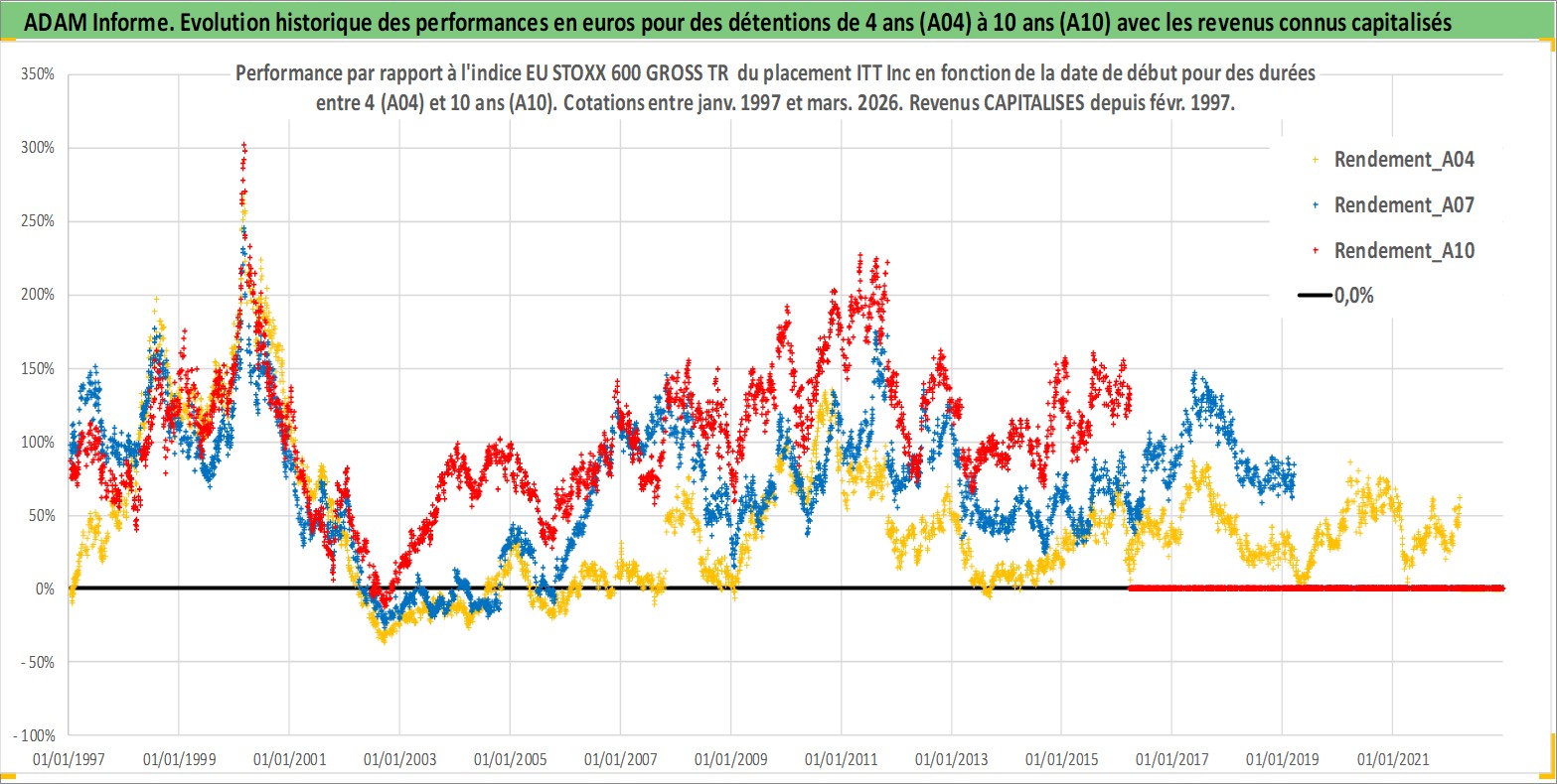 Site dédié aux investisseursPage dédiée sur site financeAnalyse des valorisations hebdomadaires de l'action ITT Inc. Cet actif est cote en USD. Les valorisations sont en contrevaleur EURO et couvrent les semaines 1997W01 a 2026W13. Les revenus de cet actif financier sont pris en compte depuis la semaine 1997W09. La note ESG de cet actif n'est pas connue.
