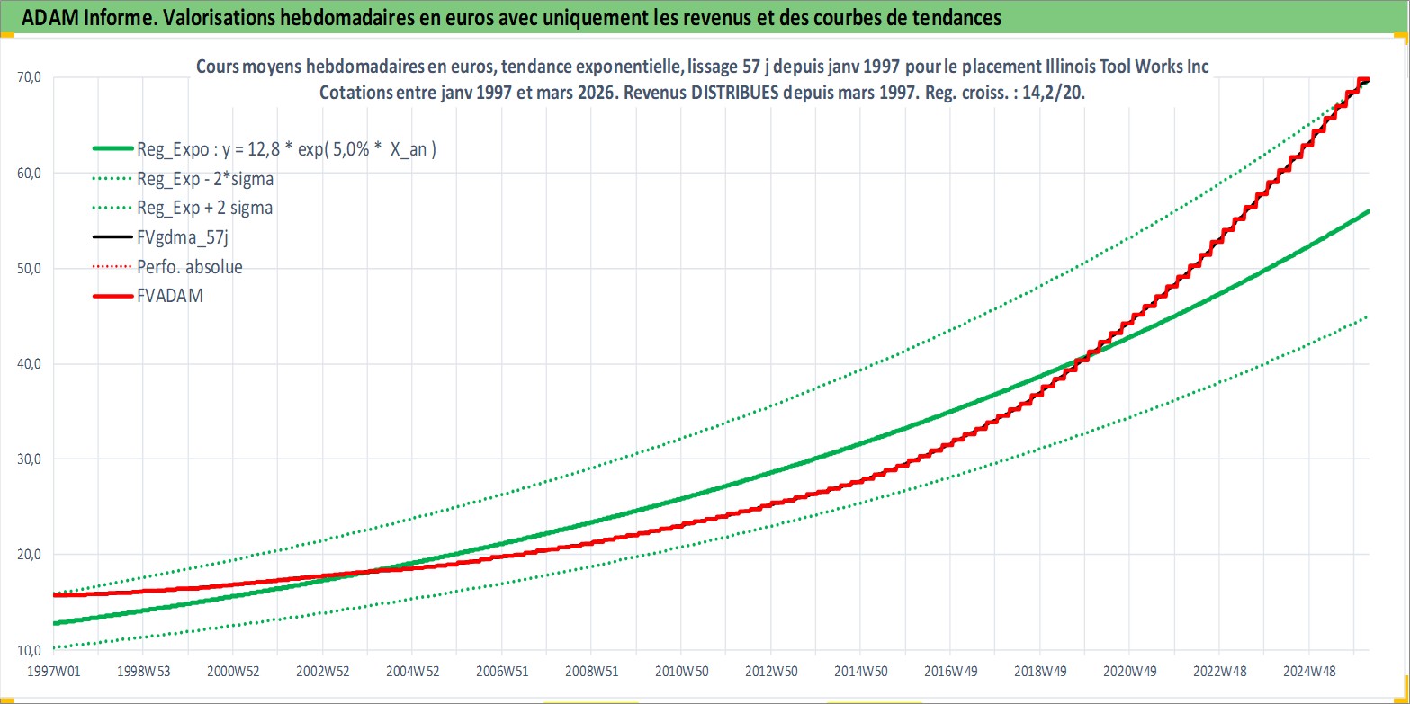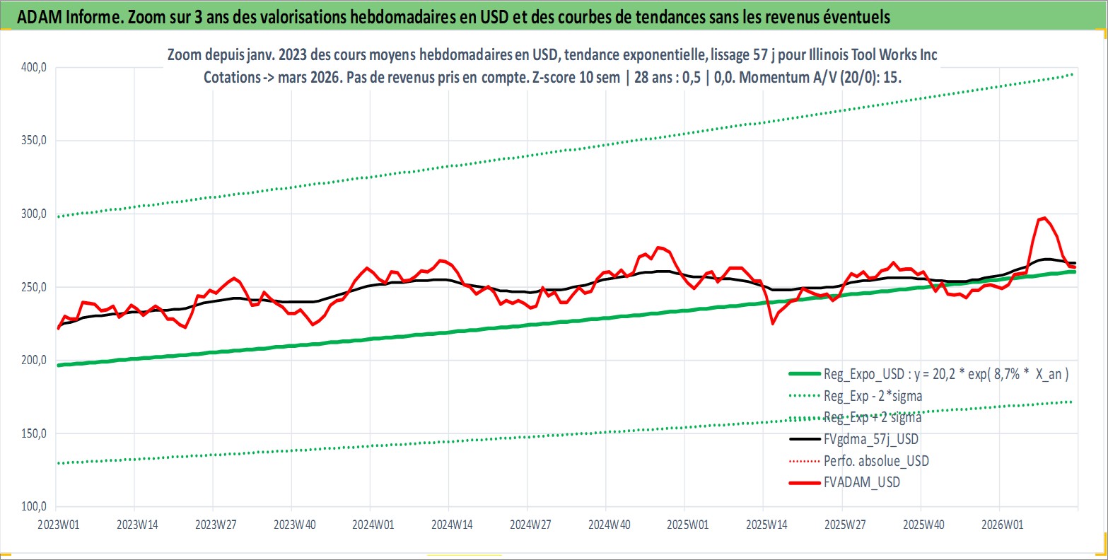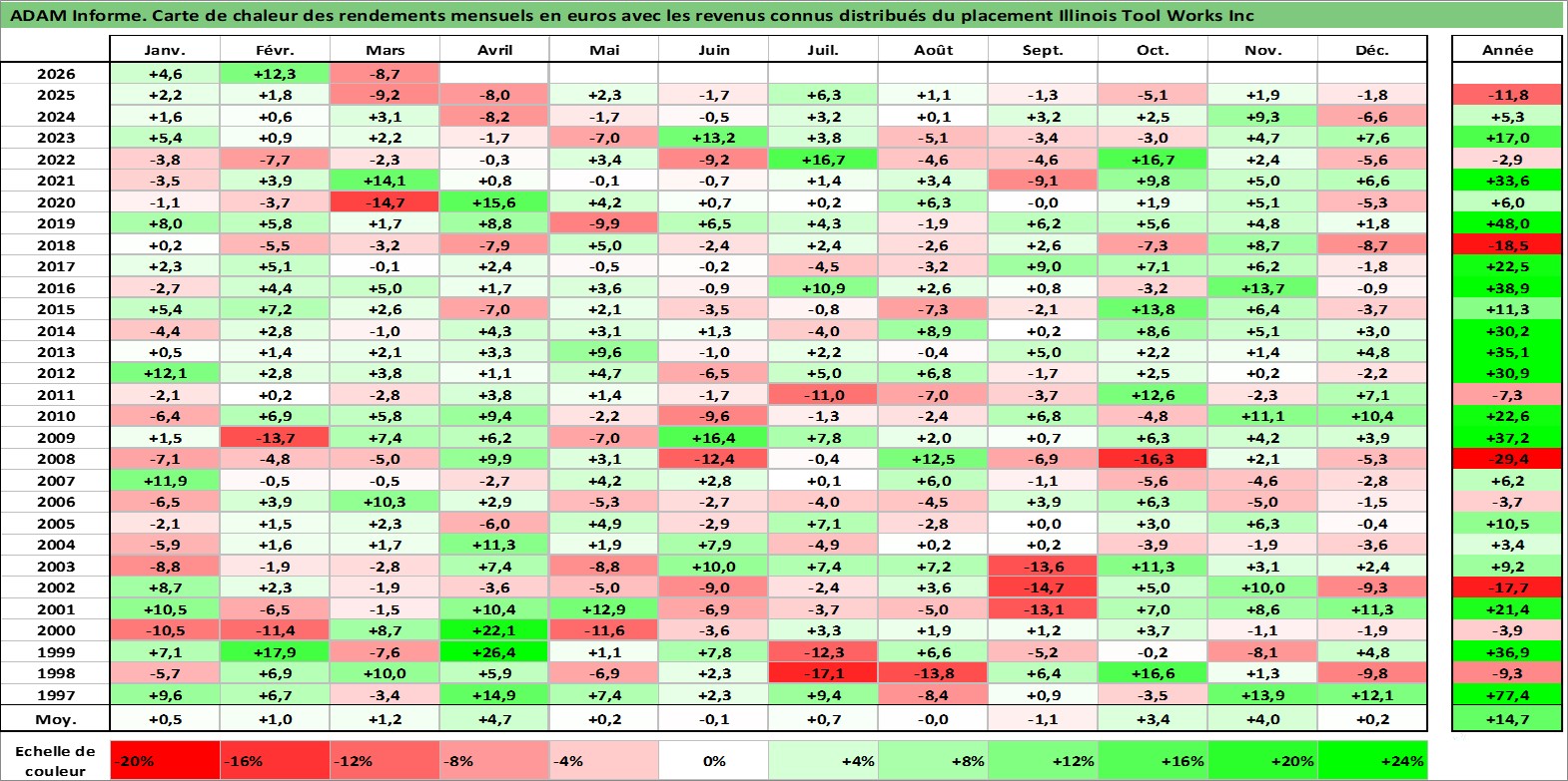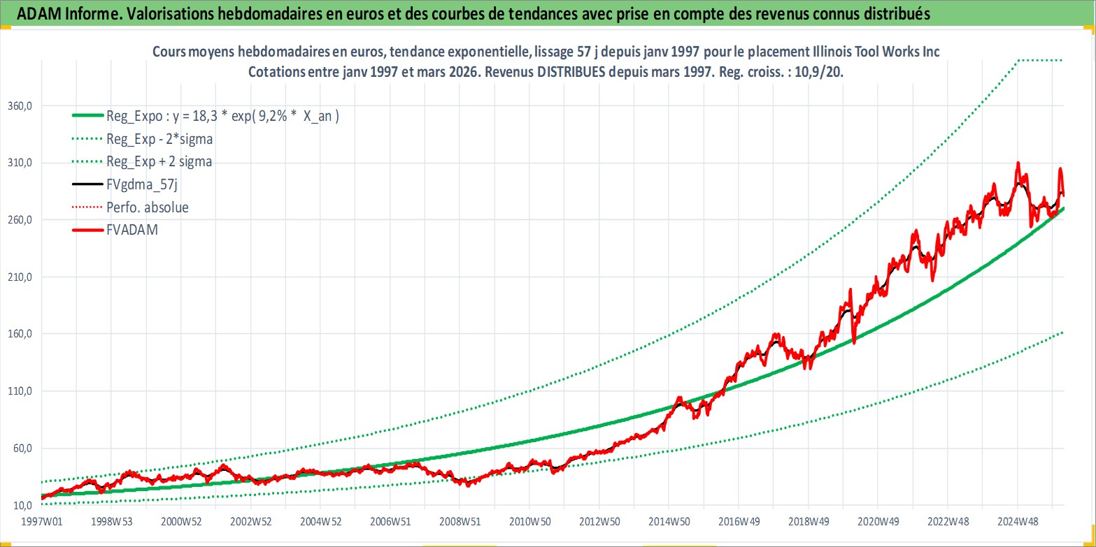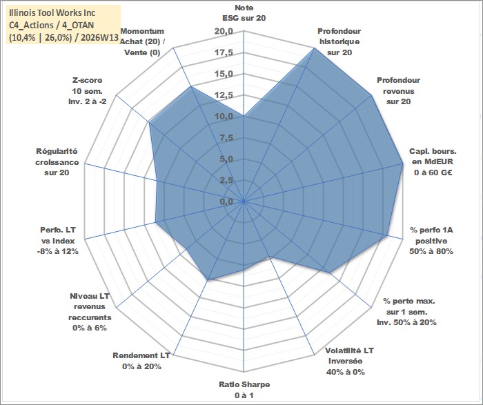 Site dédié aux investisseursPage dédiée sur site financeAnalyse des valorisations hebdomadaires de l'action Illinois Tool Works Inc. Cet actif est cote en USD. Les valorisations sont en contrevaleur EURO et couvrent les semaines 1997W01 a 2026W13. Les revenus de cet actif financier sont pris en compte depuis la semaine 1997W13. La note globale ESG de cet actif est estimee a 10.0 (apres rebasage entre 0 et 20).