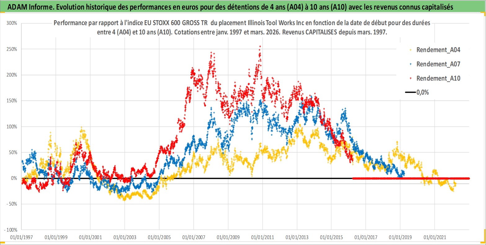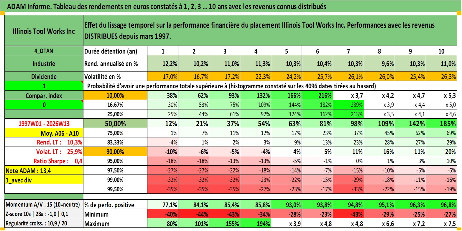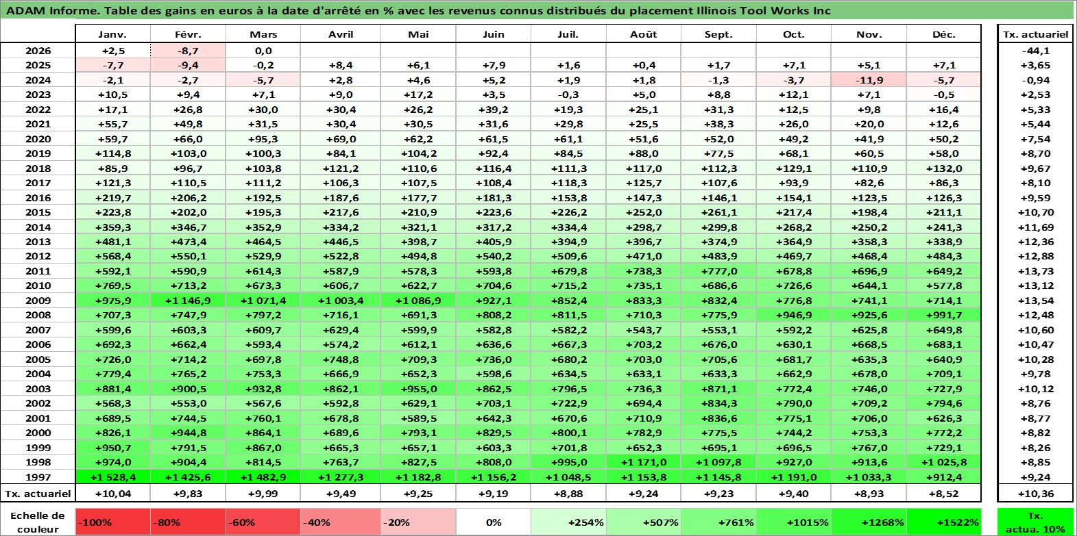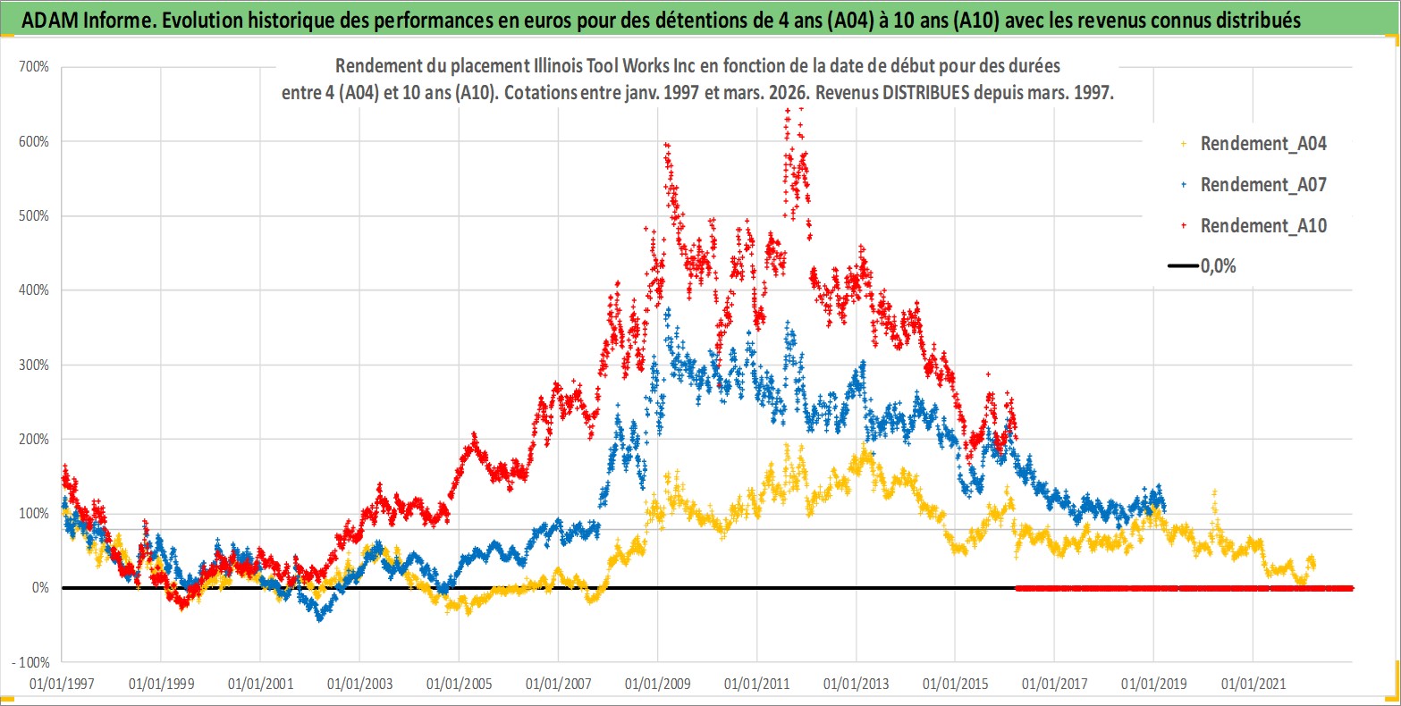 Site dédié aux investisseursPage dédiée sur site financeAnalyse des valorisations hebdomadaires de l'action Illinois Tool Works Inc. Cet actif est cote en USD. Les valorisations sont en contrevaleur EURO et couvrent les semaines 1997W01 a 2026W13. Les revenus de cet actif financier sont pris en compte depuis la semaine 1997W13. La note globale ESG de cet actif est estimee a 10.0 (apres rebasage entre 0 et 20).