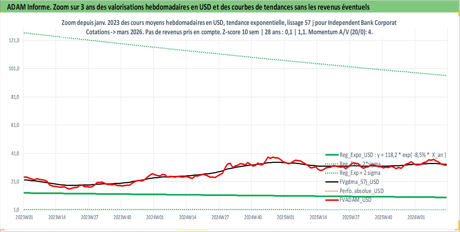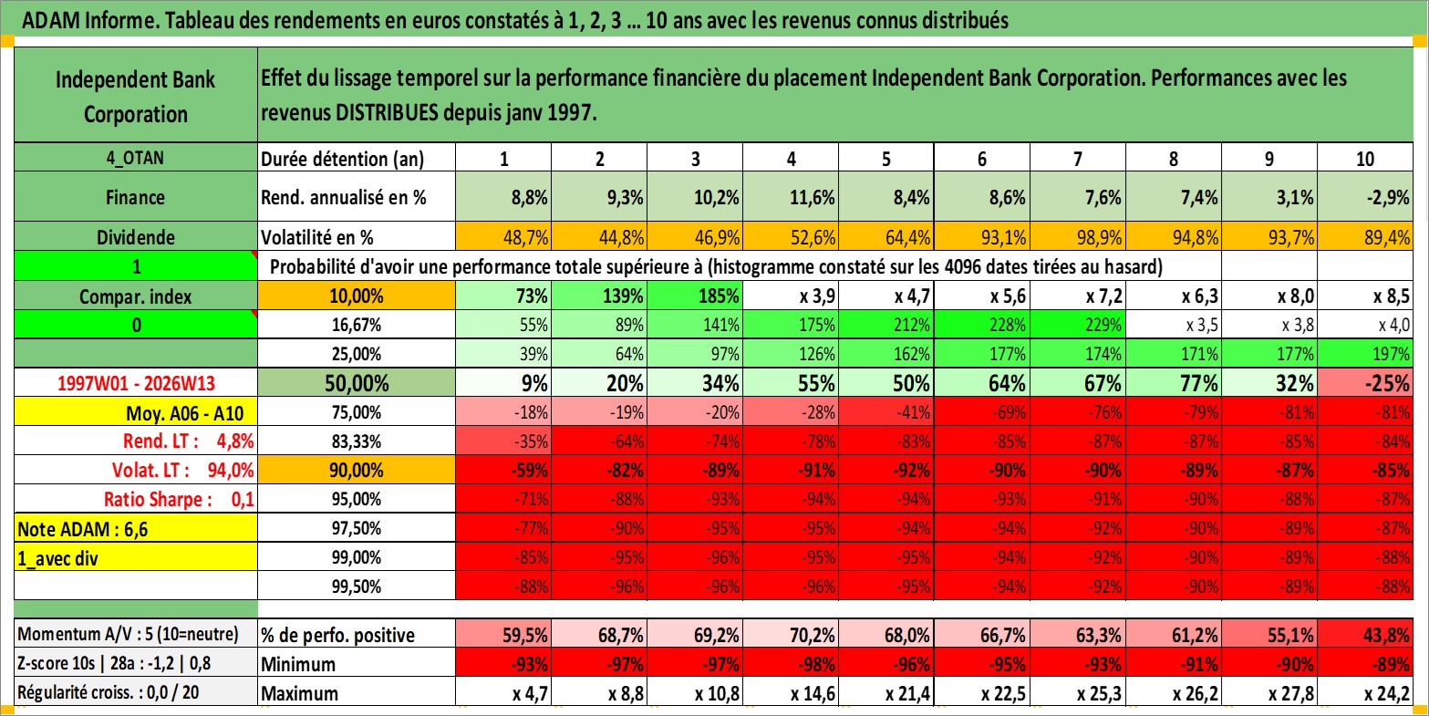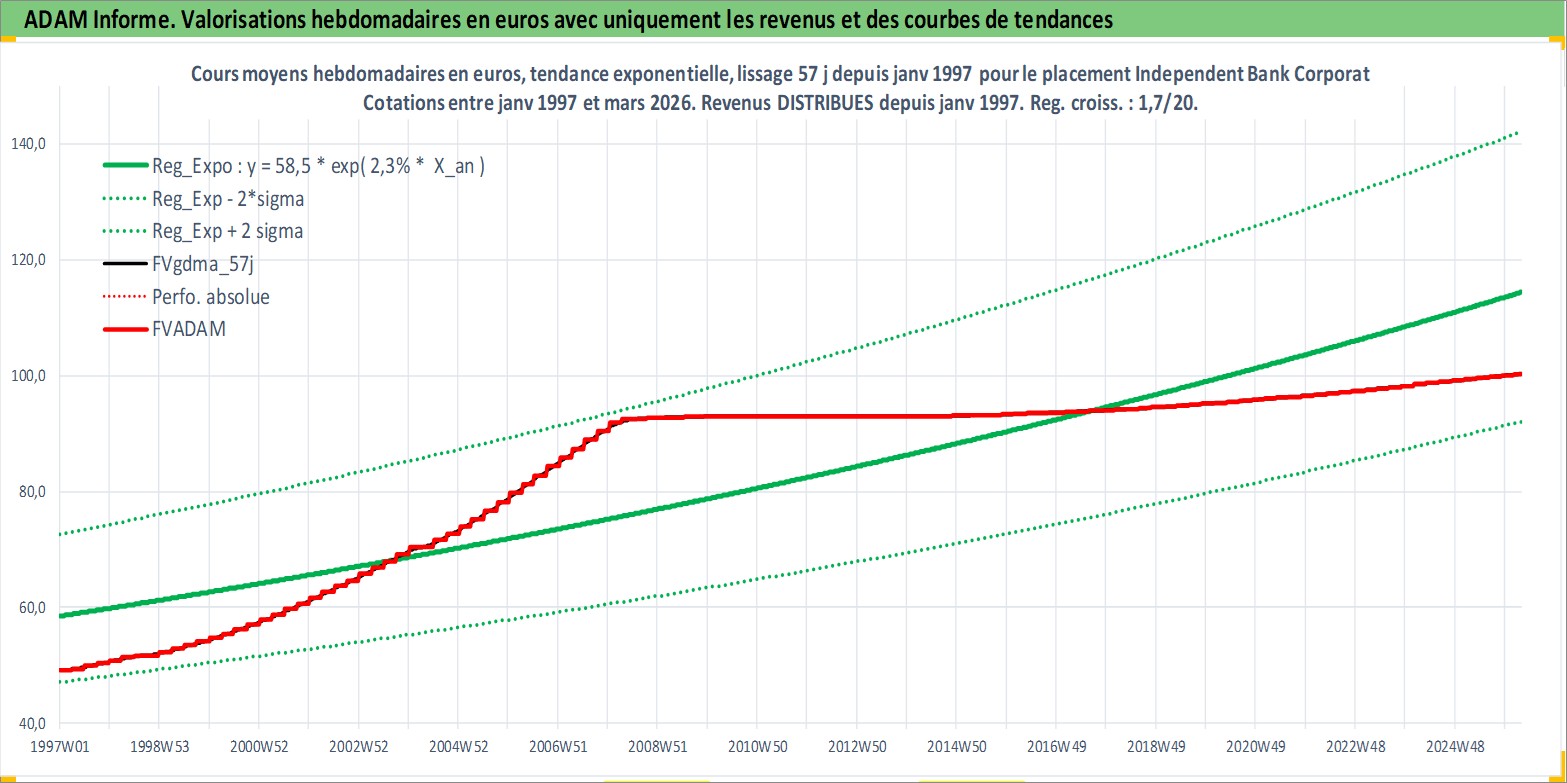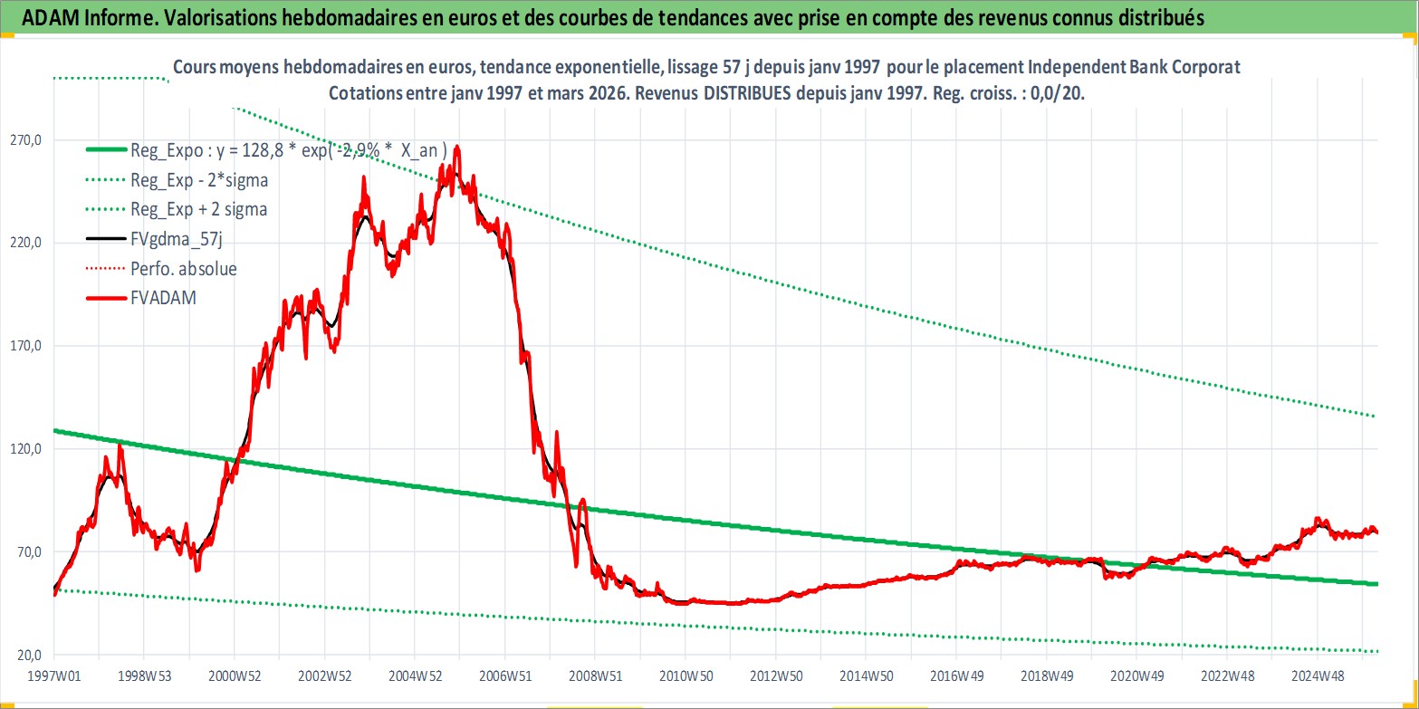 Site dédié aux investisseursPage dédiée sur site financeAnalyse des valorisations hebdomadaires de l'action Independent Bank Corporation. Cet actif est cote en USD. Les valorisations sont en contrevaleur EURO et couvrent les semaines 1997W01 a 2026W13. Les revenus de cet actif financier sont pris en compte depuis la semaine 1997W01. La note ESG de cet actif n'est pas connue.