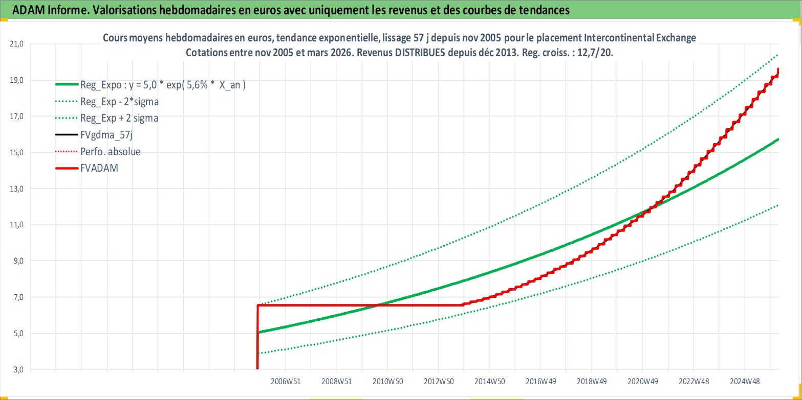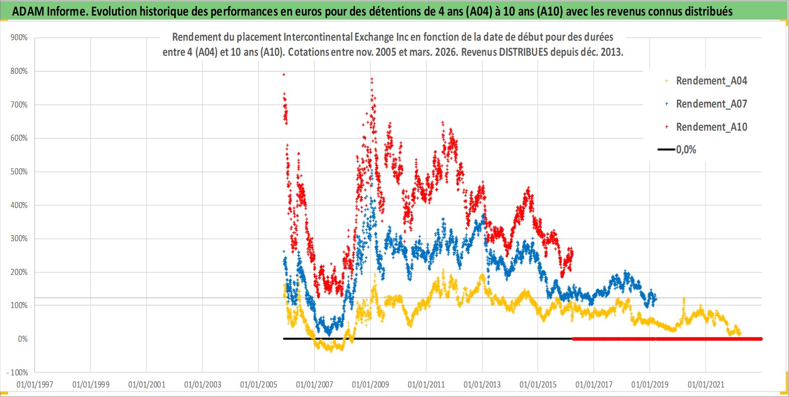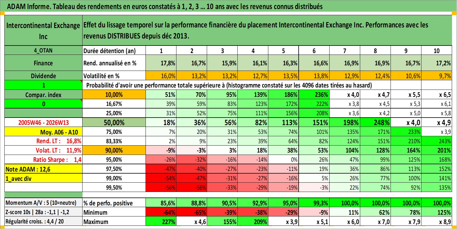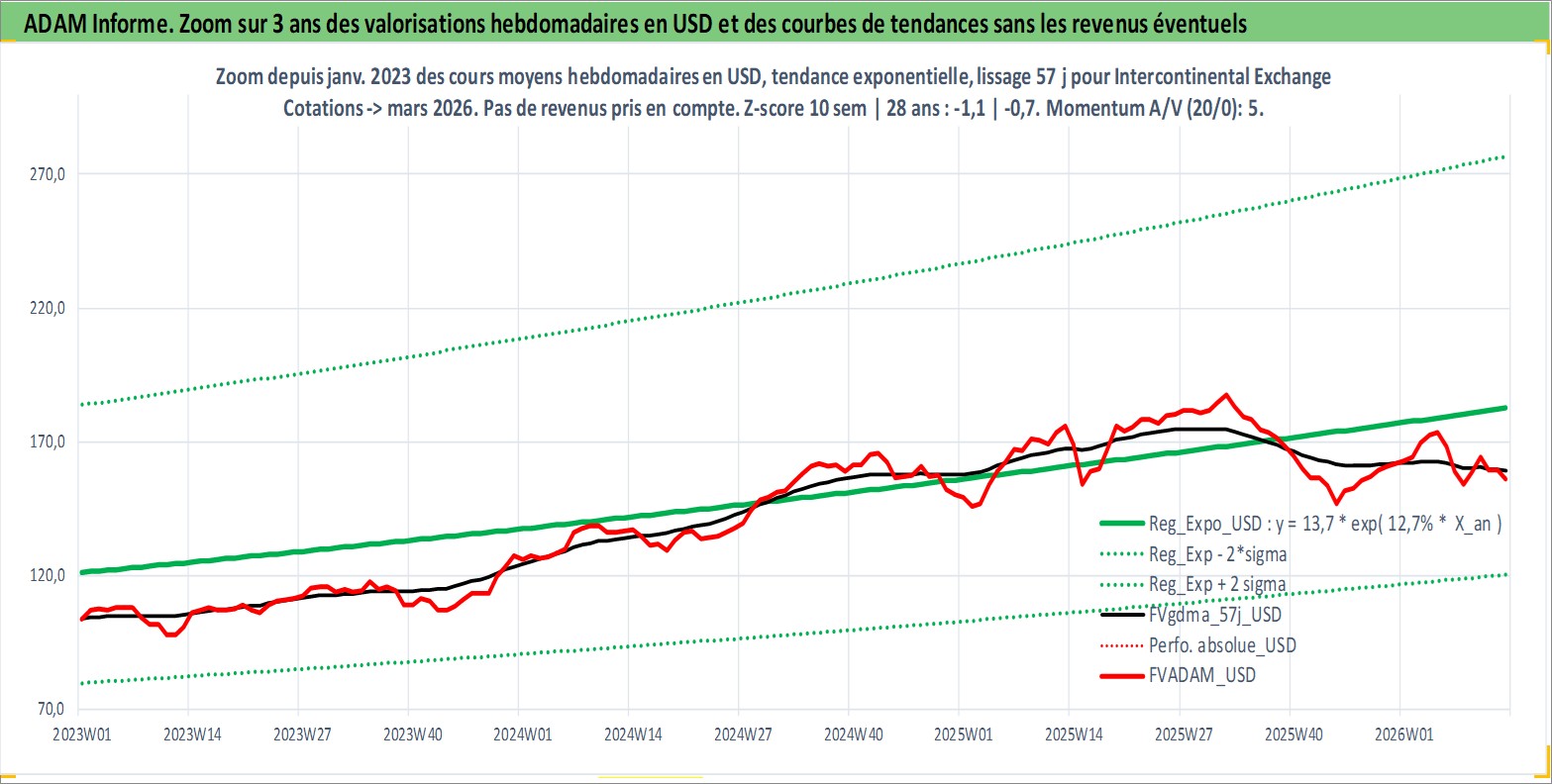 Site dédié aux investisseursPage dédiée sur site financeAnalyse des valorisations hebdomadaires de l'action Intercontinental Exchange Inc. Cet actif est cote en USD. Les valorisations sont en contrevaleur EURO et couvrent les semaines 2005W46 a 2026W13. Les revenus de cet actif financier sont pris en compte depuis la semaine 2013W50. La note globale ESG de cet actif est estimee a 13.0 (apres rebasage entre 0 et 20).
