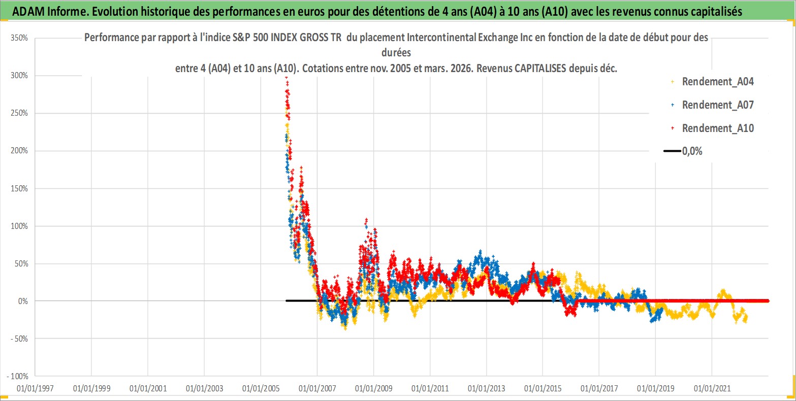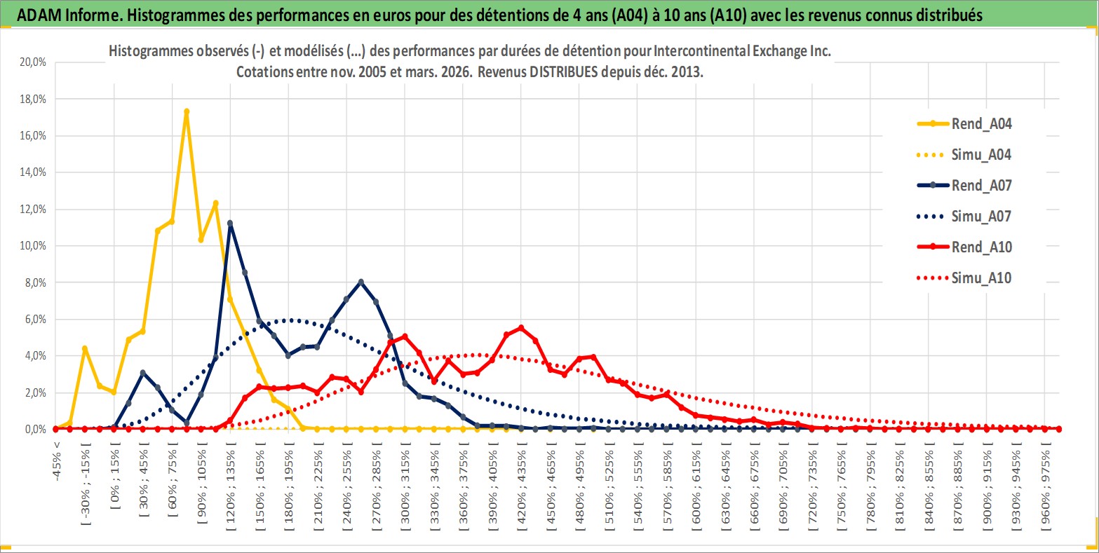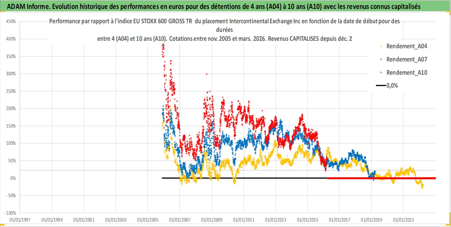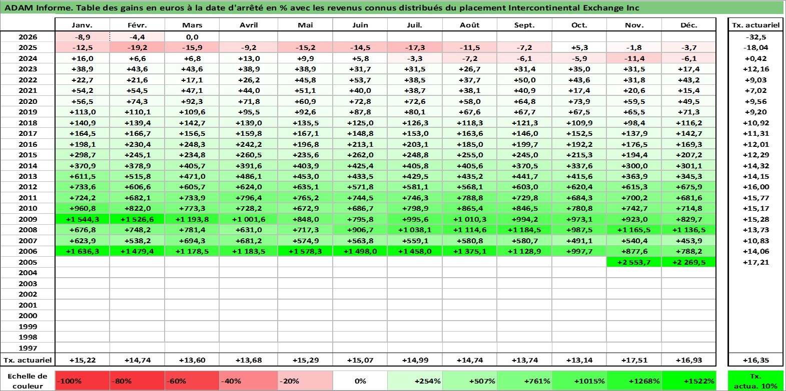Site dédié aux investisseursPage dédiée sur site financeAnalyse des valorisations hebdomadaires de l'action Intercontinental Exchange Inc. Cet actif est cote en USD. Les valorisations sont en contrevaleur EURO et couvrent les semaines 2005W46 a 2026W13. Les revenus de cet actif financier sont pris en compte depuis la semaine 2013W50. La note globale ESG de cet actif est estimee a 13.0 (apres rebasage entre 0 et 20).