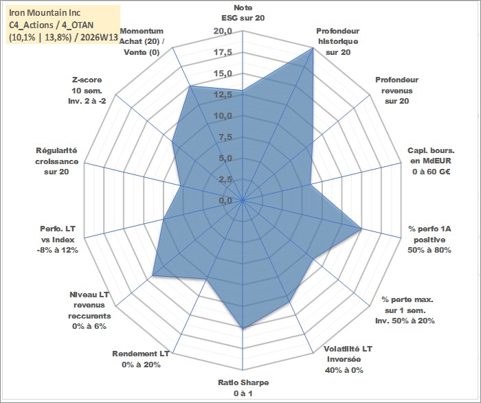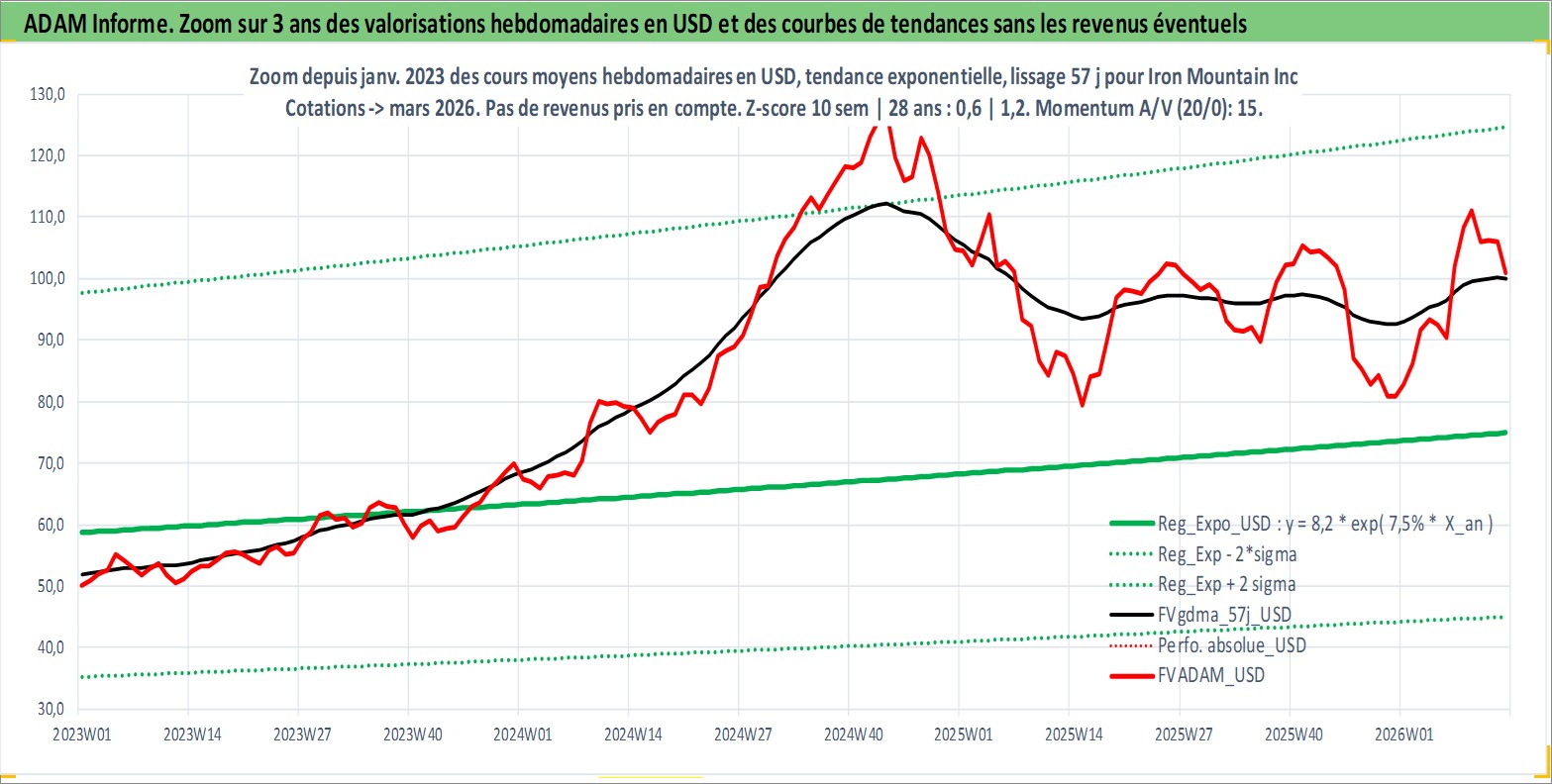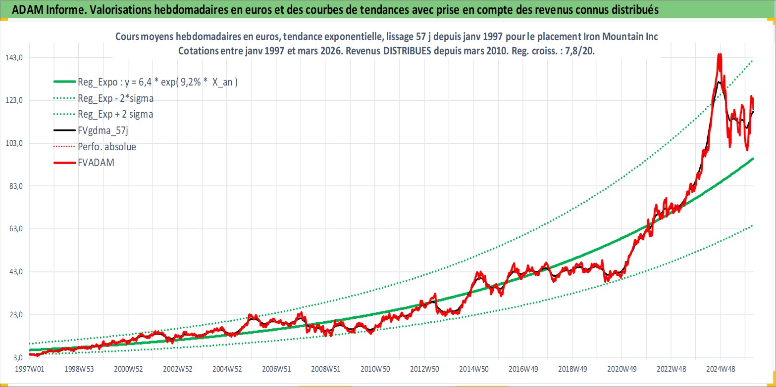 Site dédié aux investisseursPage dédiée sur site financeAnalyse des valorisations hebdomadaires de l'action Iron Mountain Inc. Cet actif est cote en USD. Les valorisations sont en contrevaleur EURO et couvrent les semaines 1997W01 a 2026W13. Les revenus de cet actif financier sont pris en compte depuis la semaine 2010W12. La note globale ESG de cet actif est estimee a 13.0 (apres rebasage entre 0 et 20).