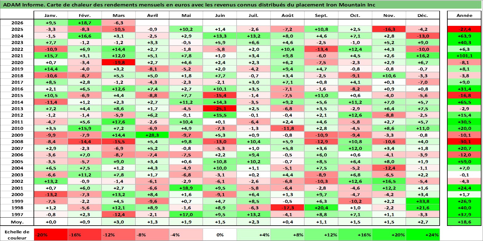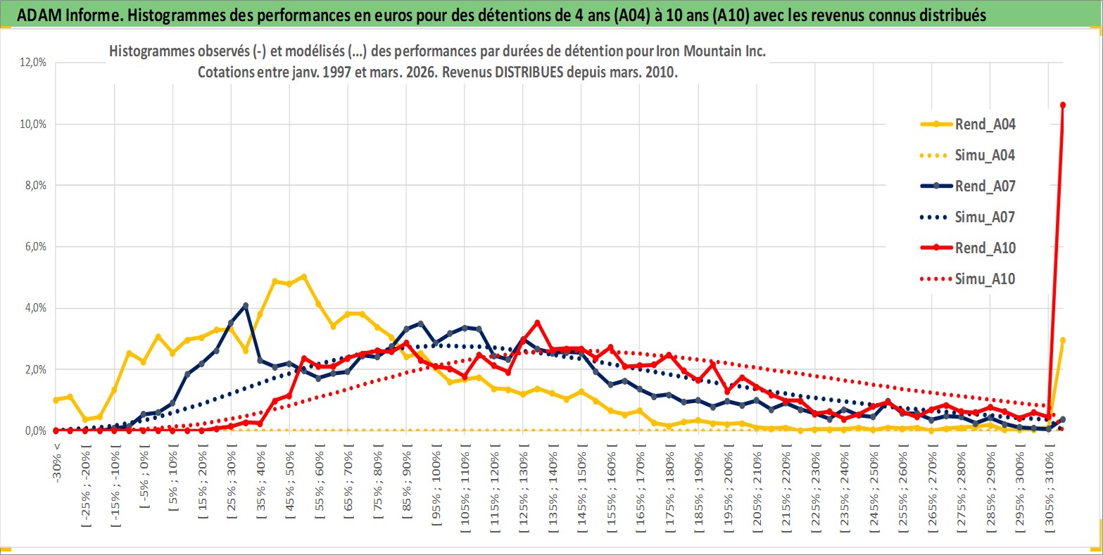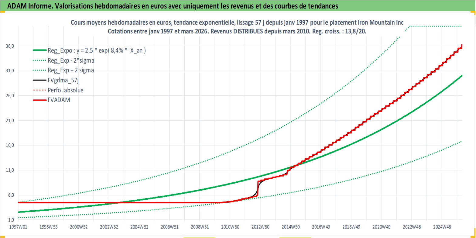 Site dédié aux investisseursPage dédiée sur site financeAnalyse des valorisations hebdomadaires de l'action Iron Mountain Inc. Cet actif est cote en USD. Les valorisations sont en contrevaleur EURO et couvrent les semaines 1997W01 a 2026W13. Les revenus de cet actif financier sont pris en compte depuis la semaine 2010W12. La note globale ESG de cet actif est estimee a 13.0 (apres rebasage entre 0 et 20).