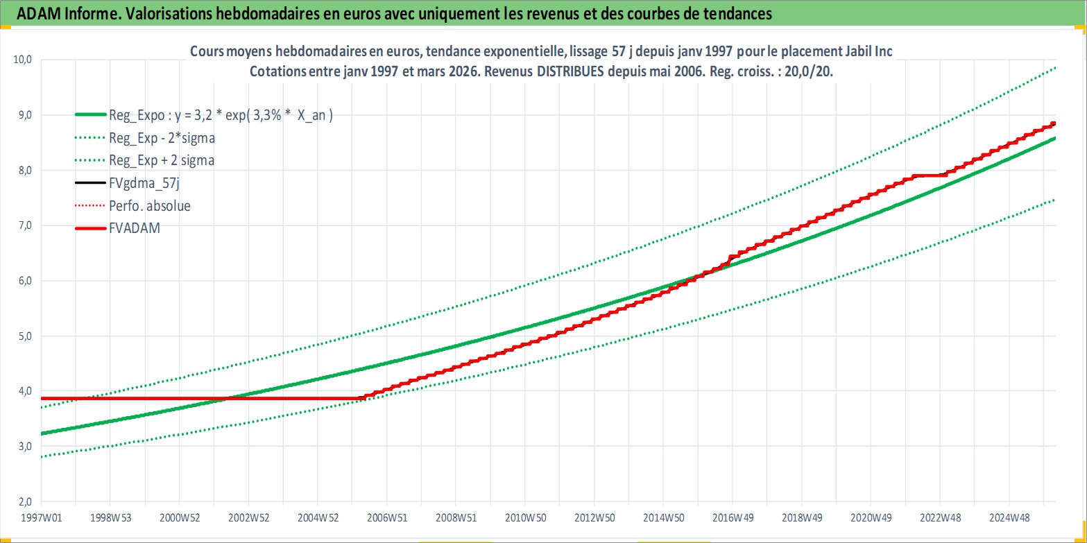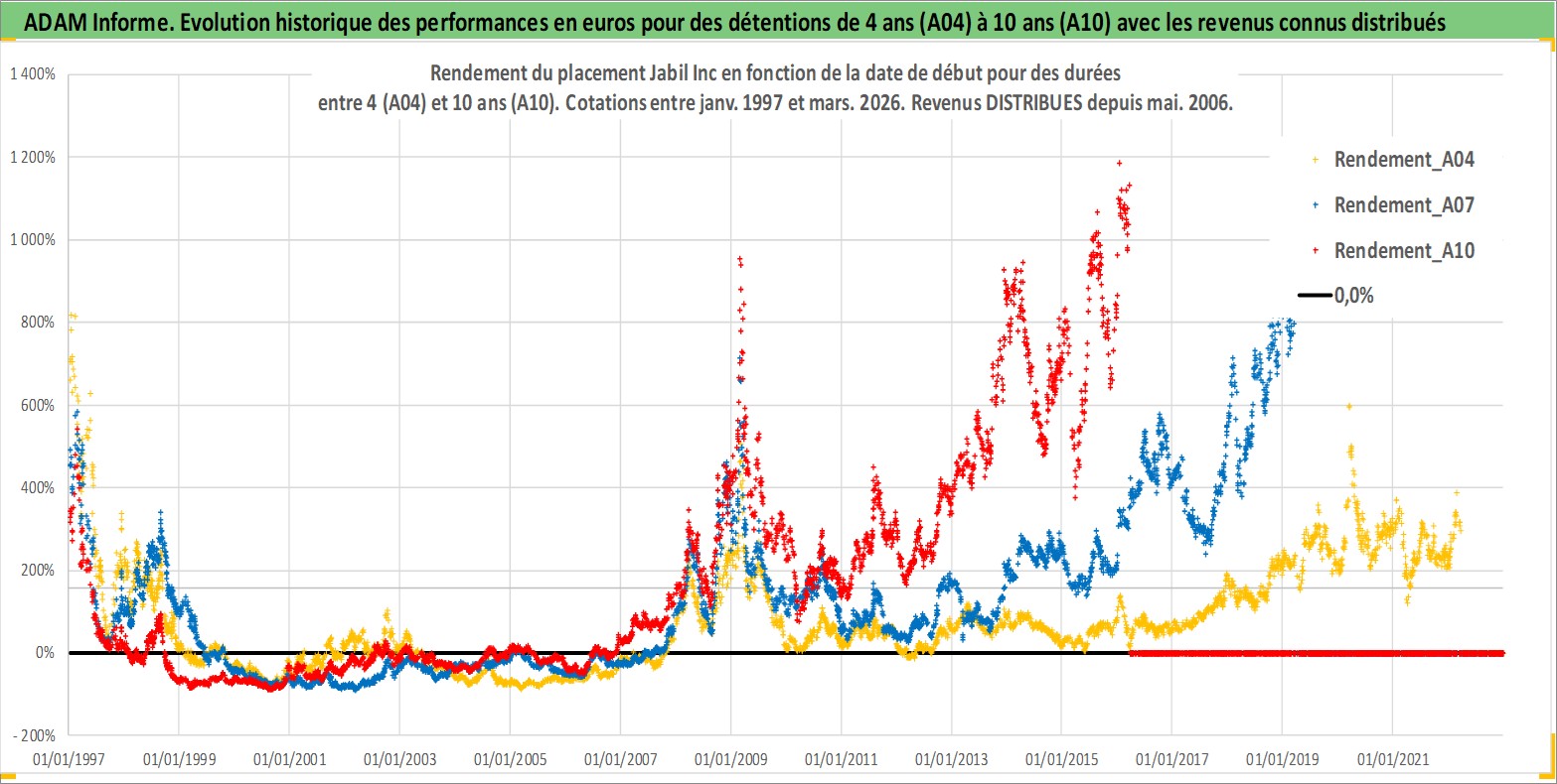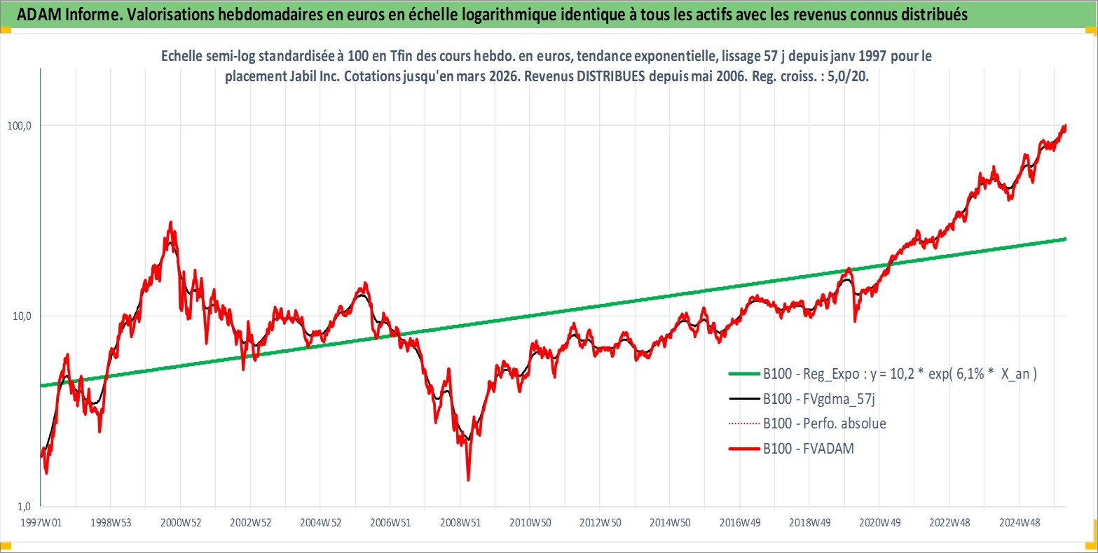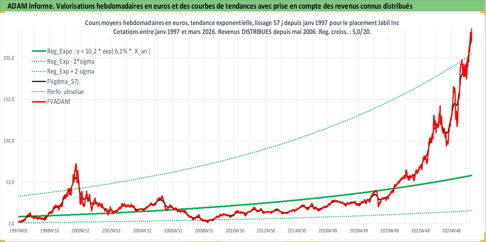 Site dédié aux investisseursPage dédiée sur site financeAnalyse des valorisations hebdomadaires de l'action Jabil Inc. Cet actif est cote en USD. Les valorisations sont en contrevaleur EURO et couvrent les semaines 1997W01 a 2026W13. Les revenus de cet actif financier sont pris en compte depuis la semaine 2006W19. La note ESG de cet actif n'est pas connue.