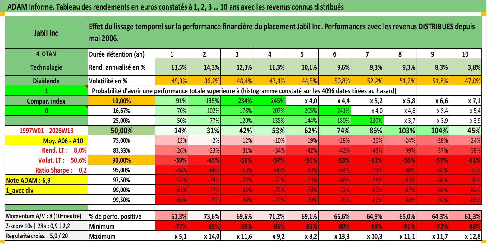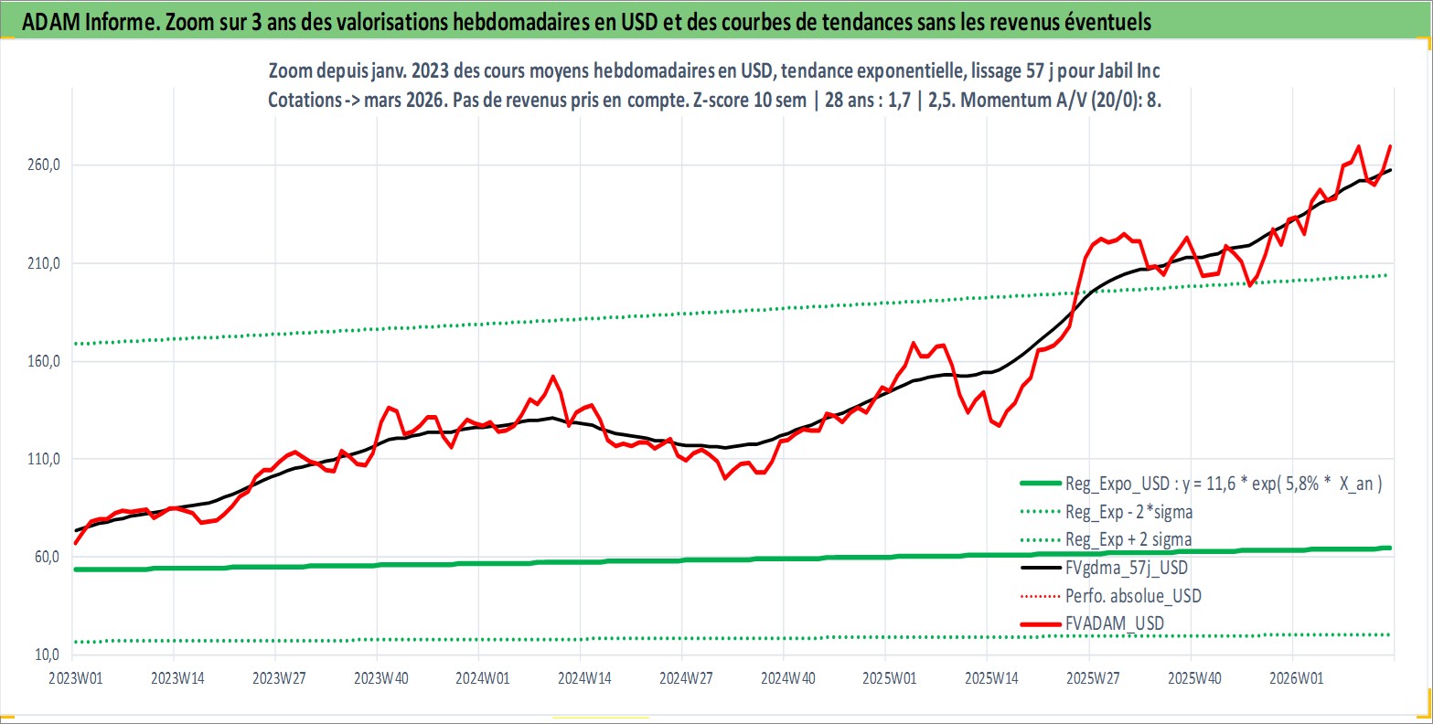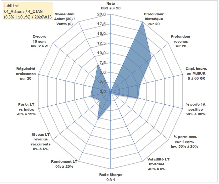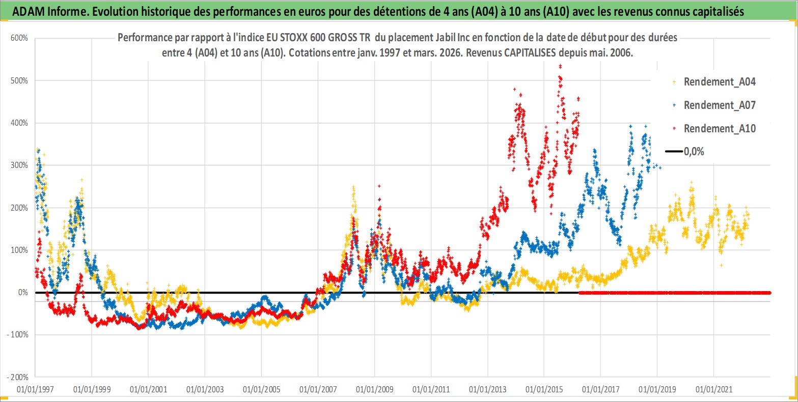 Site dédié aux investisseursPage dédiée sur site financeAnalyse des valorisations hebdomadaires de l'action Jabil Inc. Cet actif est cote en USD. Les valorisations sont en contrevaleur EURO et couvrent les semaines 1997W01 a 2026W13. Les revenus de cet actif financier sont pris en compte depuis la semaine 2006W19. La note ESG de cet actif n'est pas connue.