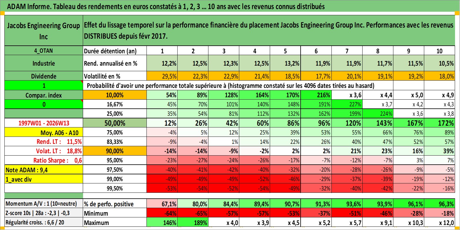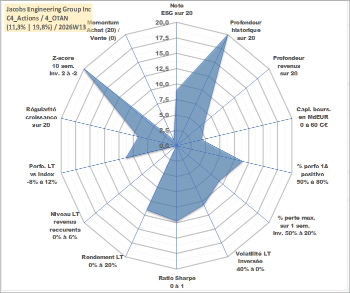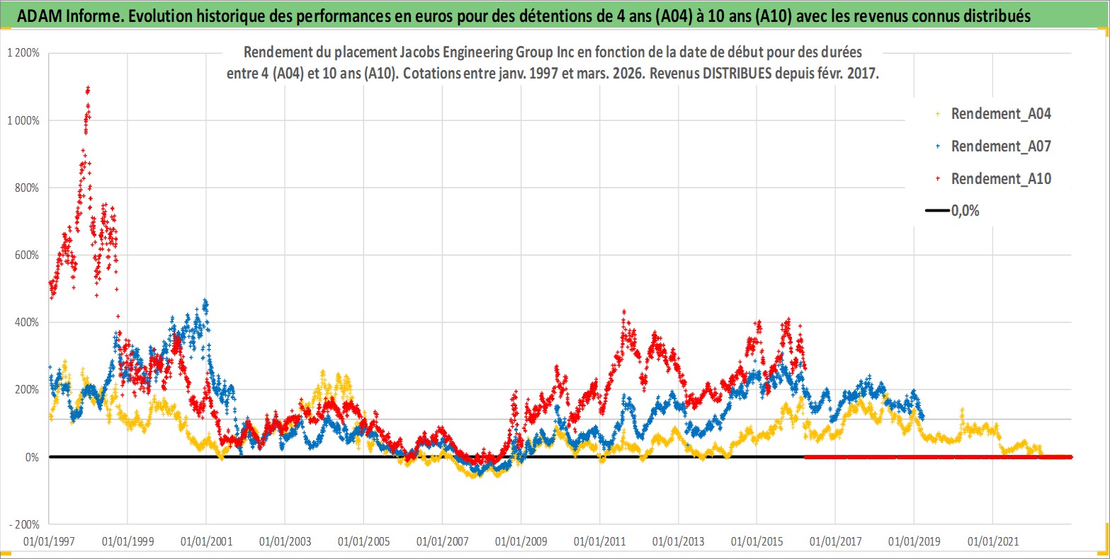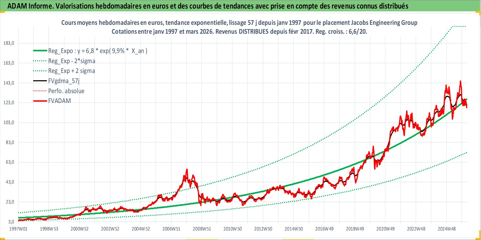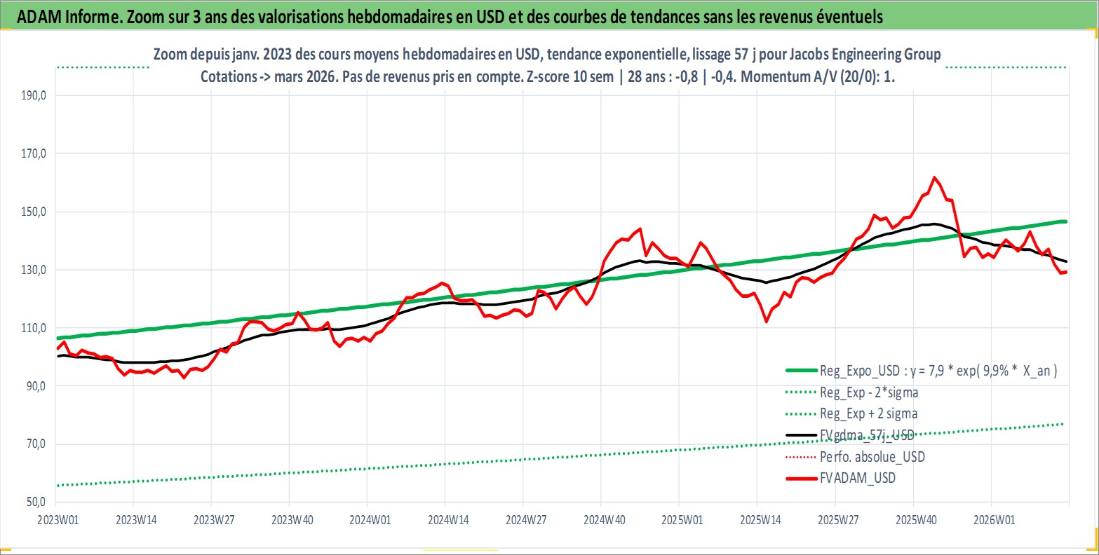 Site dédié aux investisseursPage dédiée sur site financeAnalyse des valorisations hebdomadaires de l'action Jacobs Engineering Group Inc. Cet actif est cote en USD. Les valorisations sont en contrevaleur EURO et couvrent les semaines 1997W01 a 2026W13. Les revenus de cet actif financier sont pris en compte depuis la semaine 2017W07. La note globale ESG de cet actif est estimee a 9.0 (apres rebasage entre 0 et 20).