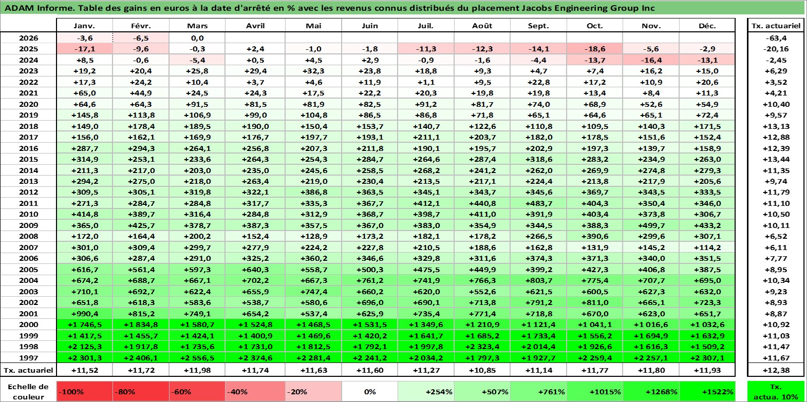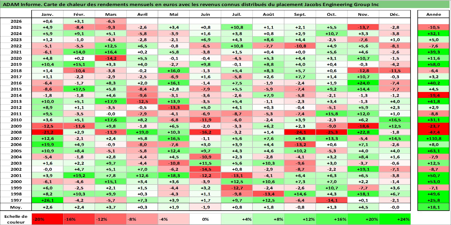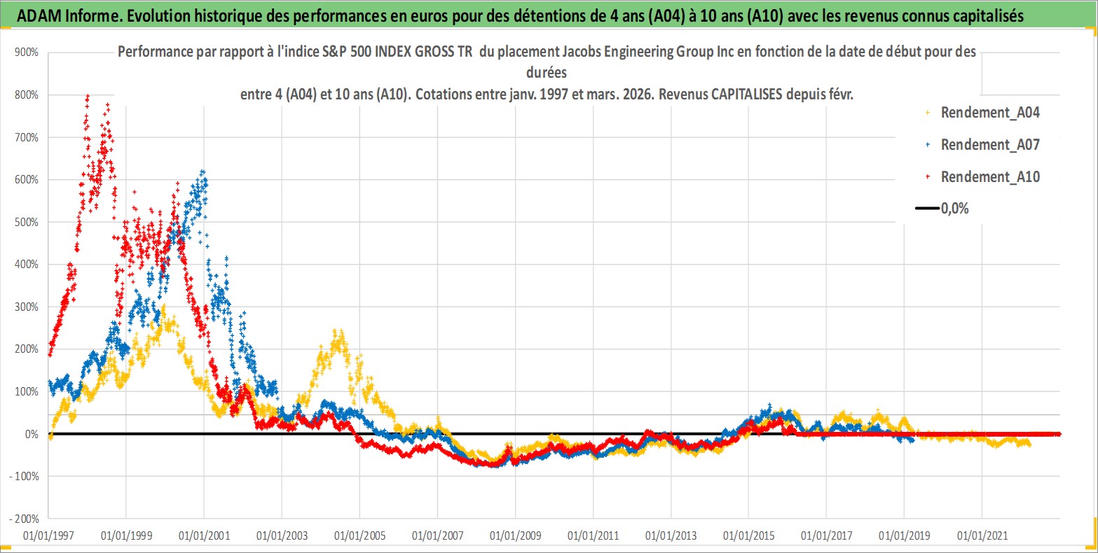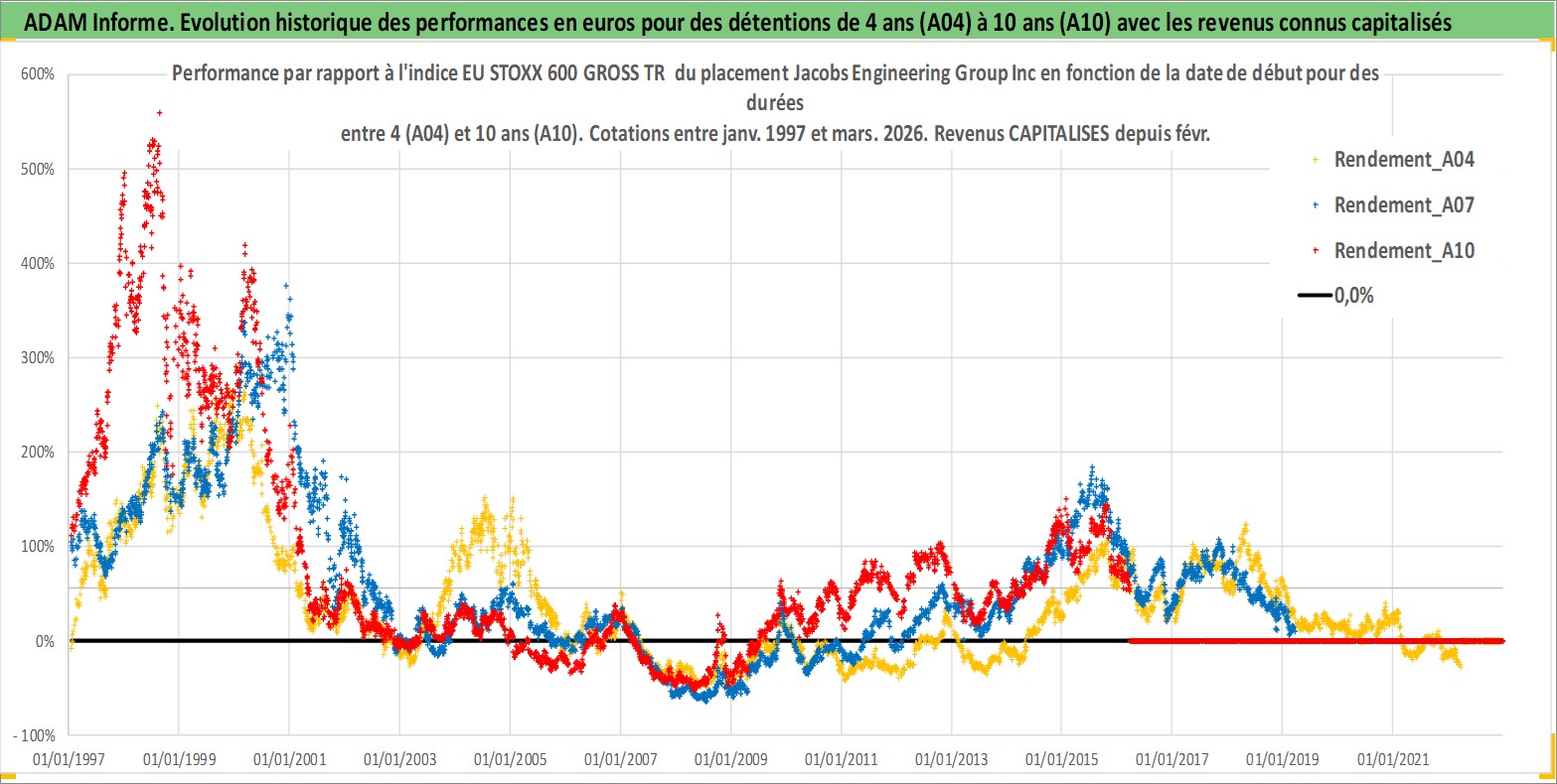 Site dédié aux investisseursPage dédiée sur site financeAnalyse des valorisations hebdomadaires de l'action Jacobs Engineering Group Inc. Cet actif est cote en USD. Les valorisations sont en contrevaleur EURO et couvrent les semaines 1997W01 a 2026W13. Les revenus de cet actif financier sont pris en compte depuis la semaine 2017W07. La note globale ESG de cet actif est estimee a 9.0 (apres rebasage entre 0 et 20).