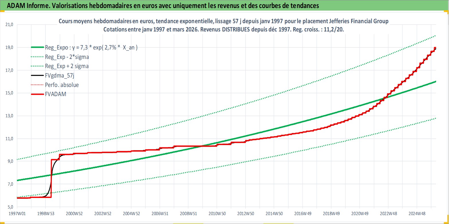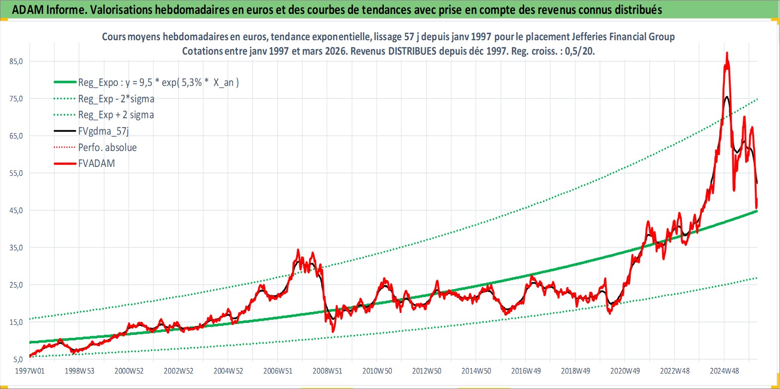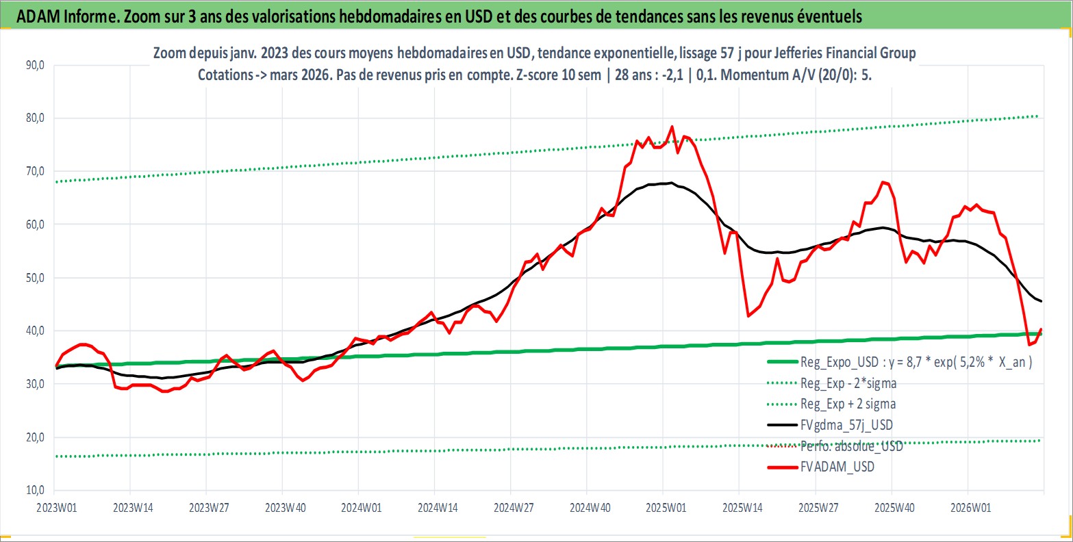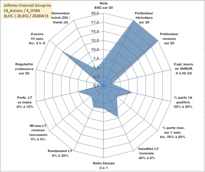 Site dédié aux investisseursPage dédiée sur site financeAnalyse des valorisations hebdomadaires de l'action Jefferies Financial Group Inc. Cet actif est cote en USD. Les valorisations sont en contrevaleur EURO et couvrent les semaines 1997W01 a 2026W13. Les revenus de cet actif financier sont pris en compte depuis la semaine 1997W49. La note globale ESG de cet actif est estimee a 7.0 (apres rebasage entre 0 et 20).