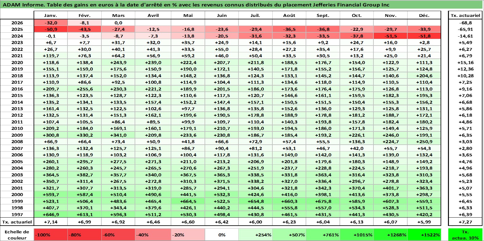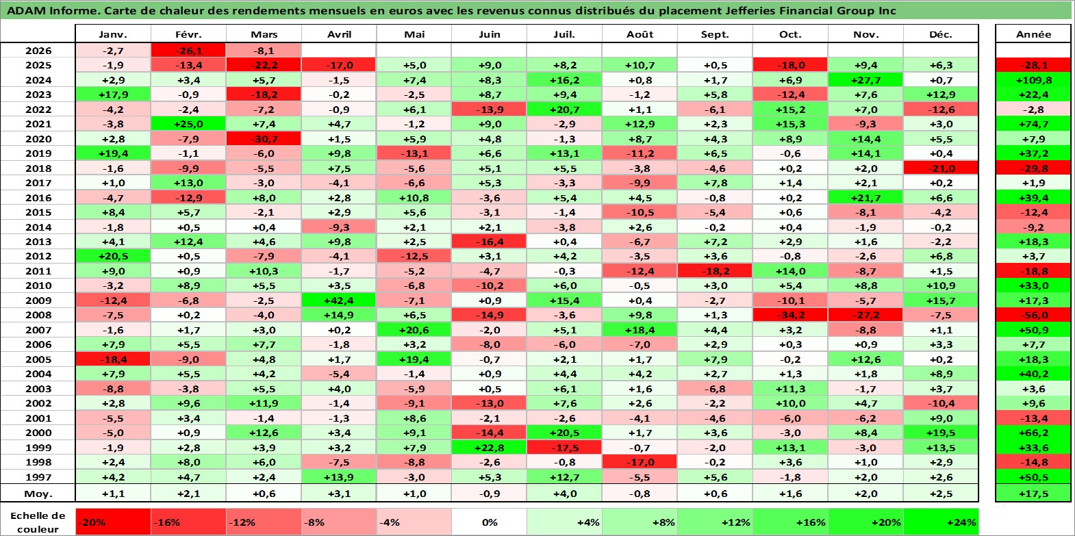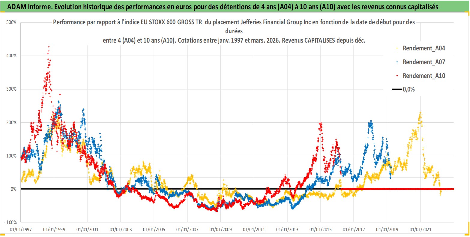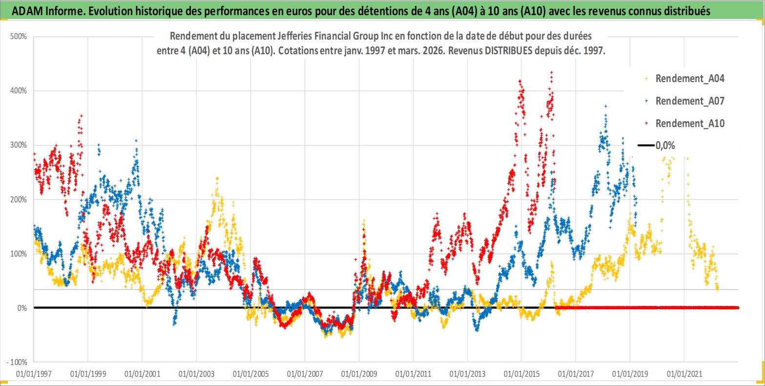 Site dédié aux investisseursPage dédiée sur site financeAnalyse des valorisations hebdomadaires de l'action Jefferies Financial Group Inc. Cet actif est cote en USD. Les valorisations sont en contrevaleur EURO et couvrent les semaines 1997W01 a 2026W13. Les revenus de cet actif financier sont pris en compte depuis la semaine 1997W49. La note globale ESG de cet actif est estimee a 7.0 (apres rebasage entre 0 et 20).