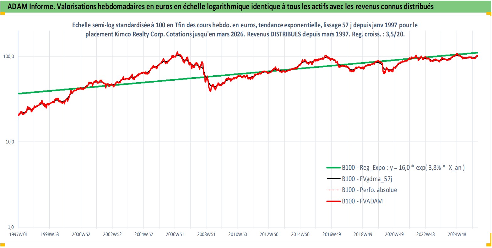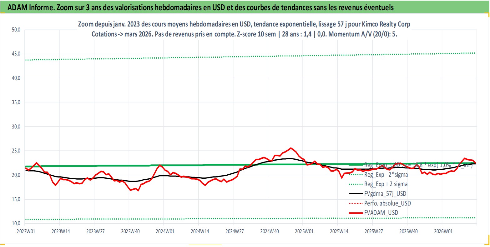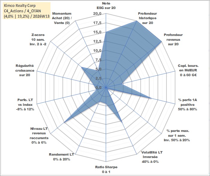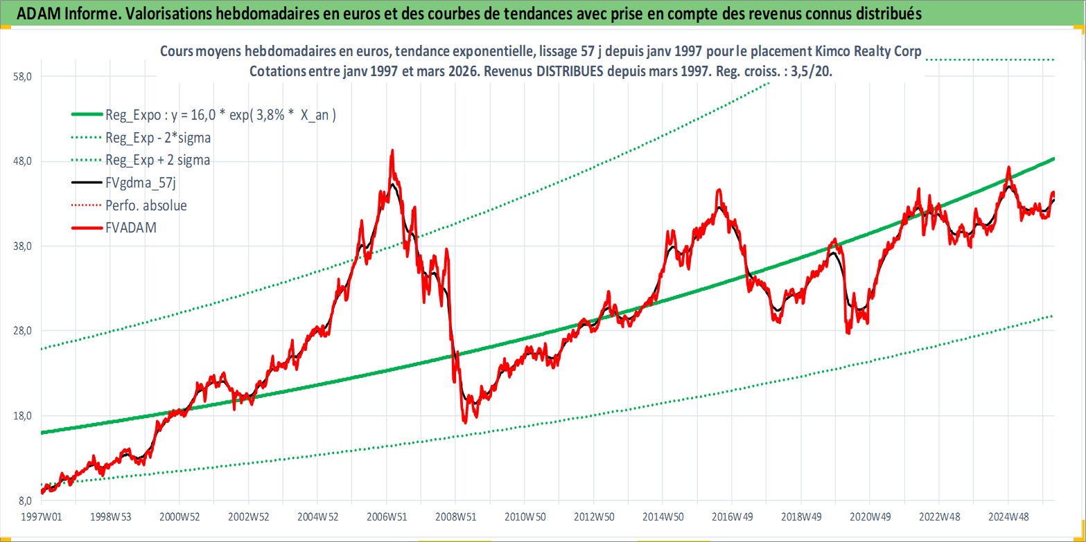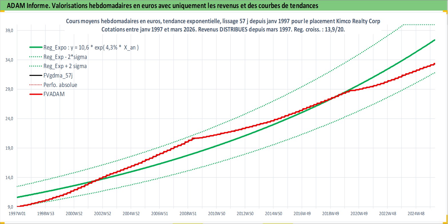 Site dédié aux investisseursPage dédiée sur site financeAnalyse des valorisations hebdomadaires de l'action Kimco Realty Corp. Cet actif est cote en USD. Les valorisations sont en contrevaleur EURO et couvrent les semaines 1997W01 a 2026W13. Les revenus de cet actif financier sont pris en compte depuis la semaine 1997W13. La note globale ESG de cet actif est estimee a 15.0 (apres rebasage entre 0 et 20).