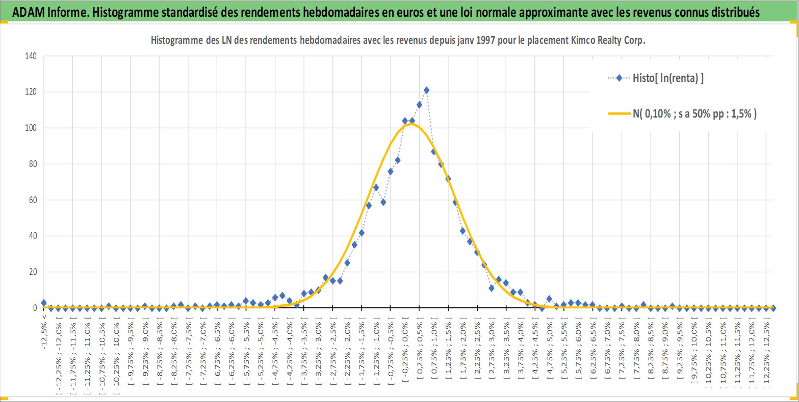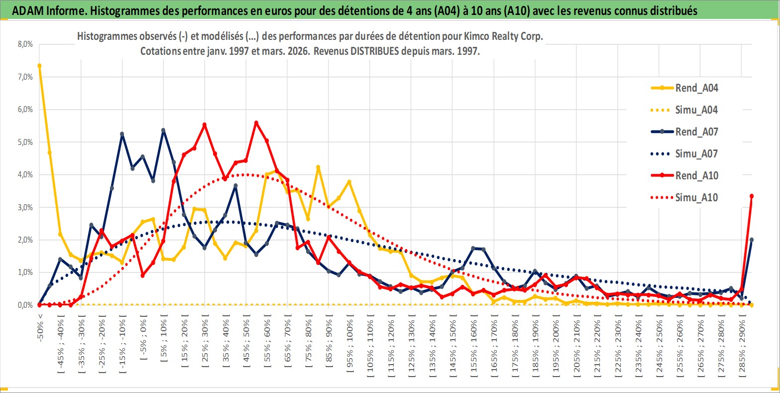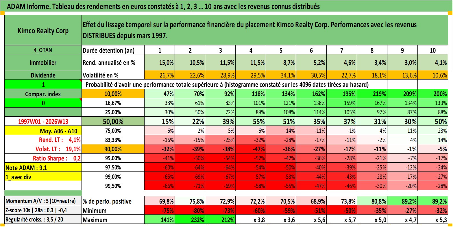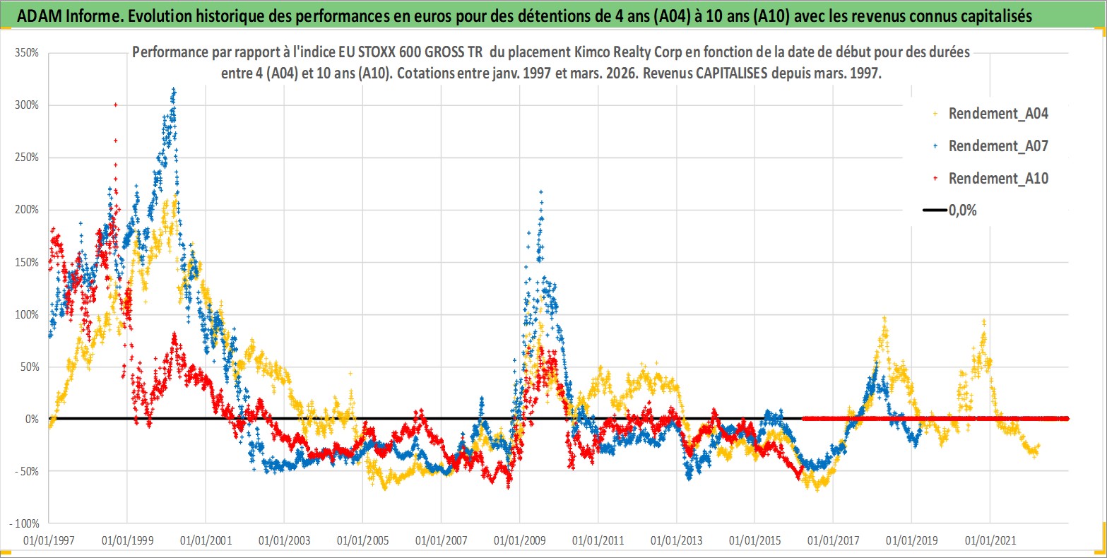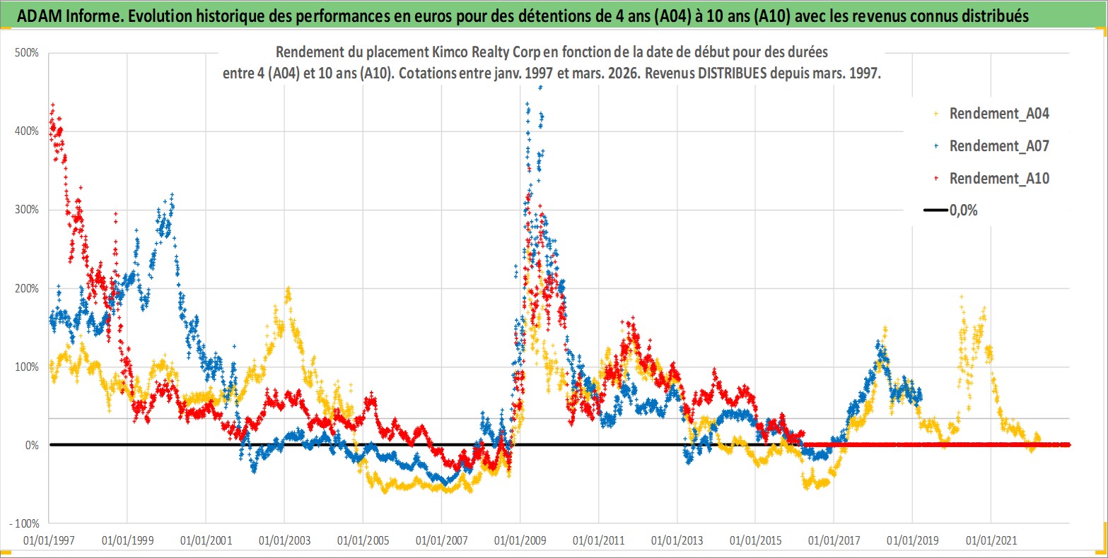 Site dédié aux investisseursPage dédiée sur site financeAnalyse des valorisations hebdomadaires de l'action Kimco Realty Corp. Cet actif est cote en USD. Les valorisations sont en contrevaleur EURO et couvrent les semaines 1997W01 a 2026W13. Les revenus de cet actif financier sont pris en compte depuis la semaine 1997W13. La note globale ESG de cet actif est estimee a 15.0 (apres rebasage entre 0 et 20).