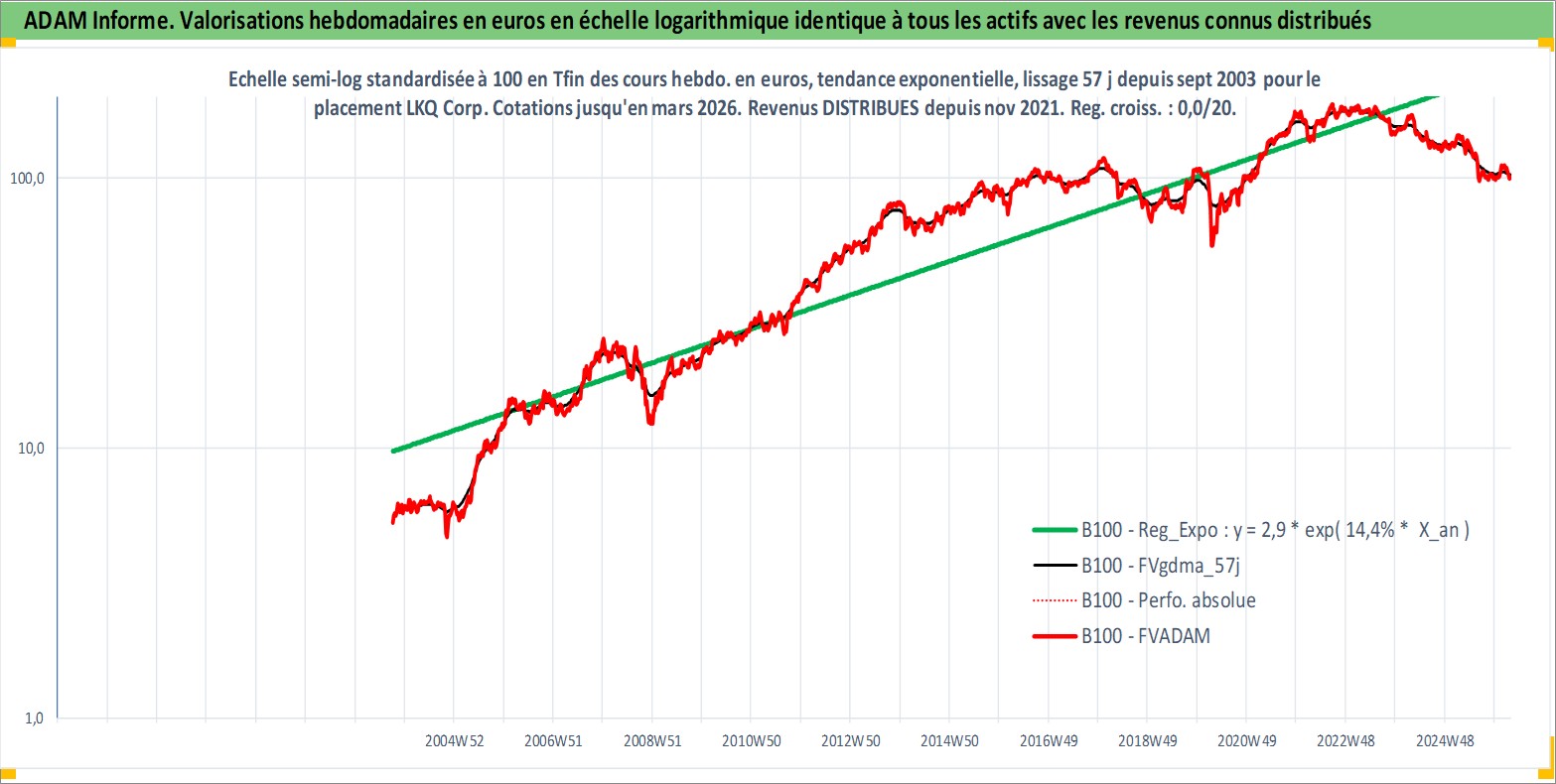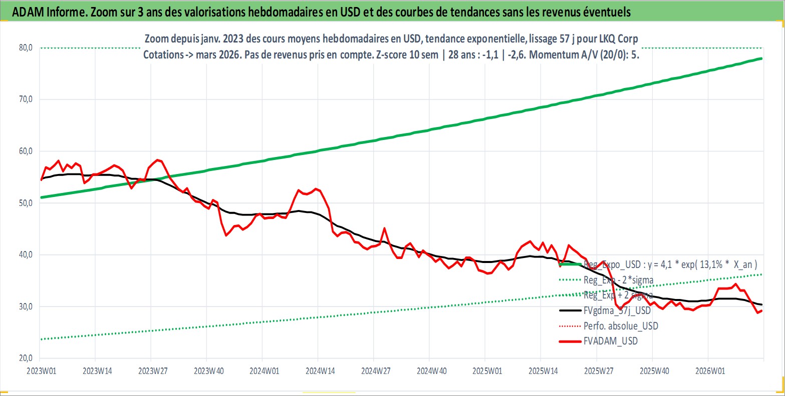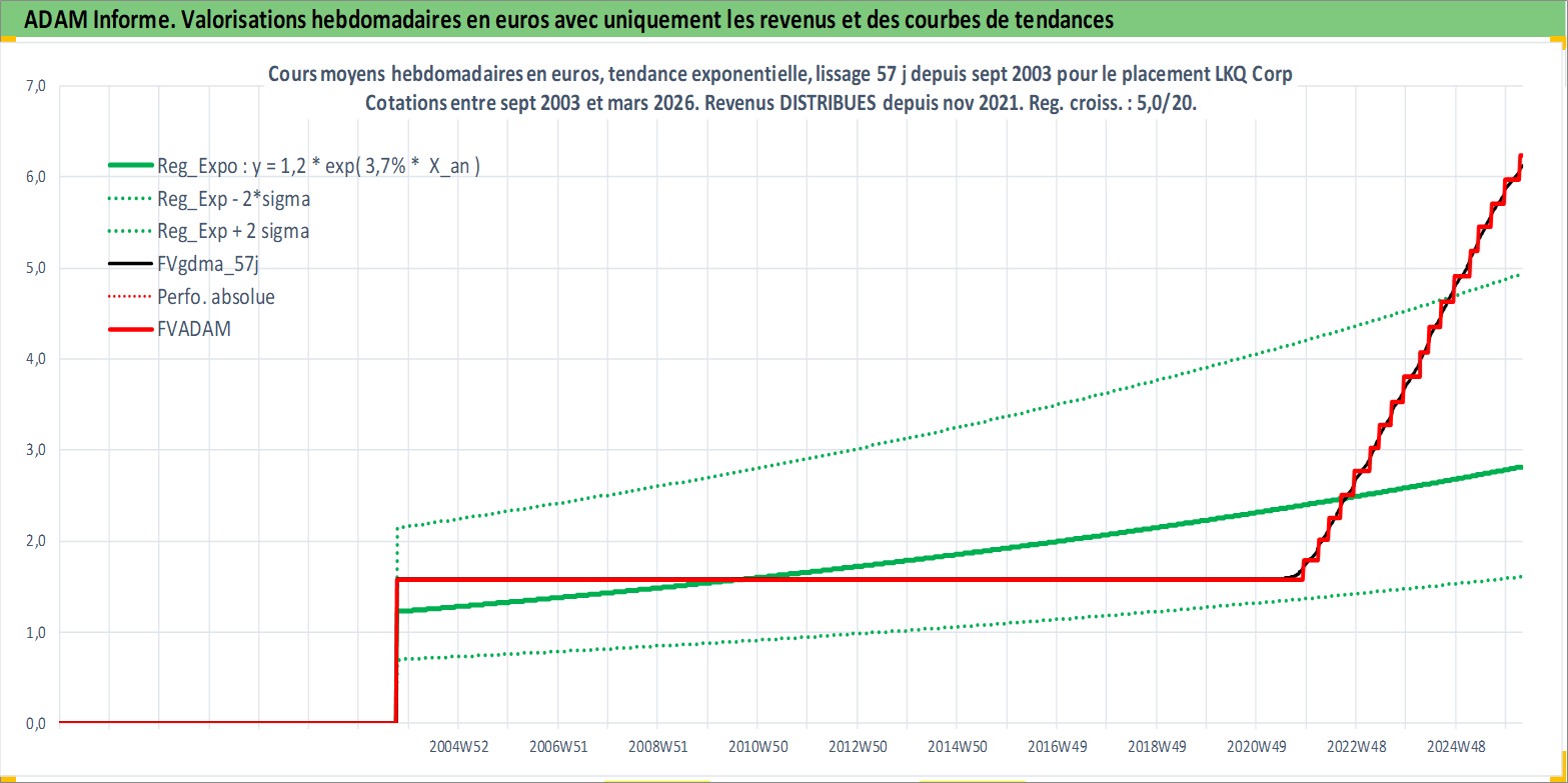 Site dédié aux investisseursPage dédiée sur site financeAnalyse des valorisations hebdomadaires de l'action LKQ Corp. Cet actif est cote en USD. Les valorisations sont en contrevaleur EURO et couvrent les semaines 2003W40 a 2026W13. Les revenus de cet actif financier sont pris en compte depuis la semaine 2021W45. La note globale ESG de cet actif est estimee a 16.0 (apres rebasage entre 0 et 20).