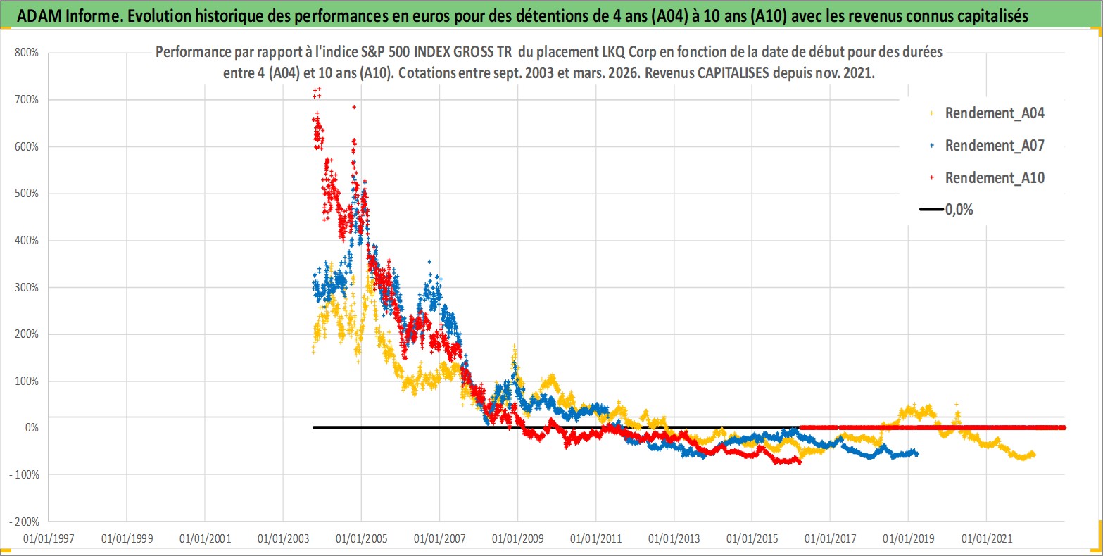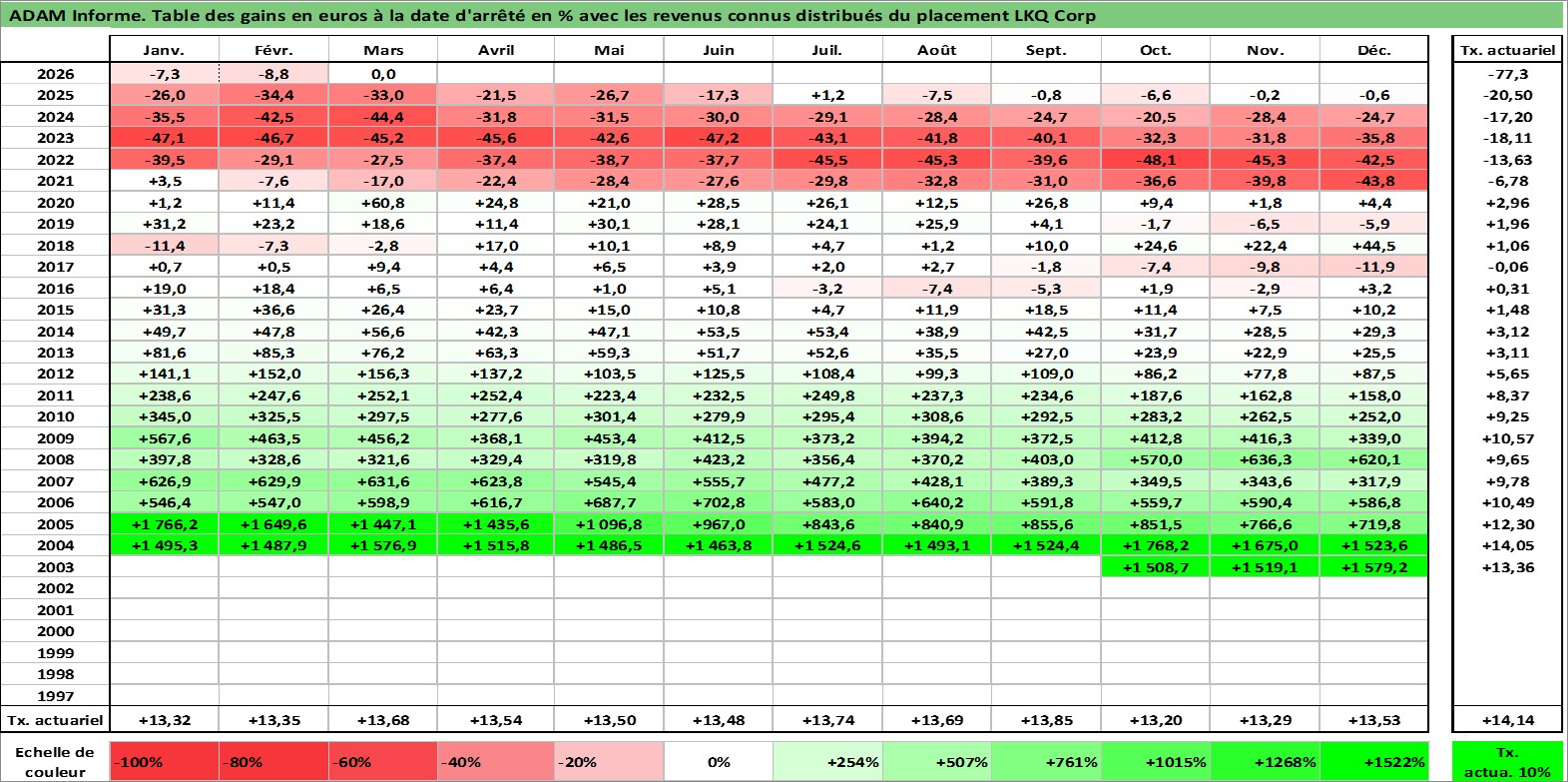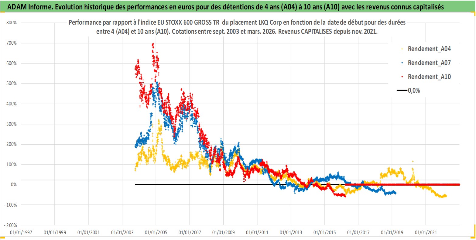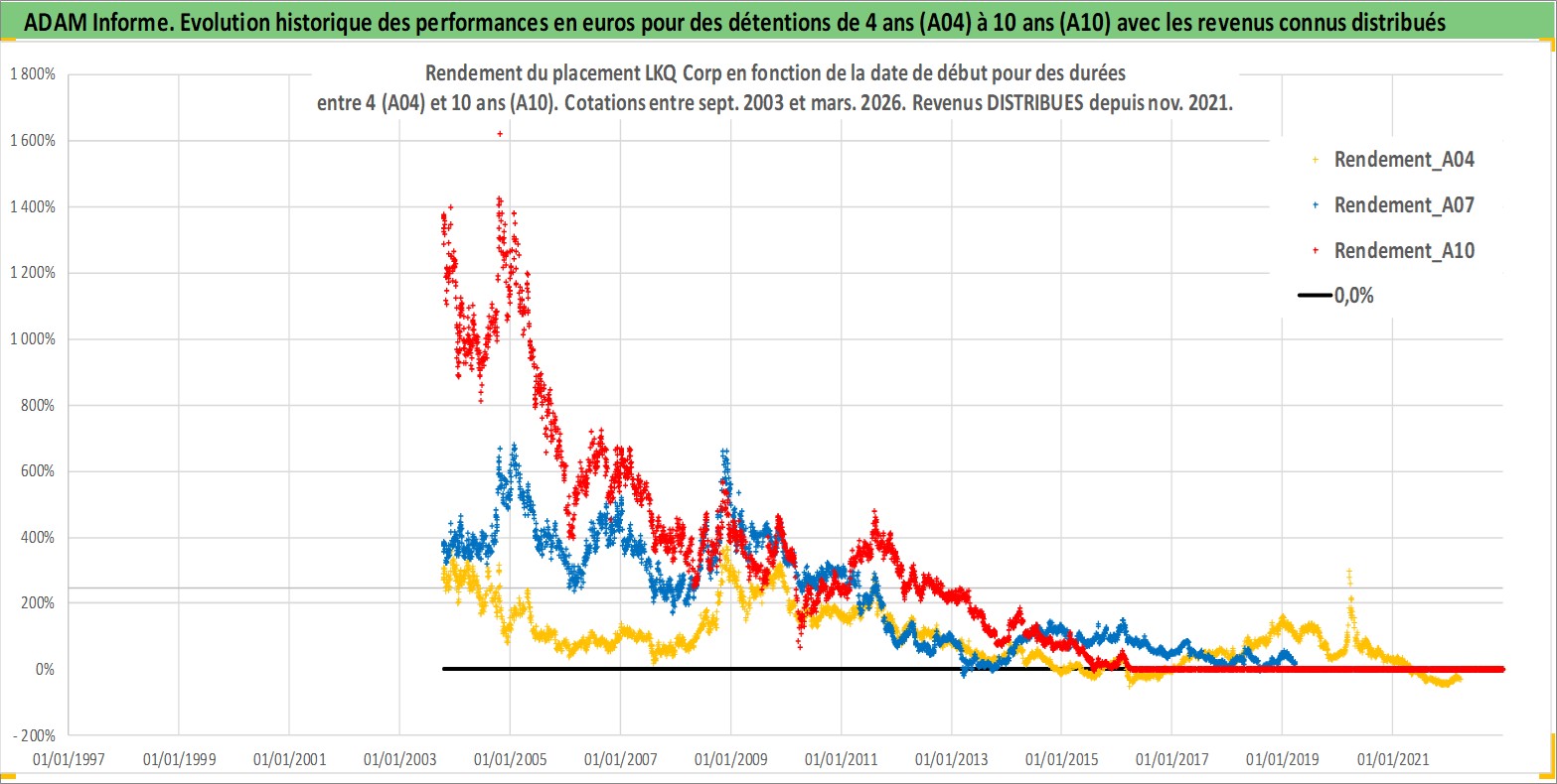 Site dédié aux investisseursPage dédiée sur site financeAnalyse des valorisations hebdomadaires de l'action LKQ Corp. Cet actif est cote en USD. Les valorisations sont en contrevaleur EURO et couvrent les semaines 2003W40 a 2026W13. Les revenus de cet actif financier sont pris en compte depuis la semaine 2021W45. La note globale ESG de cet actif est estimee a 16.0 (apres rebasage entre 0 et 20).
