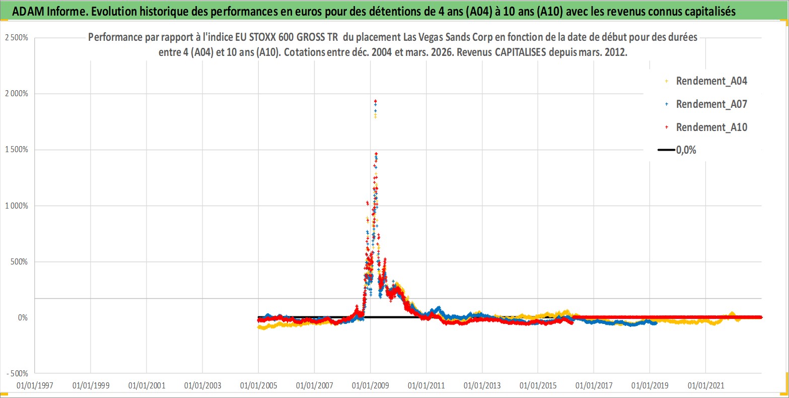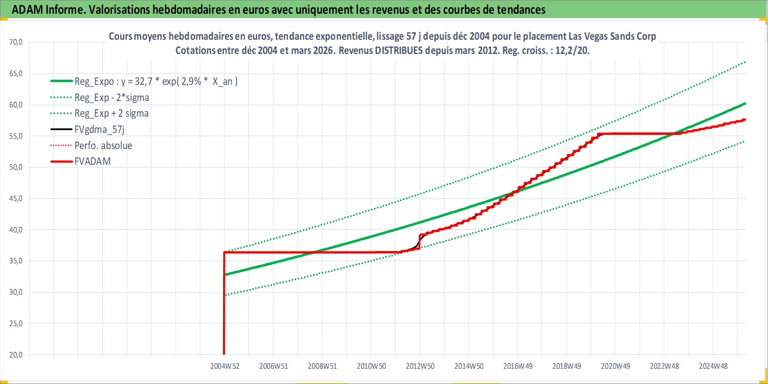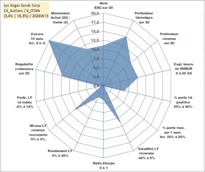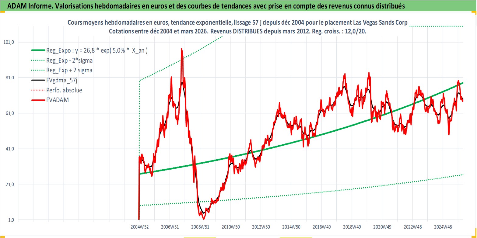 Site dédié aux investisseursPage dédiée sur site financeAnalyse des valorisations hebdomadaires de l'action Las Vegas Sands Corp. Cet actif est cote en USD. Les valorisations sont en contrevaleur EURO et couvrent les semaines 2004W51 a 2026W13. Les revenus de cet actif financier sont pris en compte depuis la semaine 2012W11. La note globale ESG de cet actif est estimee a 11.0 (apres rebasage entre 0 et 20).