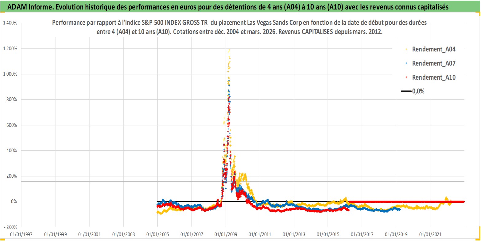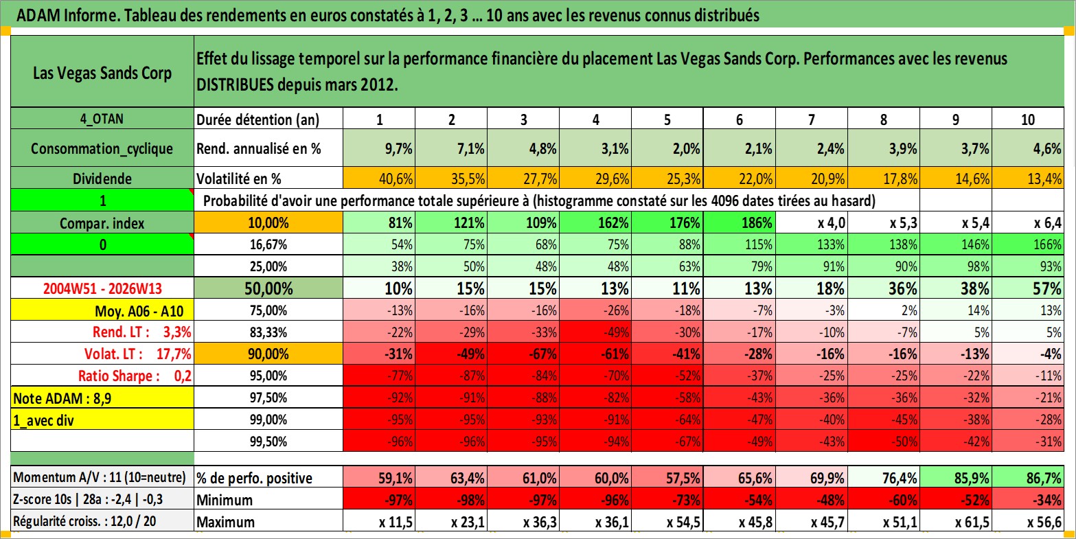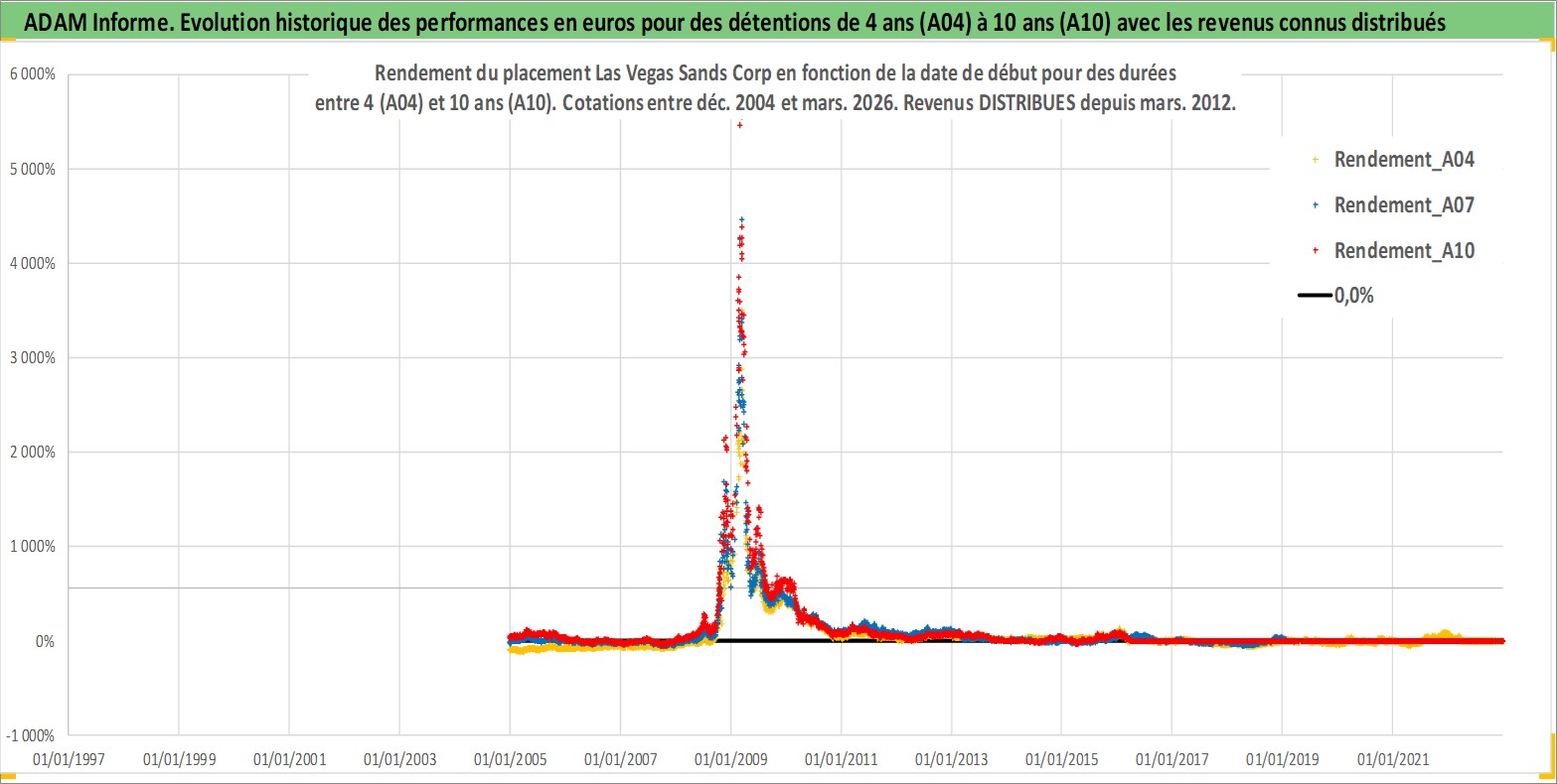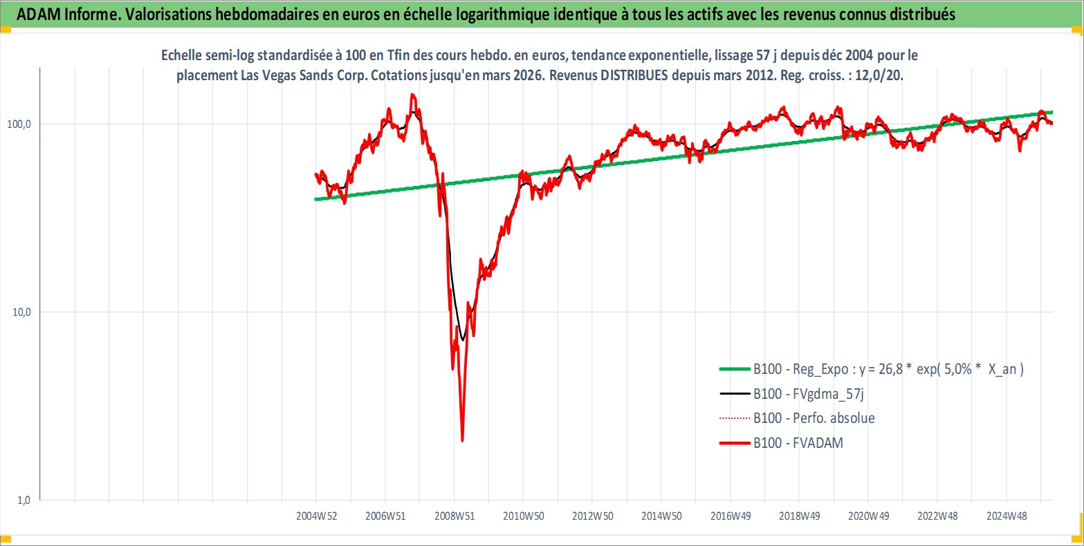 Site dédié aux investisseursPage dédiée sur site financeAnalyse des valorisations hebdomadaires de l'action Las Vegas Sands Corp. Cet actif est cote en USD. Les valorisations sont en contrevaleur EURO et couvrent les semaines 2004W51 a 2026W13. Les revenus de cet actif financier sont pris en compte depuis la semaine 2012W11. La note globale ESG de cet actif est estimee a 11.0 (apres rebasage entre 0 et 20).