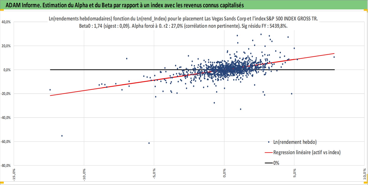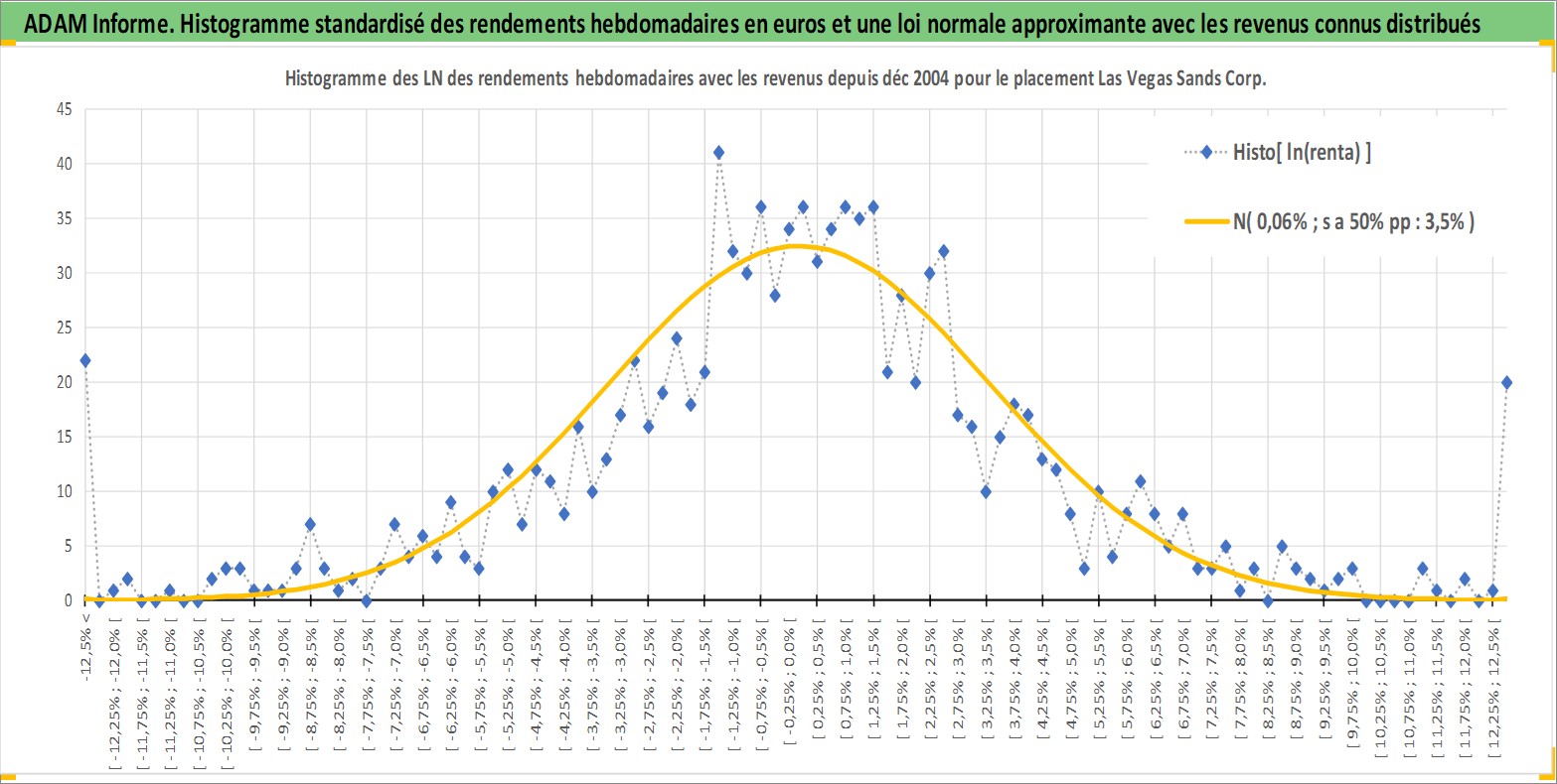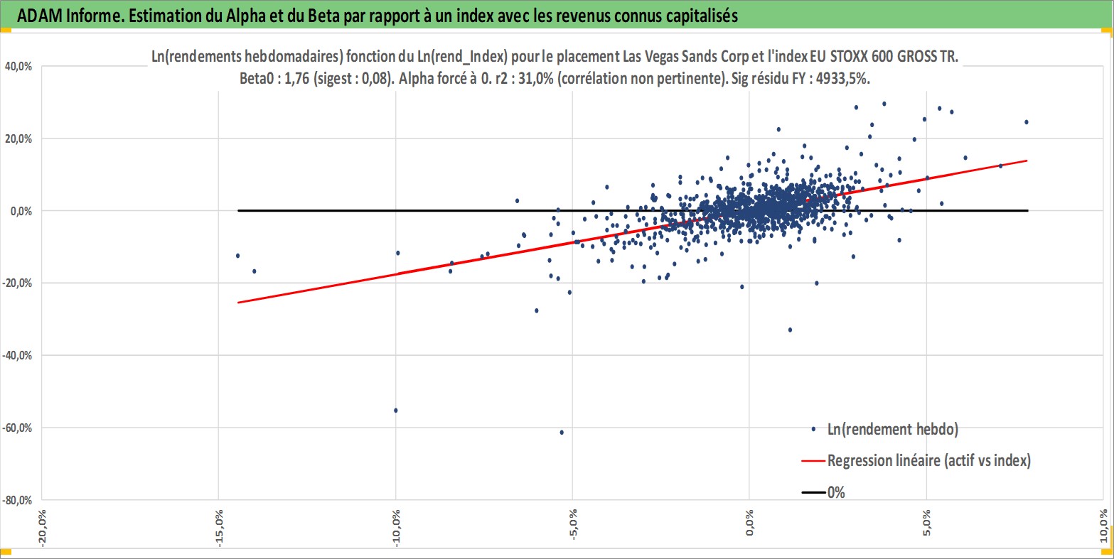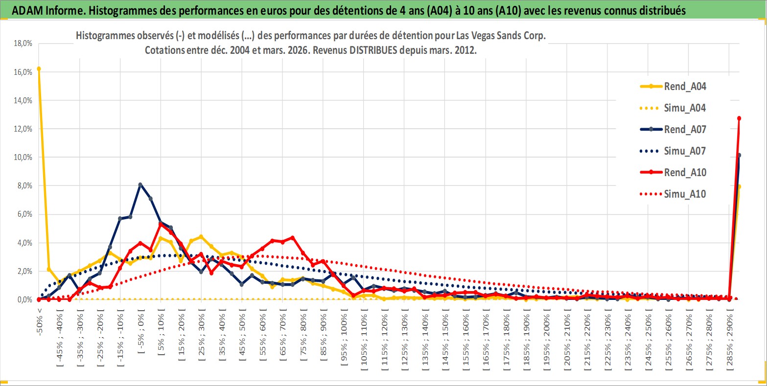 Site dédié aux investisseursPage dédiée sur site financeAnalyse des valorisations hebdomadaires de l'action Las Vegas Sands Corp. Cet actif est cote en USD. Les valorisations sont en contrevaleur EURO et couvrent les semaines 2004W51 a 2026W13. Les revenus de cet actif financier sont pris en compte depuis la semaine 2012W11. La note globale ESG de cet actif est estimee a 11.0 (apres rebasage entre 0 et 20).