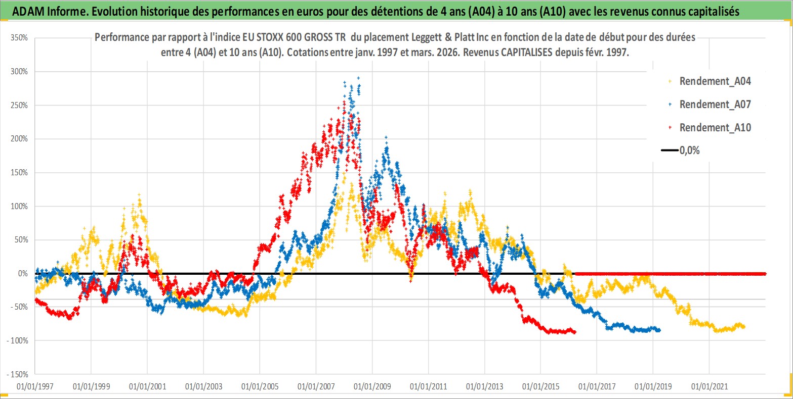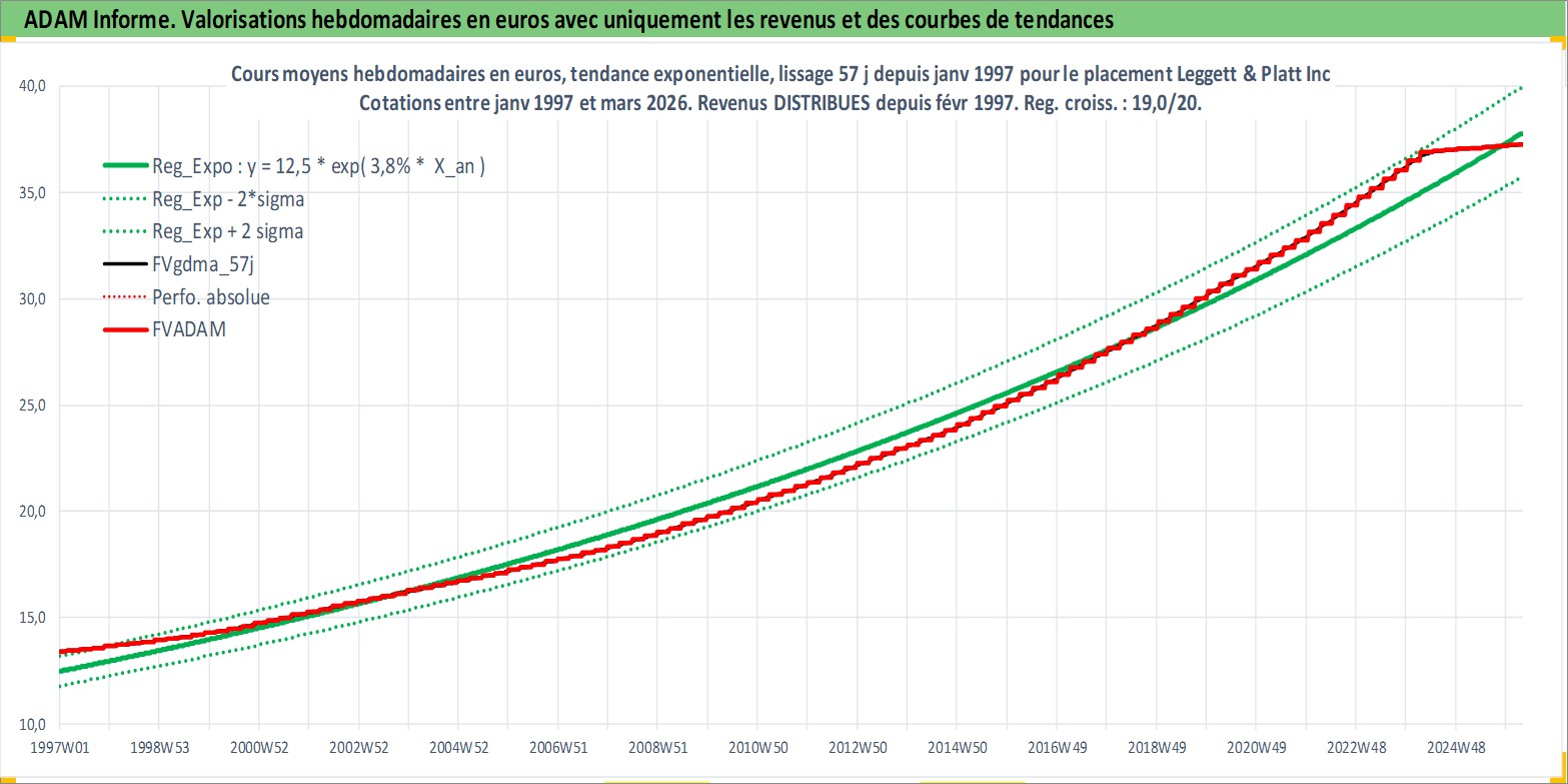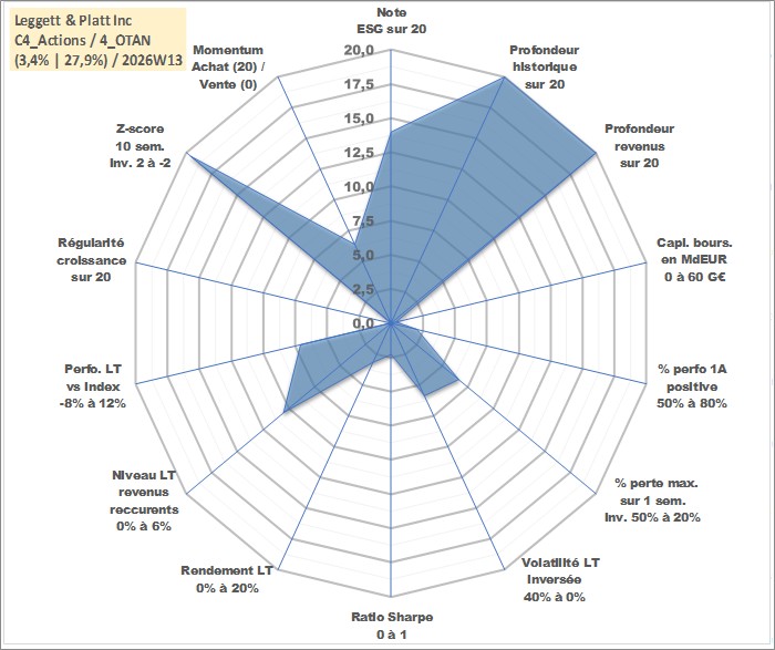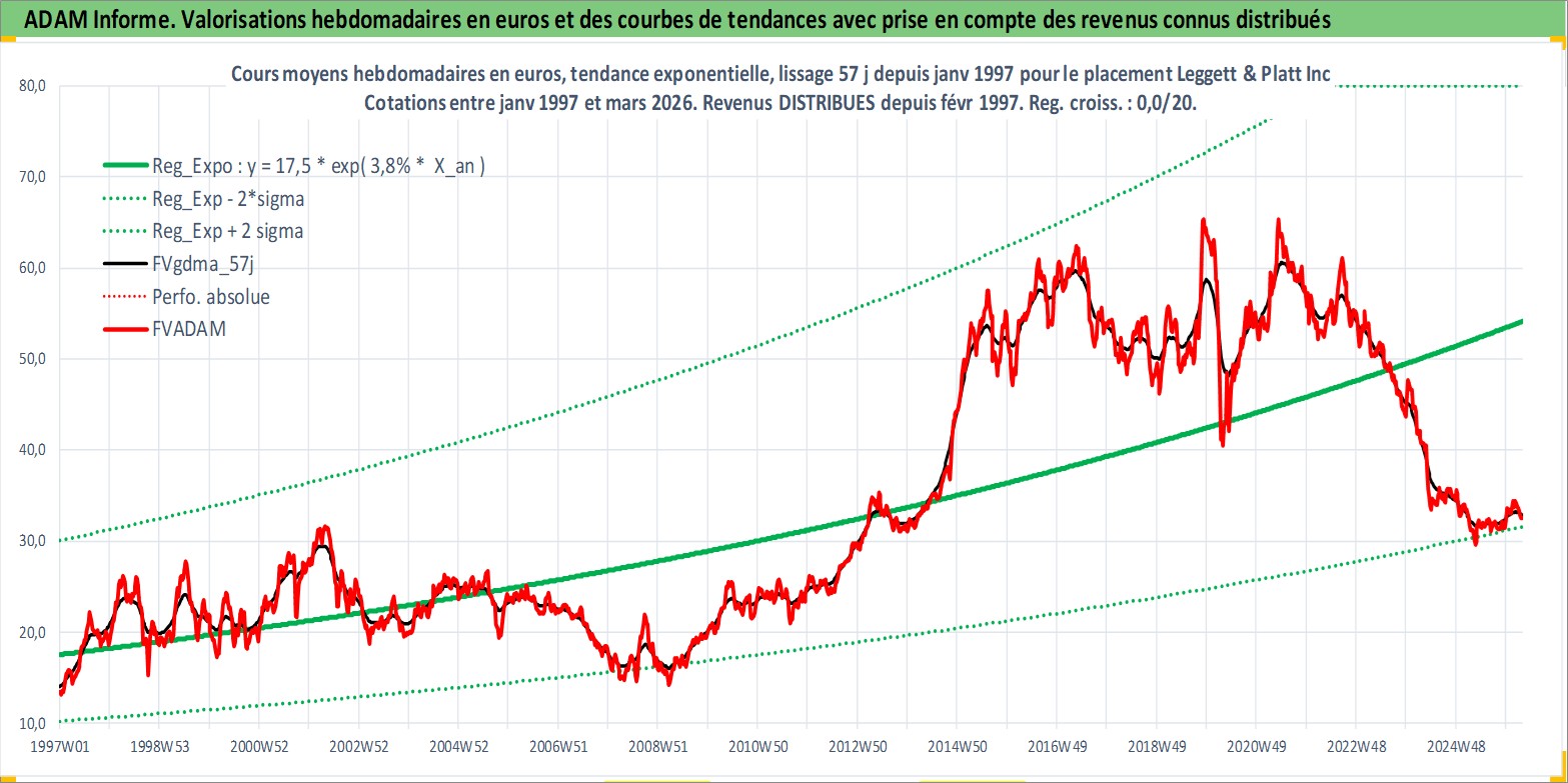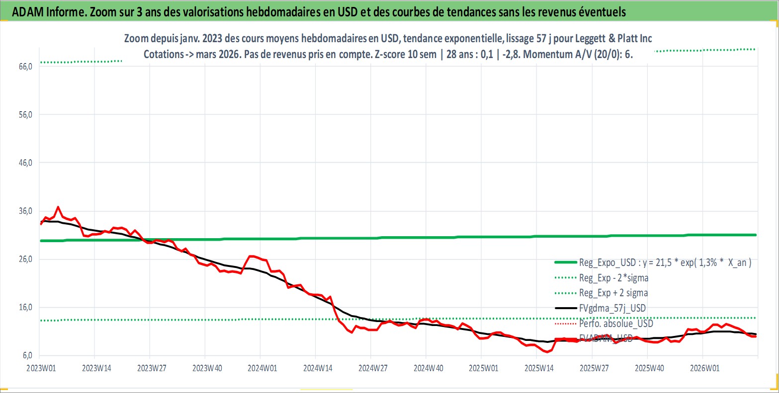 Site dédié aux investisseursPage dédiée sur site financeAnalyse des valorisations hebdomadaires de l'action Leggett & Platt Inc. Cet actif est cote en USD. Les valorisations sont en contrevaleur EURO et couvrent les semaines 1997W01 a 2026W13. Les revenus de cet actif financier sont pris en compte depuis la semaine 1997W08. La note globale ESG de cet actif est estimee a 14.0 (apres rebasage entre 0 et 20).