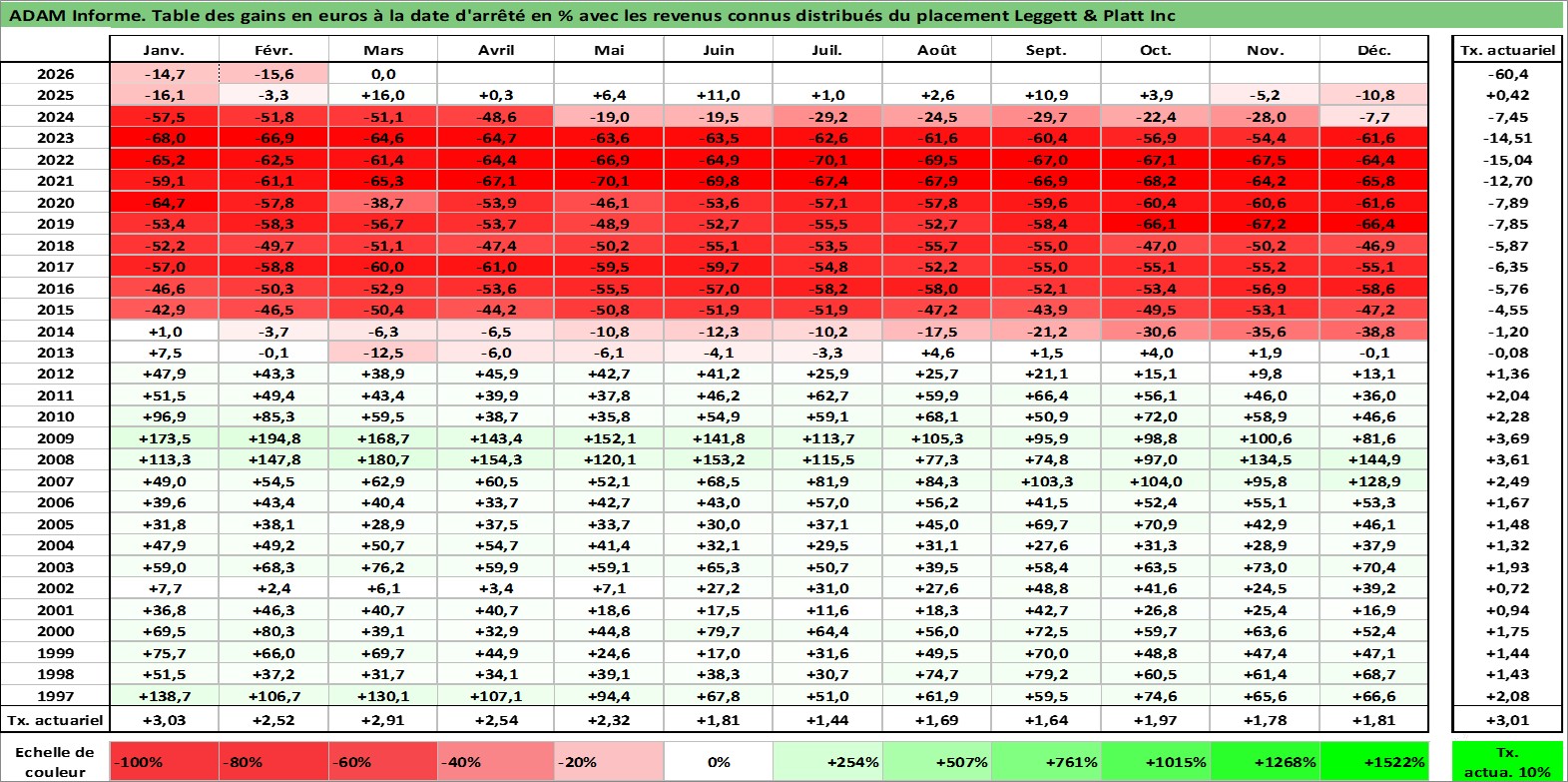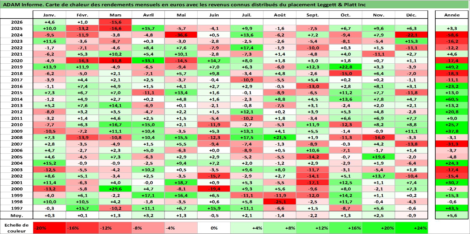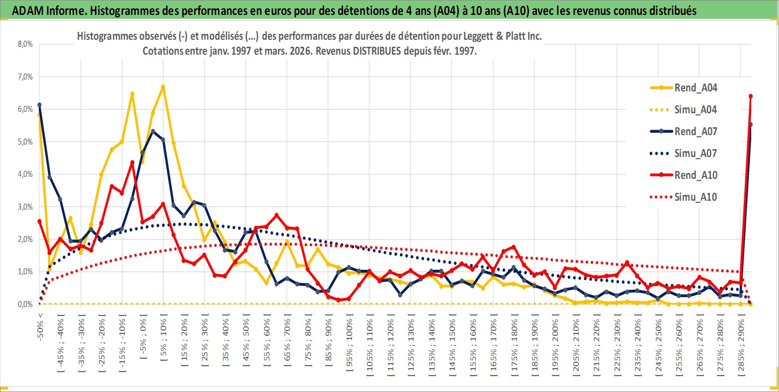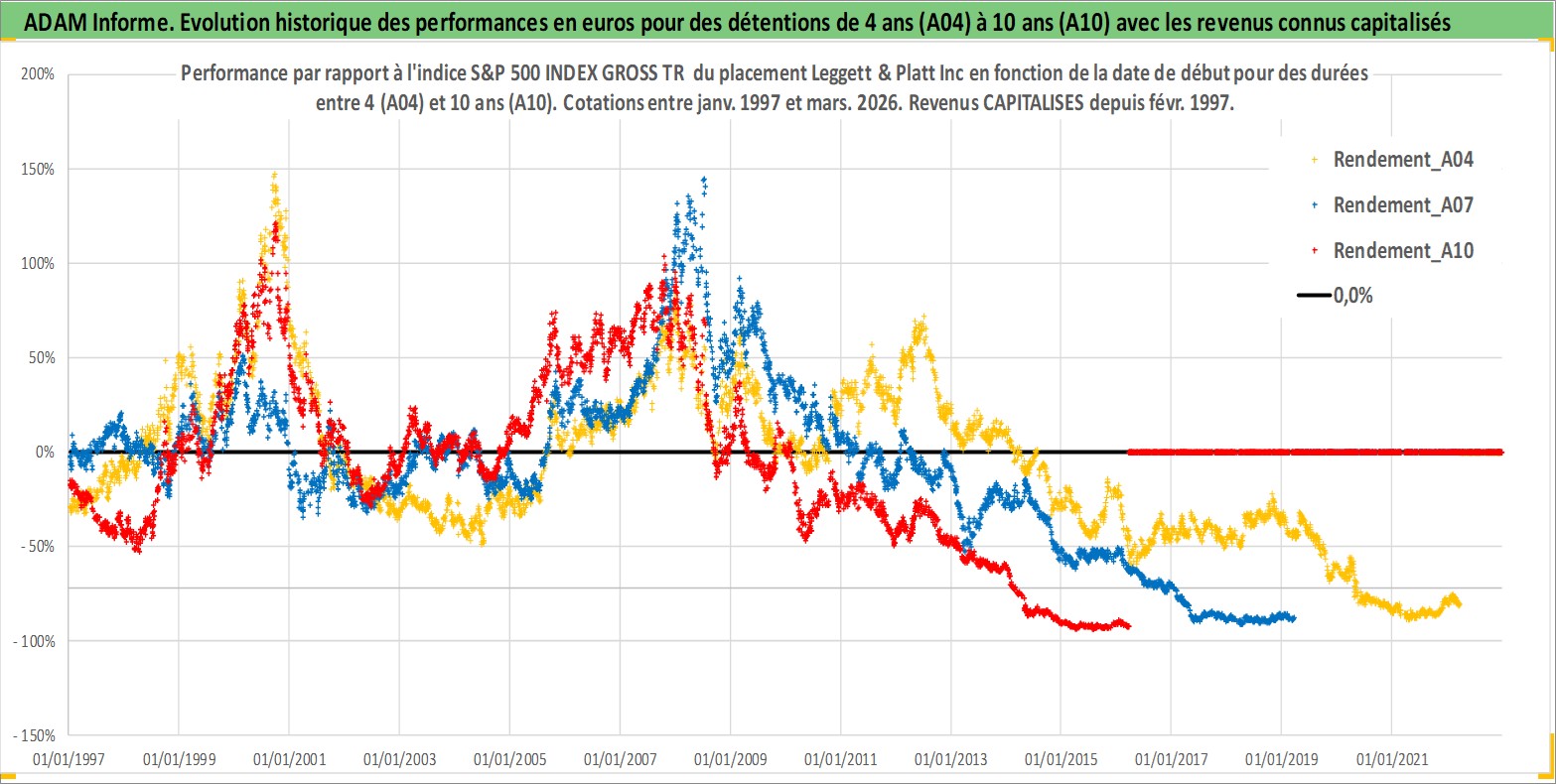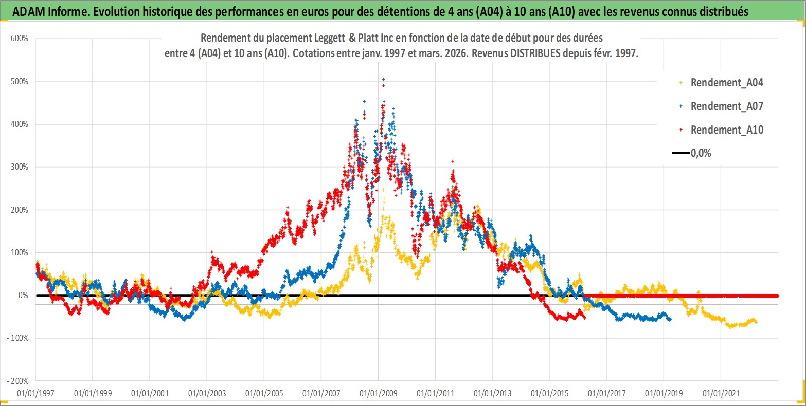 Site dédié aux investisseursPage dédiée sur site financeAnalyse des valorisations hebdomadaires de l'action Leggett & Platt Inc. Cet actif est cote en USD. Les valorisations sont en contrevaleur EURO et couvrent les semaines 1997W01 a 2026W13. Les revenus de cet actif financier sont pris en compte depuis la semaine 1997W08. La note globale ESG de cet actif est estimee a 14.0 (apres rebasage entre 0 et 20).