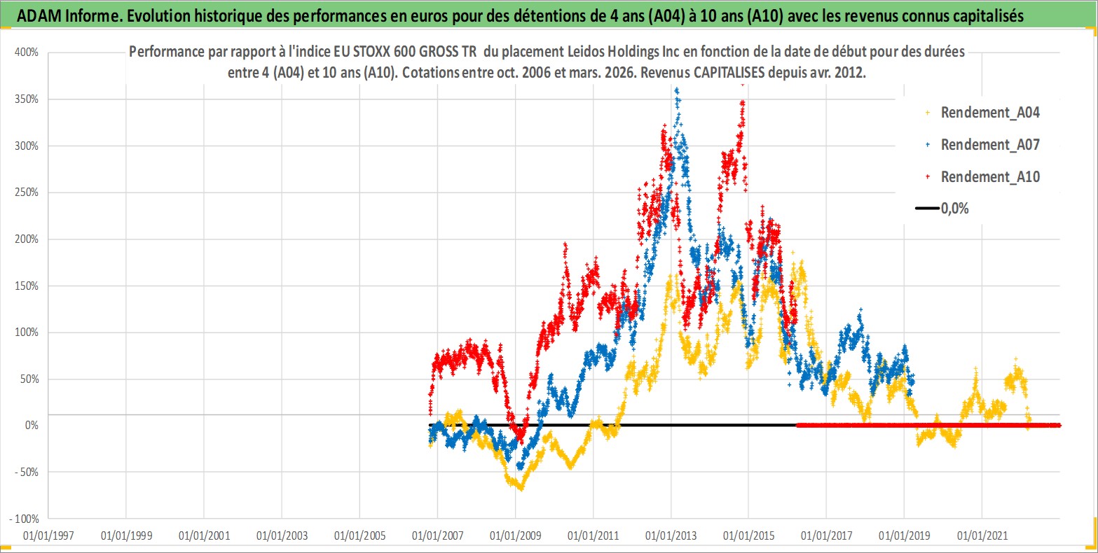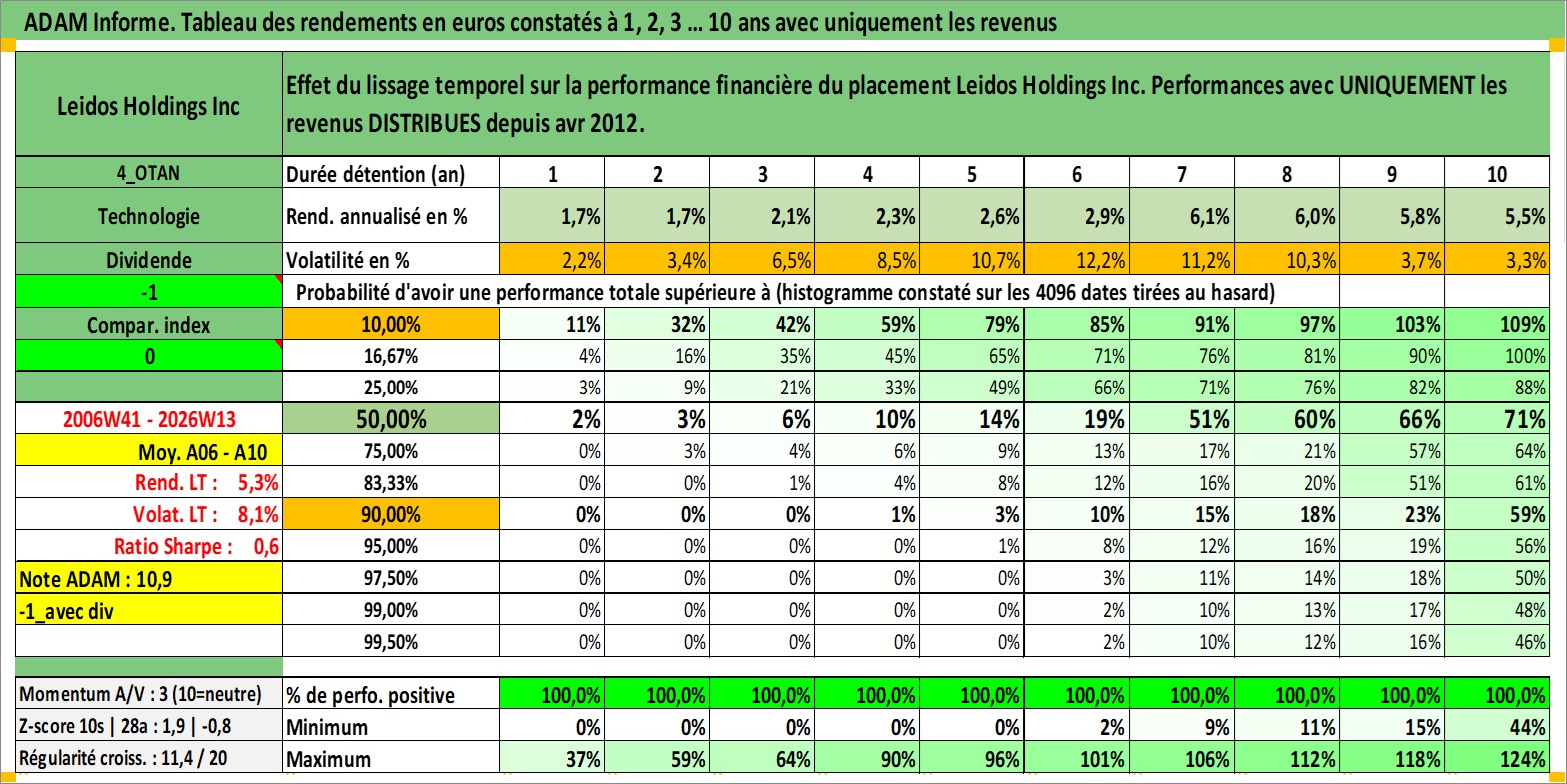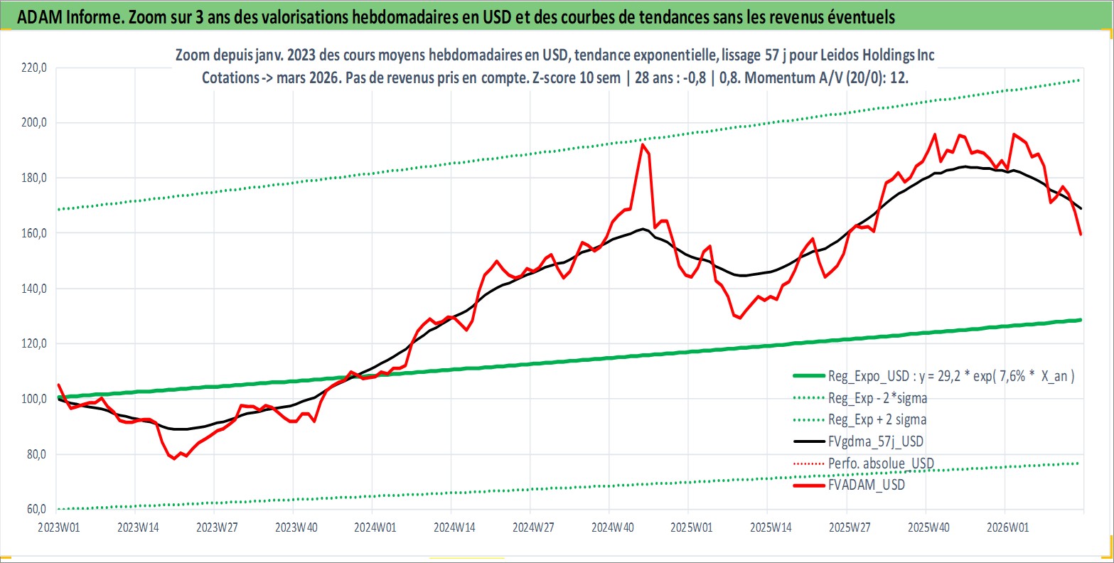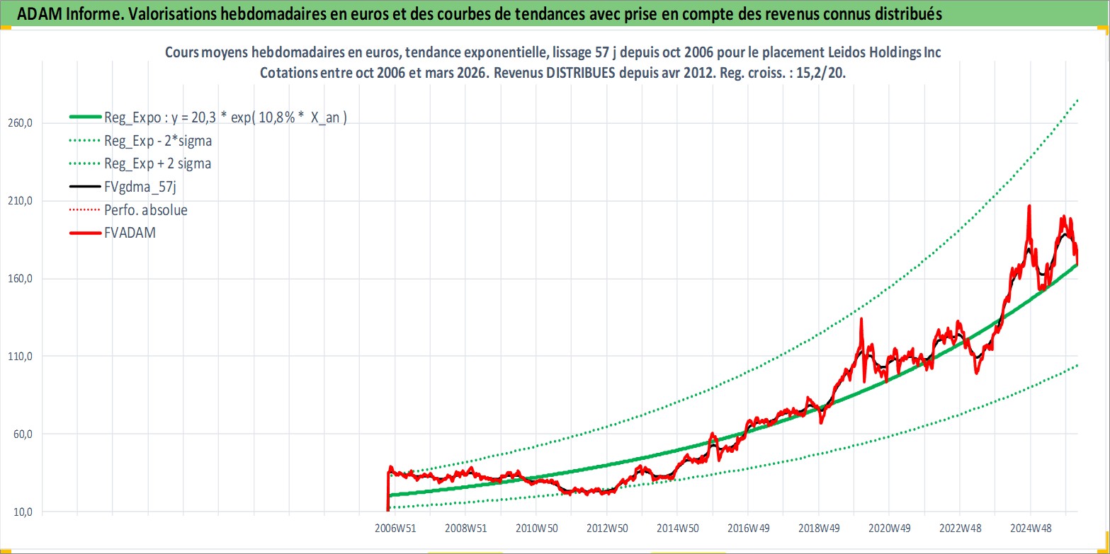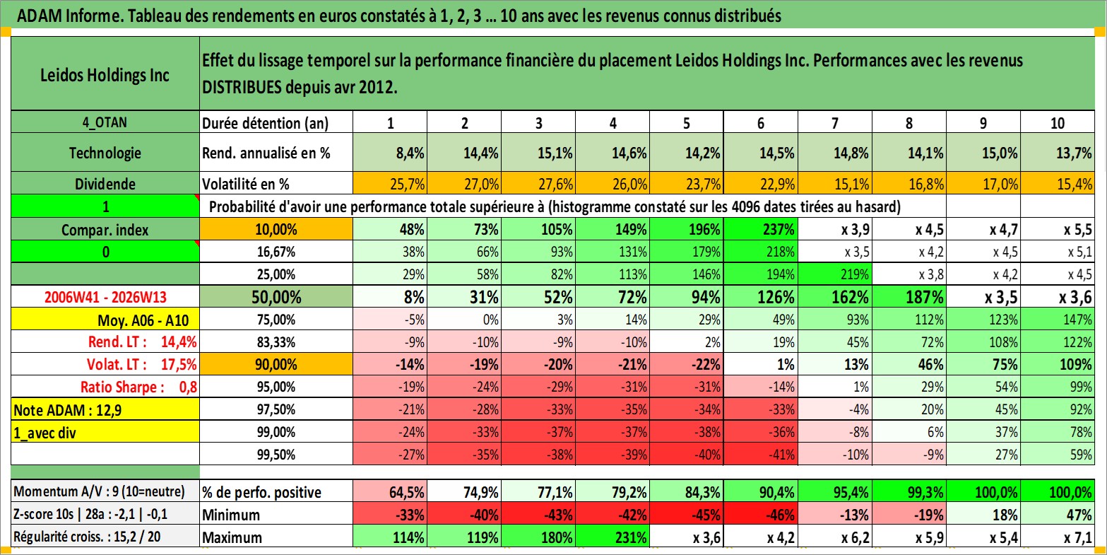 Site dédié aux investisseursPage dédiée sur site financeAnalyse des valorisations hebdomadaires de l'action Leidos Holdings Inc. Cet actif est cote en USD. Les valorisations sont en contrevaleur EURO et couvrent les semaines 2006W41 a 2026W13. Les revenus de cet actif financier sont pris en compte depuis la semaine 2012W15. La note globale ESG de cet actif est estimee a 15.0 (apres rebasage entre 0 et 20).