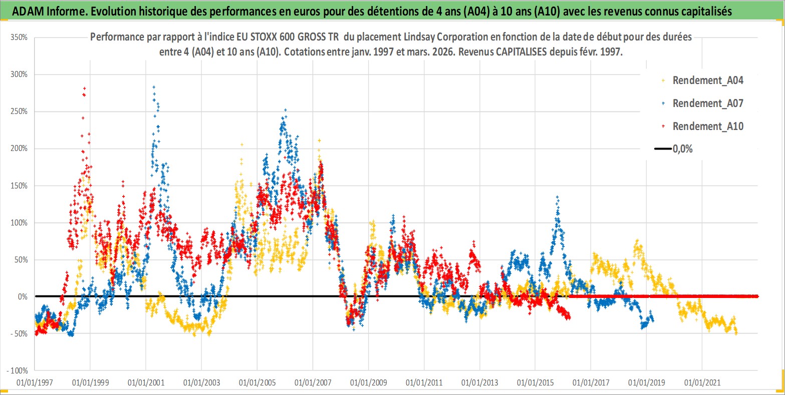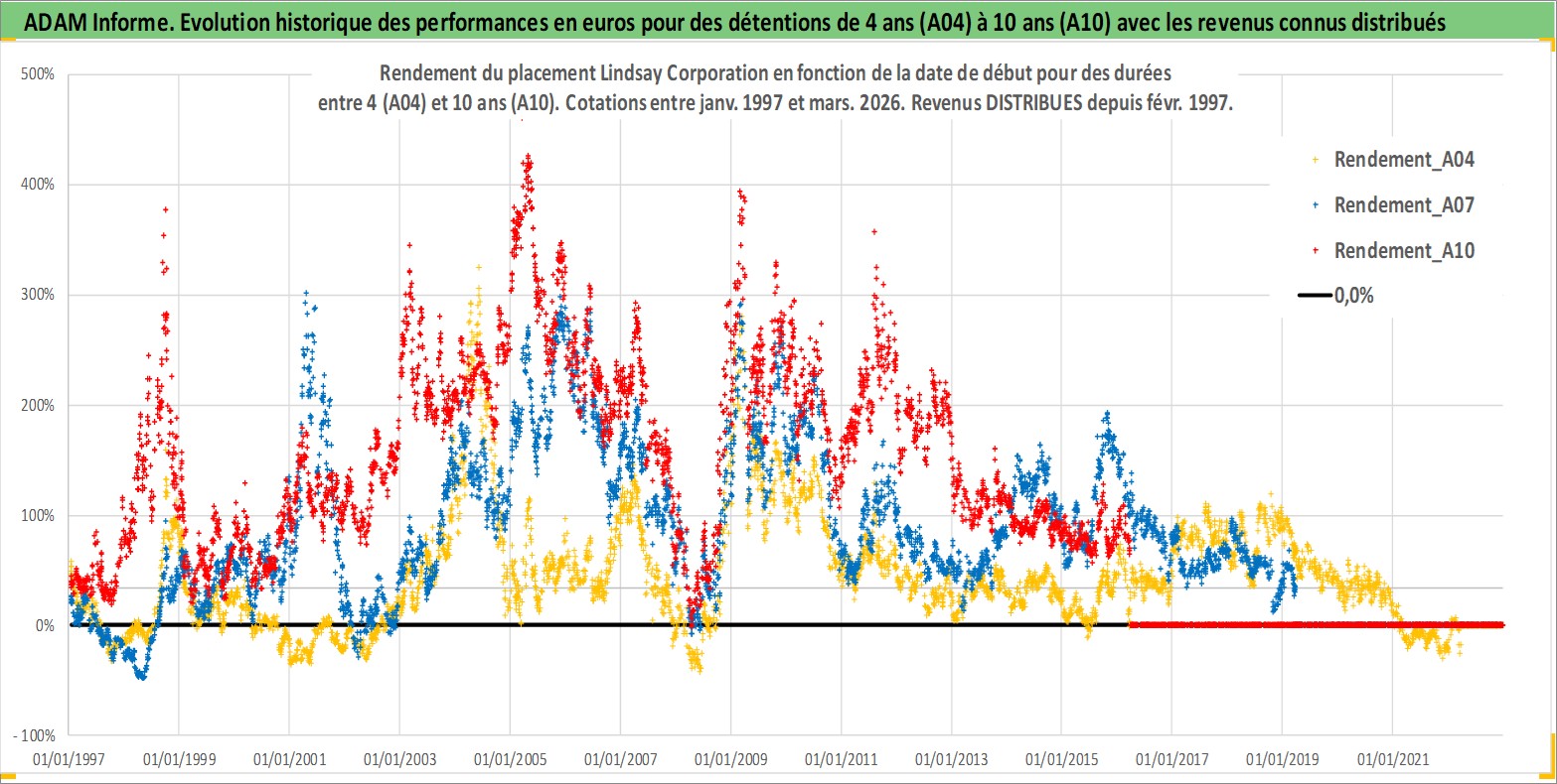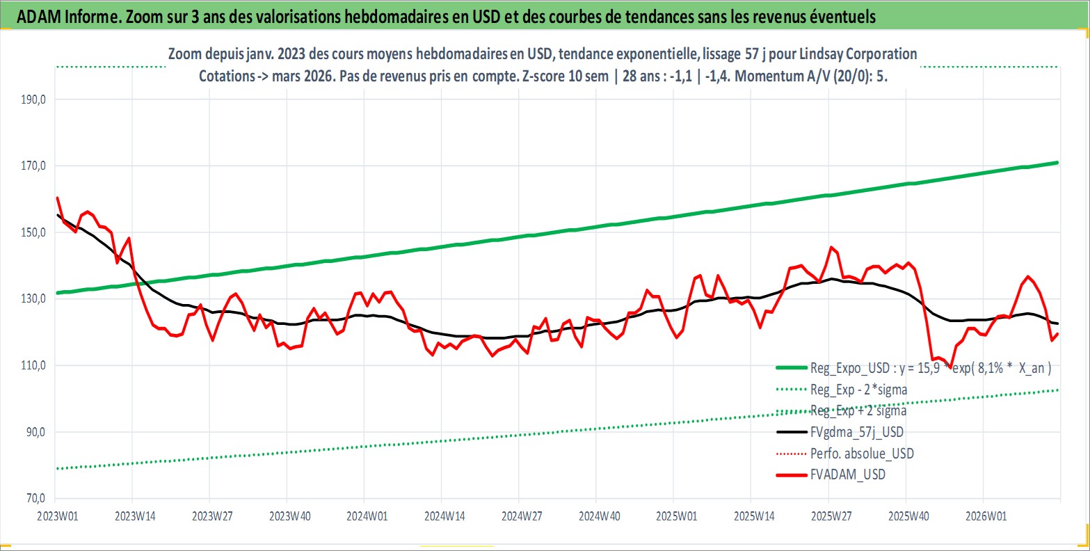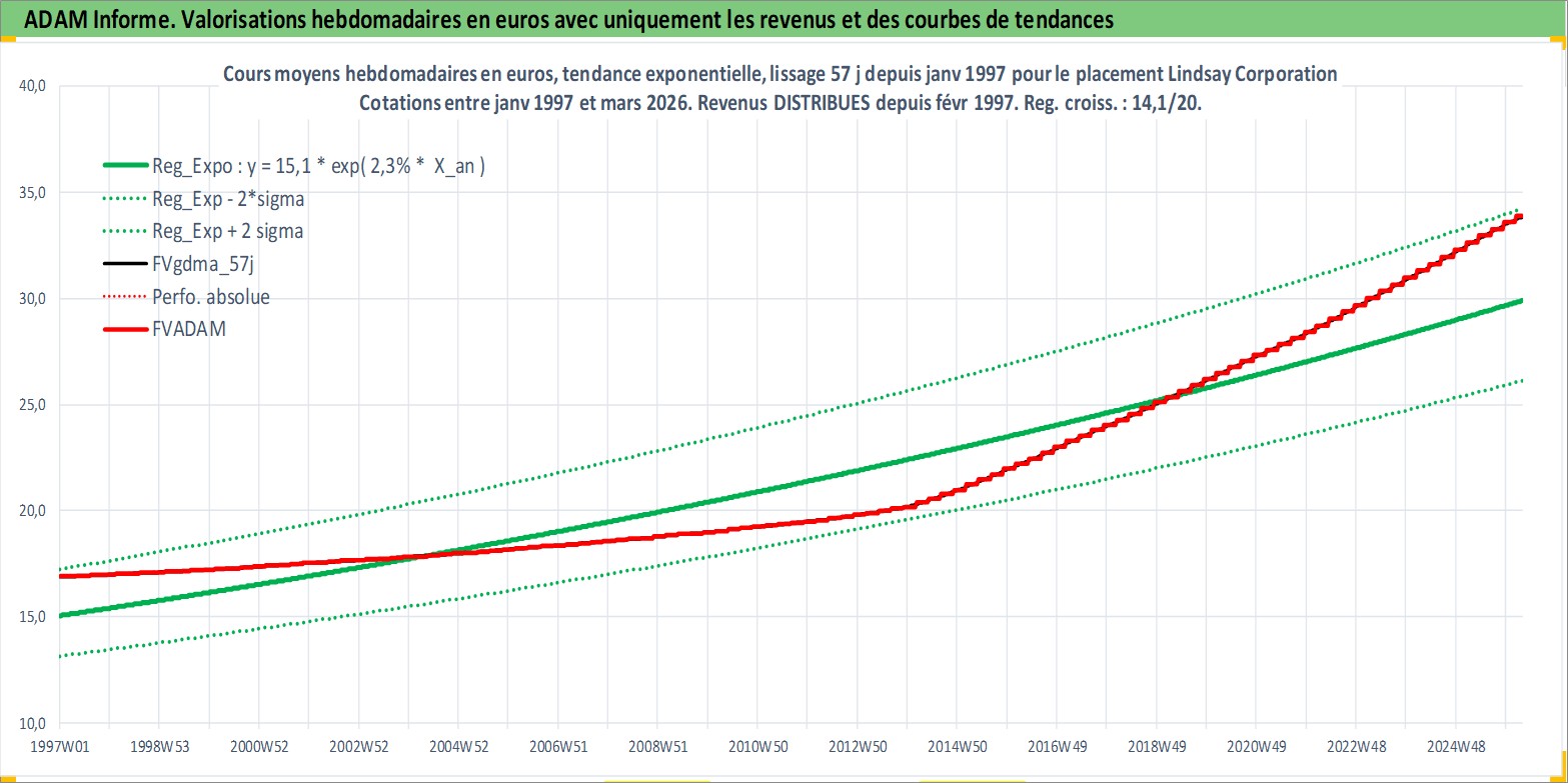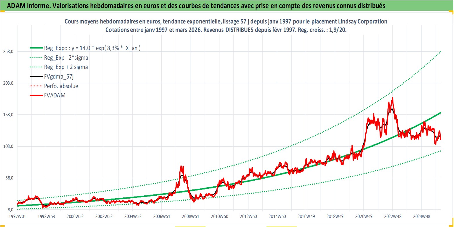 Site dédié aux investisseursPage dédiée sur site financeAnalyse des valorisations hebdomadaires de l'action Lindsay Corporation. Cet actif est cote en USD. Les valorisations sont en contrevaleur EURO et couvrent les semaines 1997W01 a 2026W13. Les revenus de cet actif financier sont pris en compte depuis la semaine 1997W07. La note ESG de cet actif n'est pas connue.