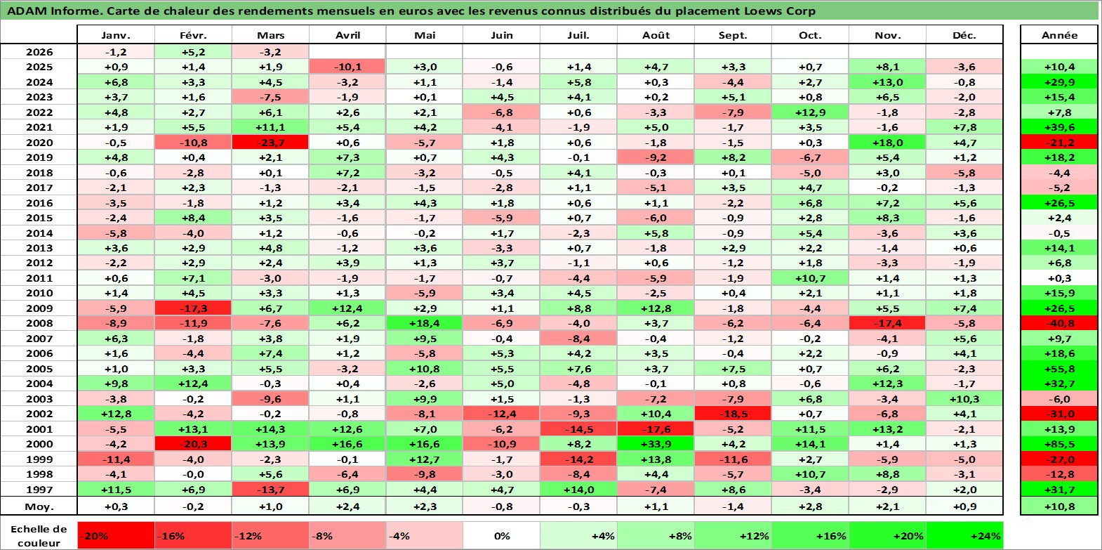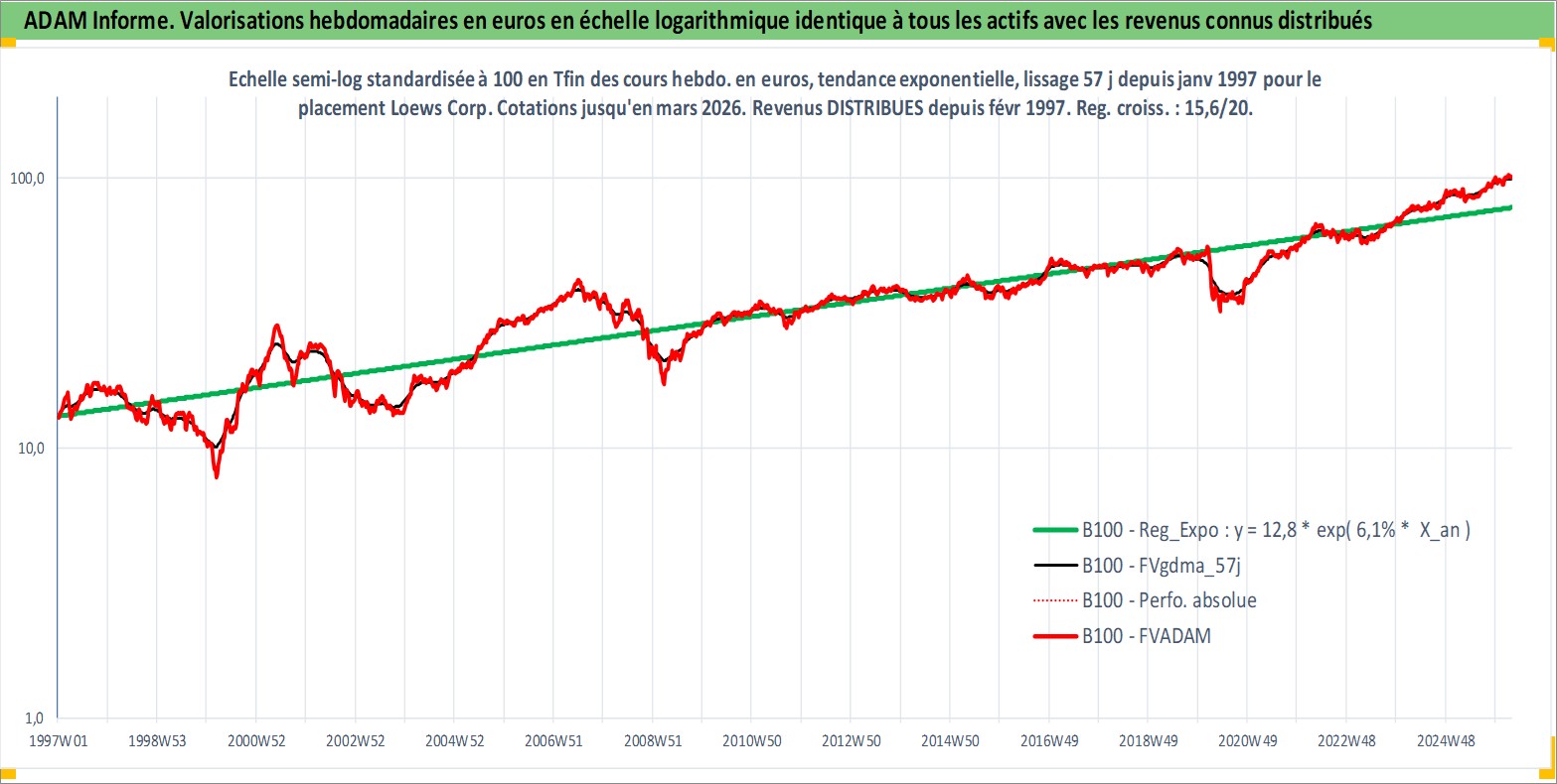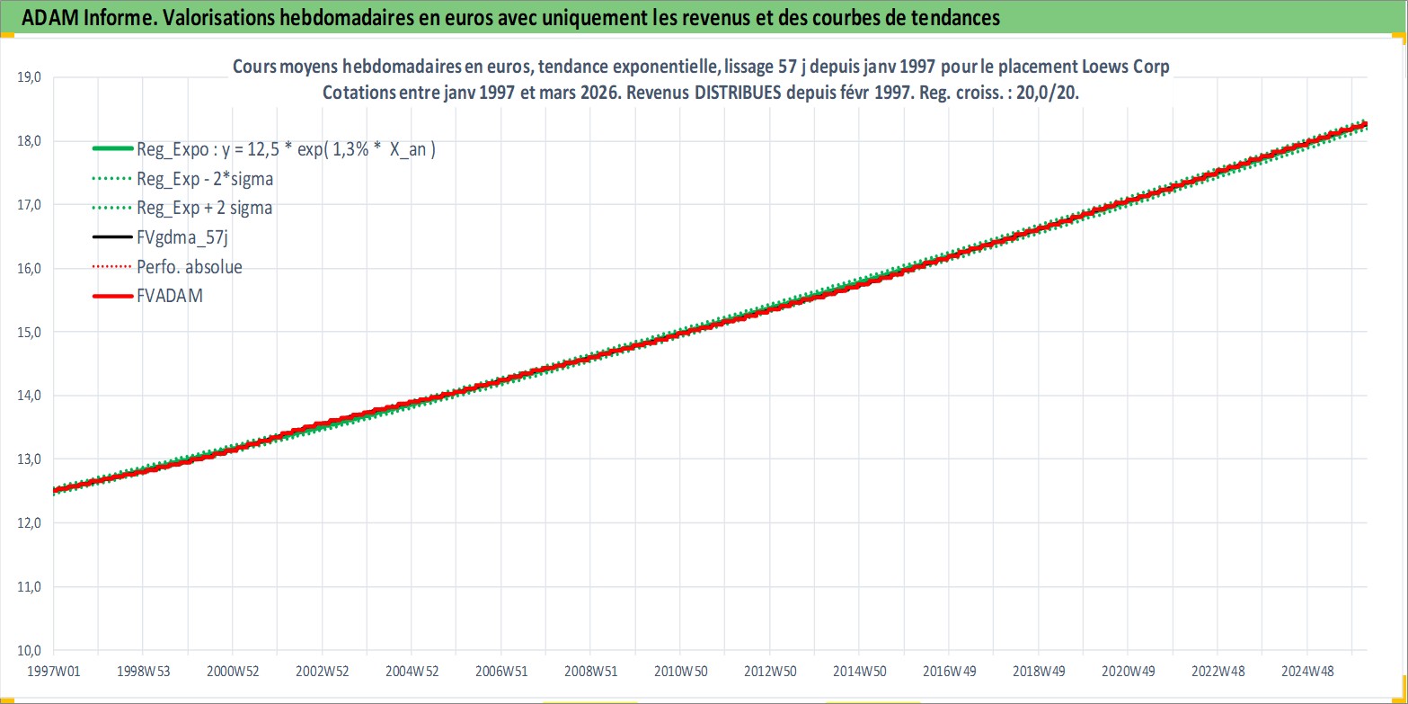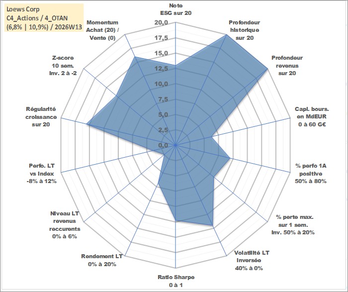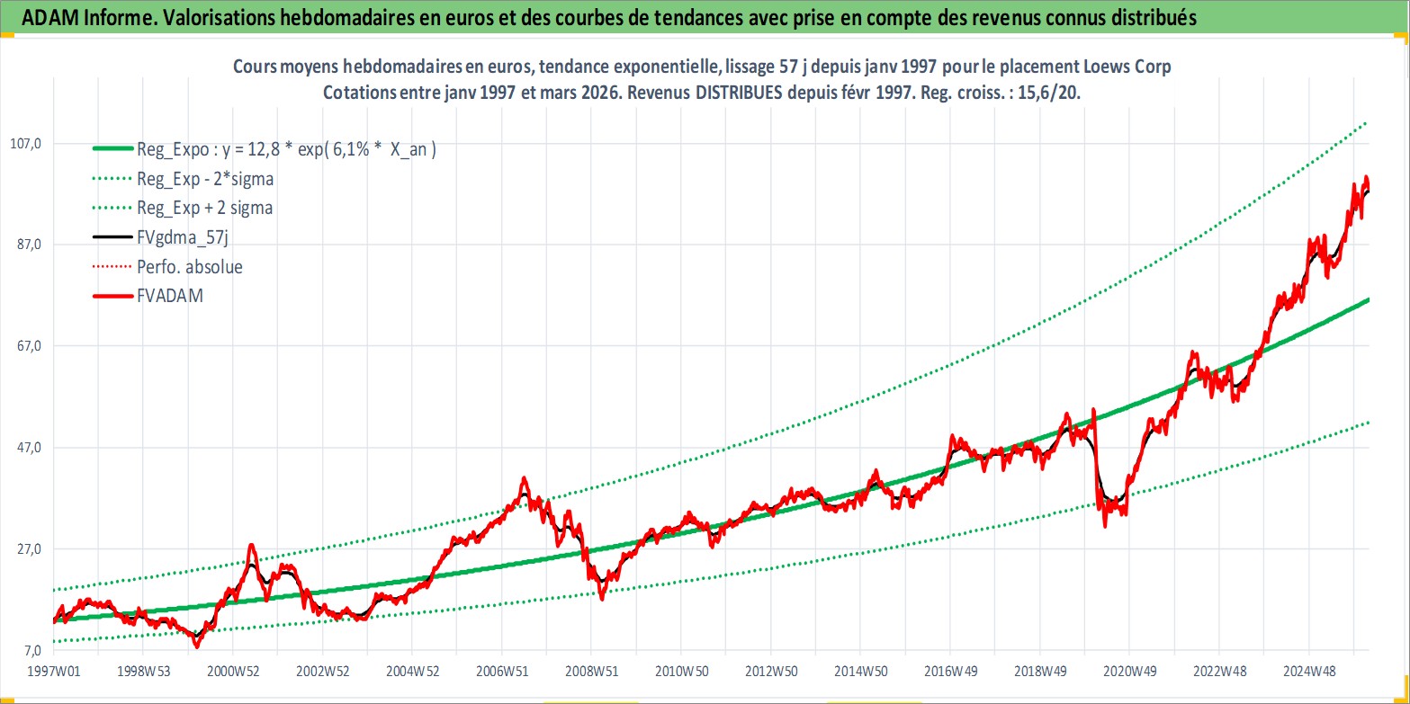 Site dédié aux investisseursPage dédiée sur site financeAnalyse des valorisations hebdomadaires de l'action Loews Corp. Cet actif est cote en USD. Les valorisations sont en contrevaleur EURO et couvrent les semaines 1997W01 a 2026W13. Les revenus de cet actif financier sont pris en compte depuis la semaine 1997W06. La note globale ESG de cet actif est estimee a 13.0 (apres rebasage entre 0 et 20).