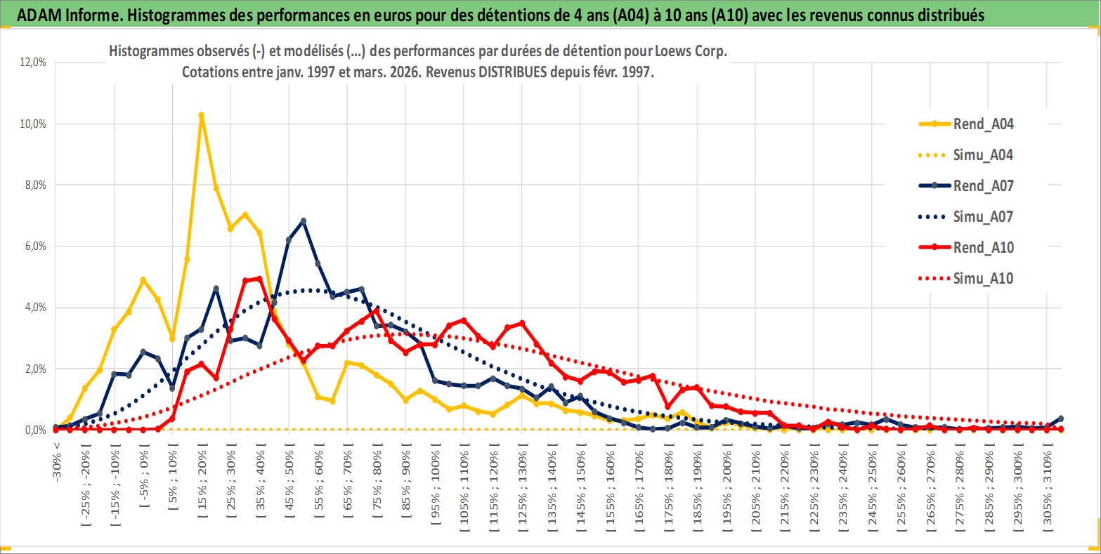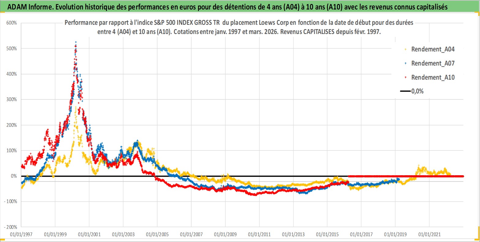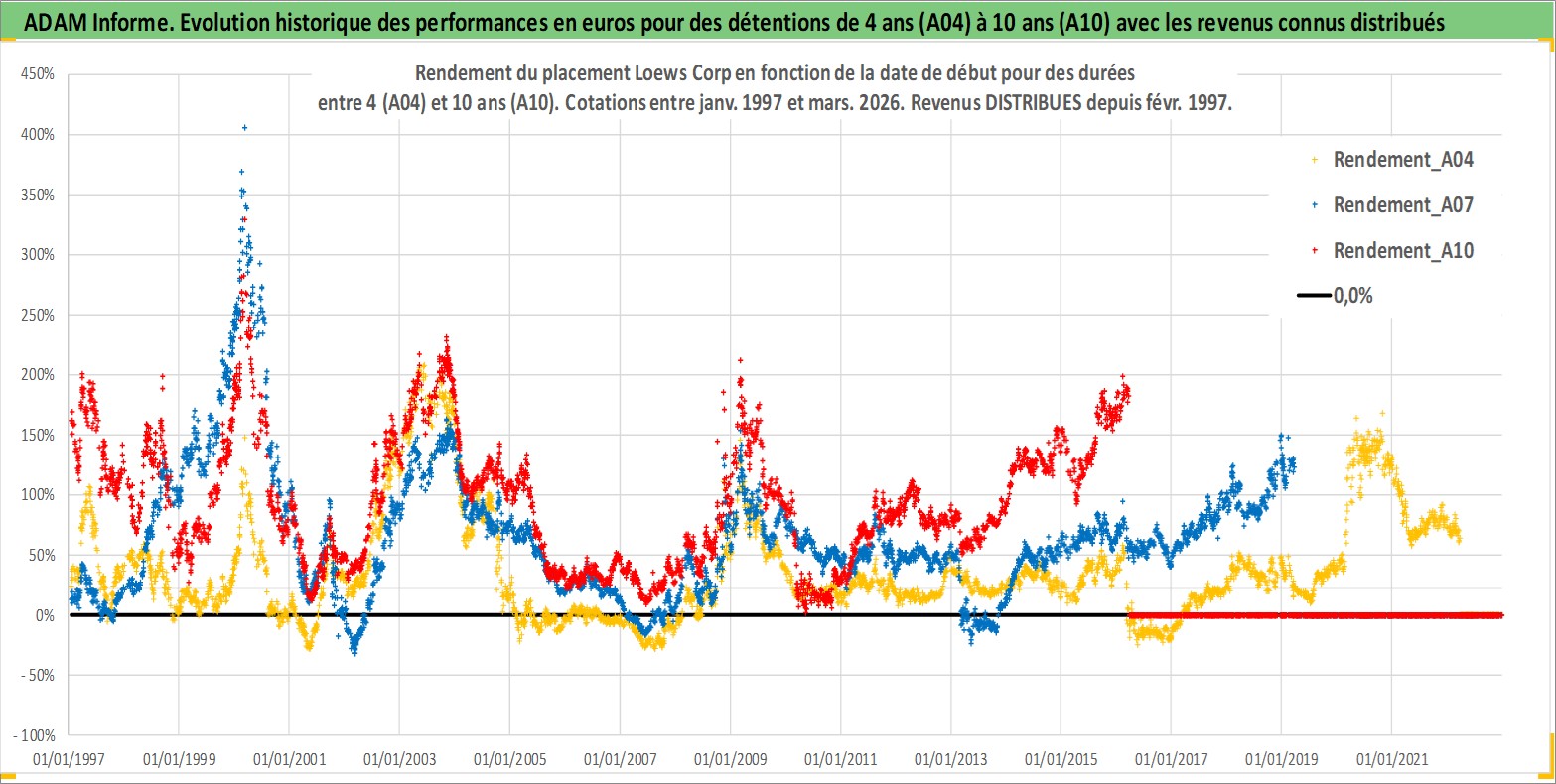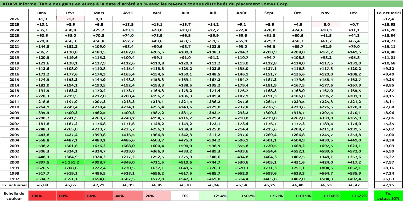 Site dédié aux investisseursPage dédiée sur site financeAnalyse des valorisations hebdomadaires de l'action Loews Corp. Cet actif est cote en USD. Les valorisations sont en contrevaleur EURO et couvrent les semaines 1997W01 a 2026W13. Les revenus de cet actif financier sont pris en compte depuis la semaine 1997W06. La note globale ESG de cet actif est estimee a 13.0 (apres rebasage entre 0 et 20).