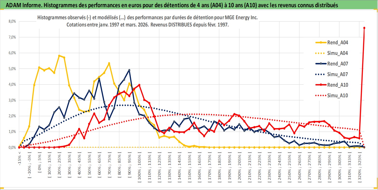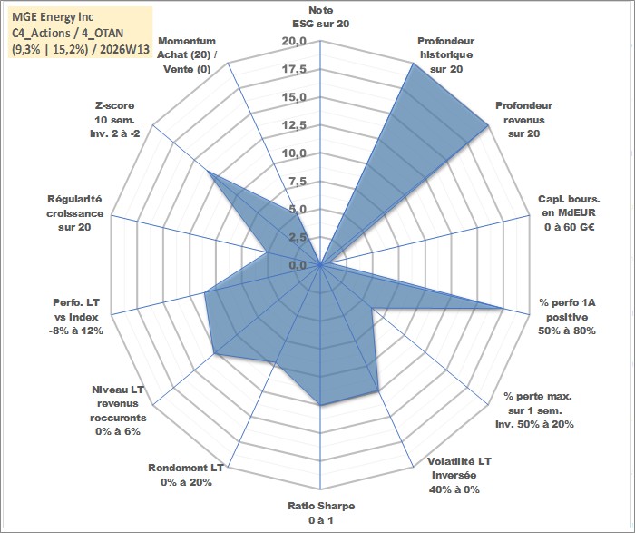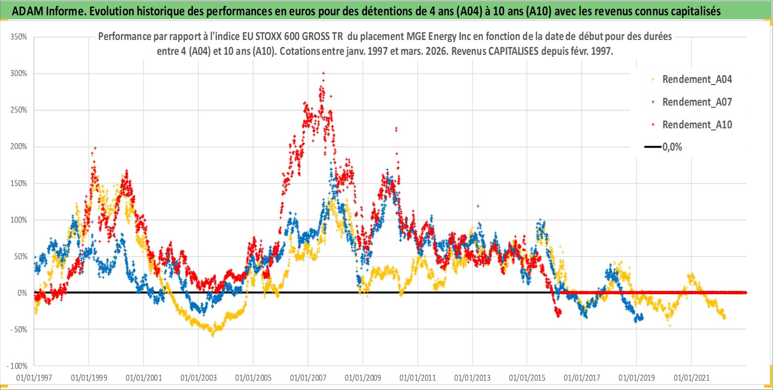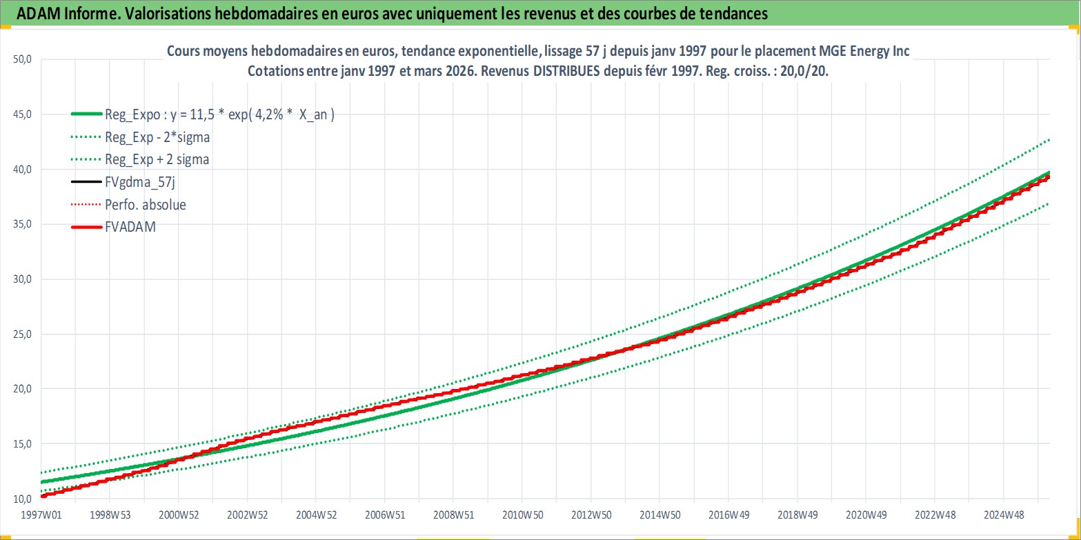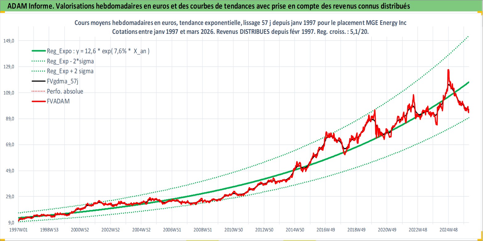 Site dédié aux investisseursPage dédiée sur site financeAnalyse des valorisations hebdomadaires de l'action MGE Energy Inc. Cet actif est cote en USD. Les valorisations sont en contrevaleur EURO et couvrent les semaines 1997W01 a 2026W13. Les revenus de cet actif financier sont pris en compte depuis la semaine 1997W09. La note ESG de cet actif n'est pas connue.