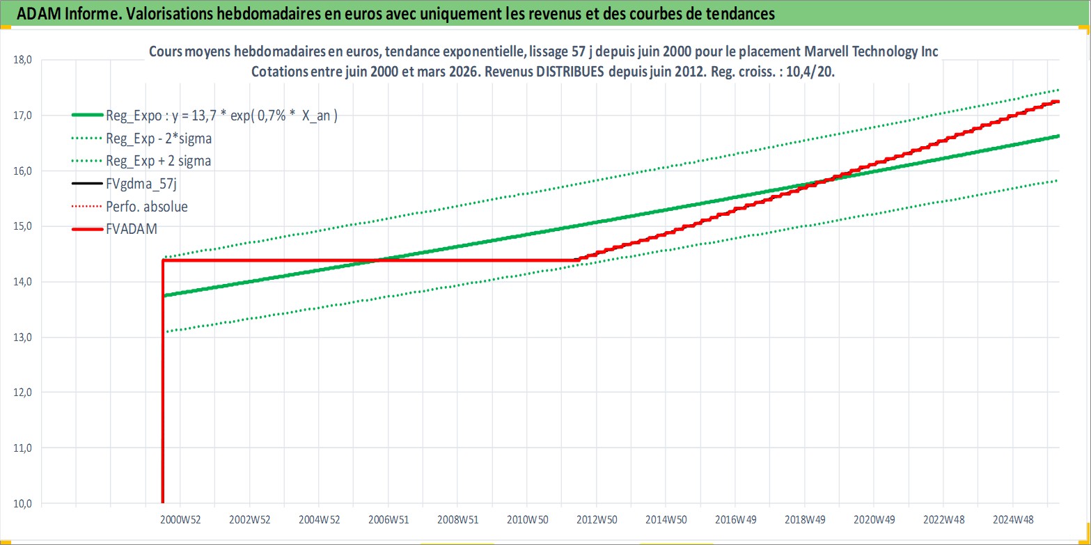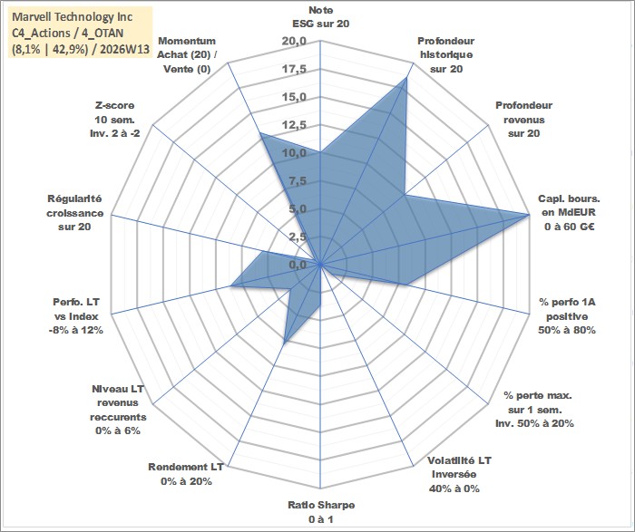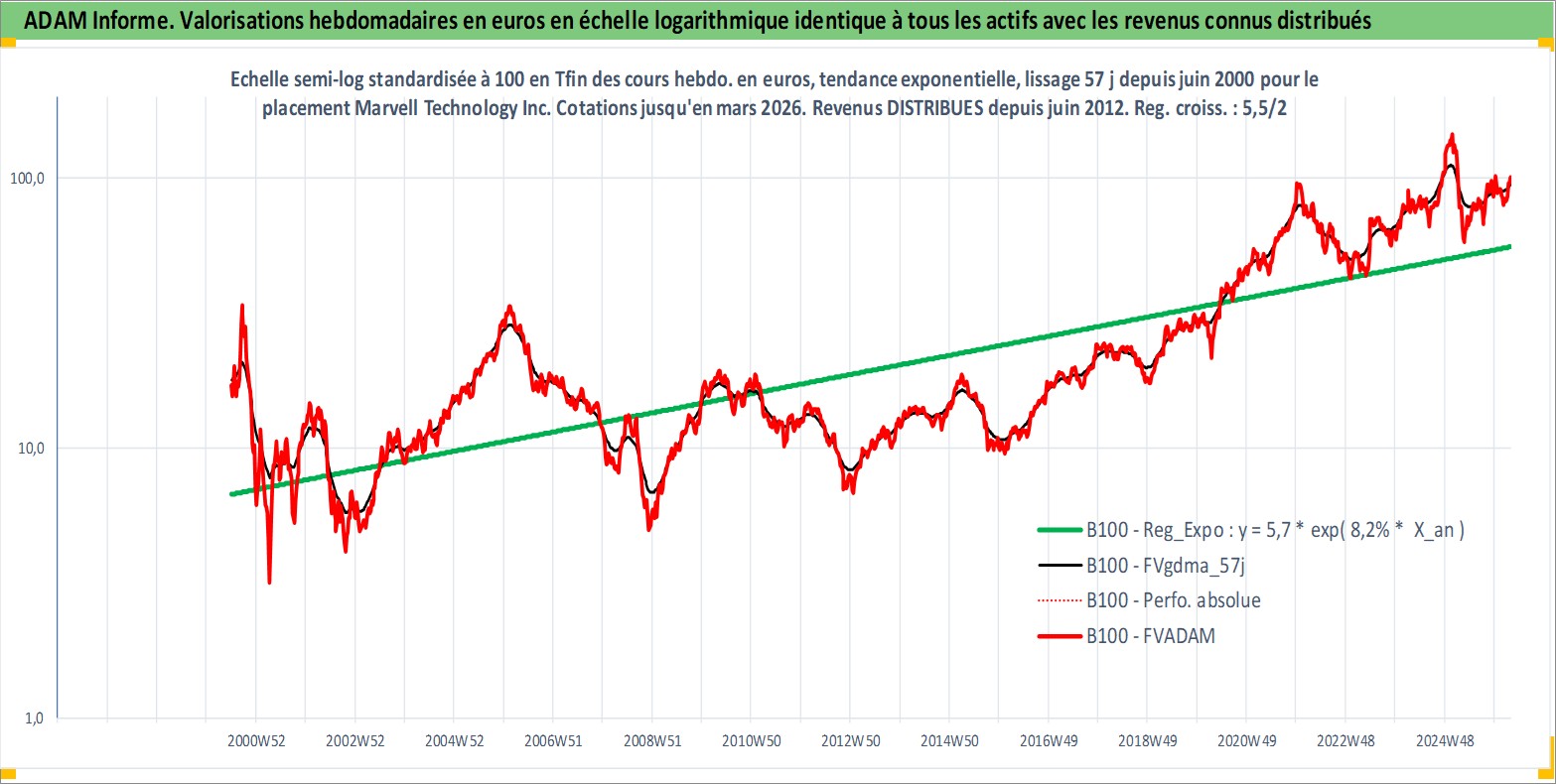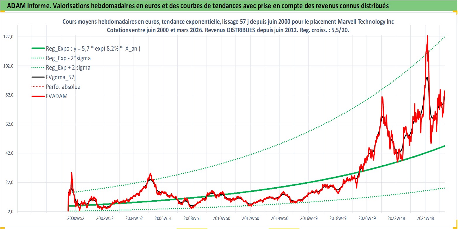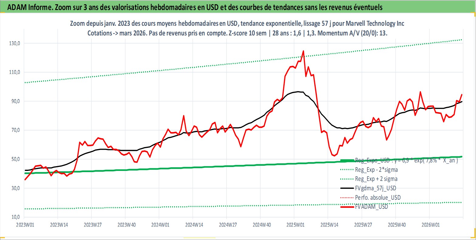 Site dédié aux investisseursPage dédiée sur site financeAnalyse des valorisations hebdomadaires de l'action Marvell Technology Inc. Cet actif est cote en USD. Les valorisations sont en contrevaleur EURO et couvrent les semaines 2000W26 a 2026W13. Les revenus de cet actif financier sont pris en compte depuis la semaine 2012W25. La note globale ESG de cet actif est estimee a 10.0 (apres rebasage entre 0 et 20).