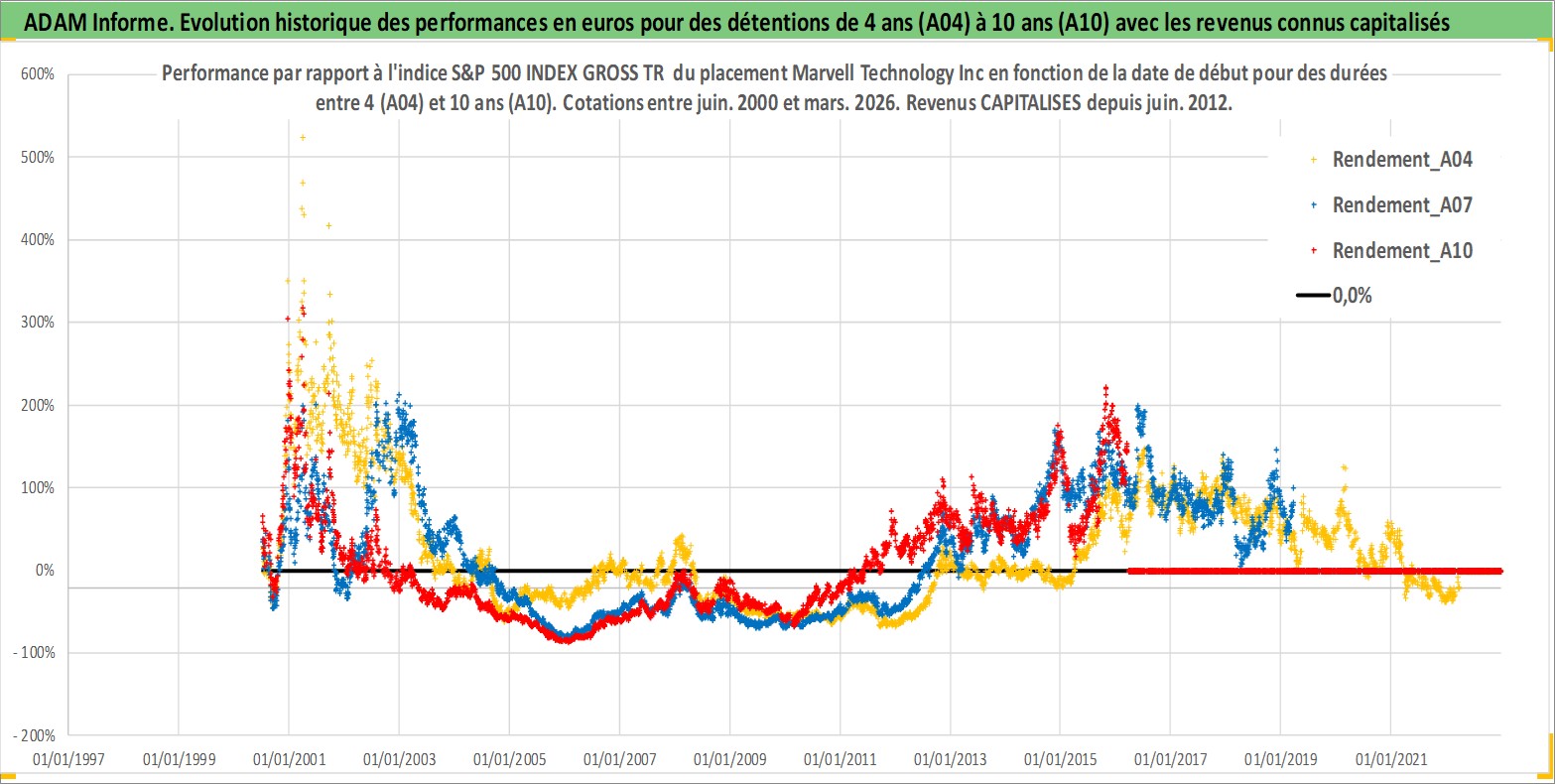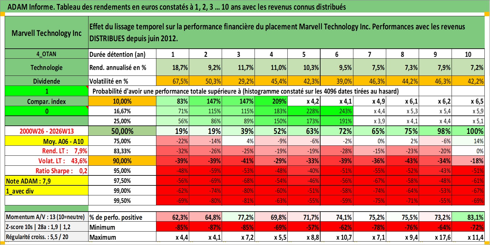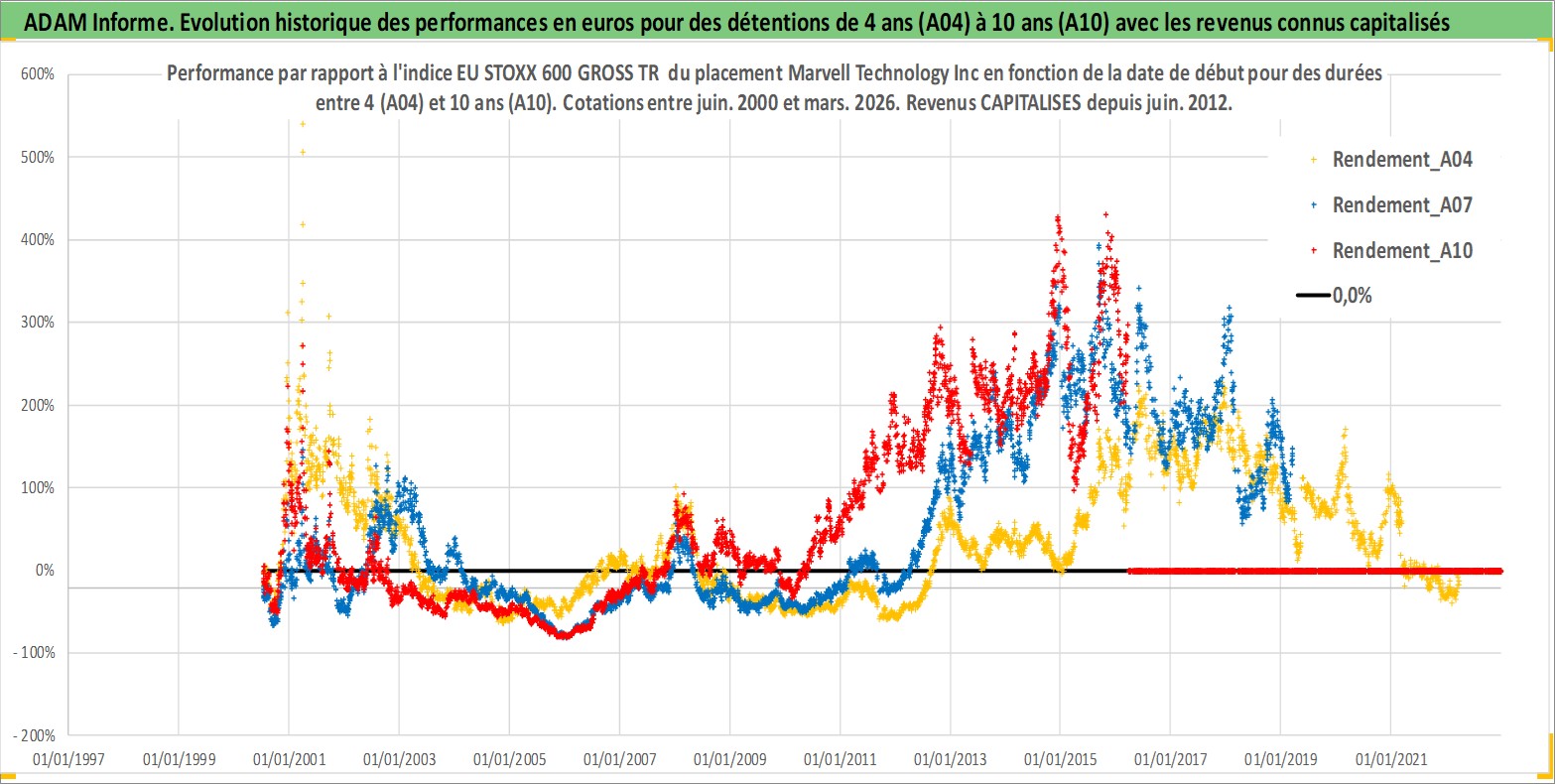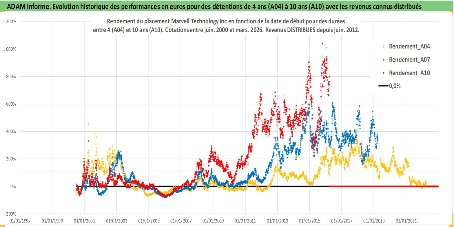 Site dédié aux investisseursPage dédiée sur site financeAnalyse des valorisations hebdomadaires de l'action Marvell Technology Inc. Cet actif est cote en USD. Les valorisations sont en contrevaleur EURO et couvrent les semaines 2000W26 a 2026W13. Les revenus de cet actif financier sont pris en compte depuis la semaine 2012W25. La note globale ESG de cet actif est estimee a 10.0 (apres rebasage entre 0 et 20).
