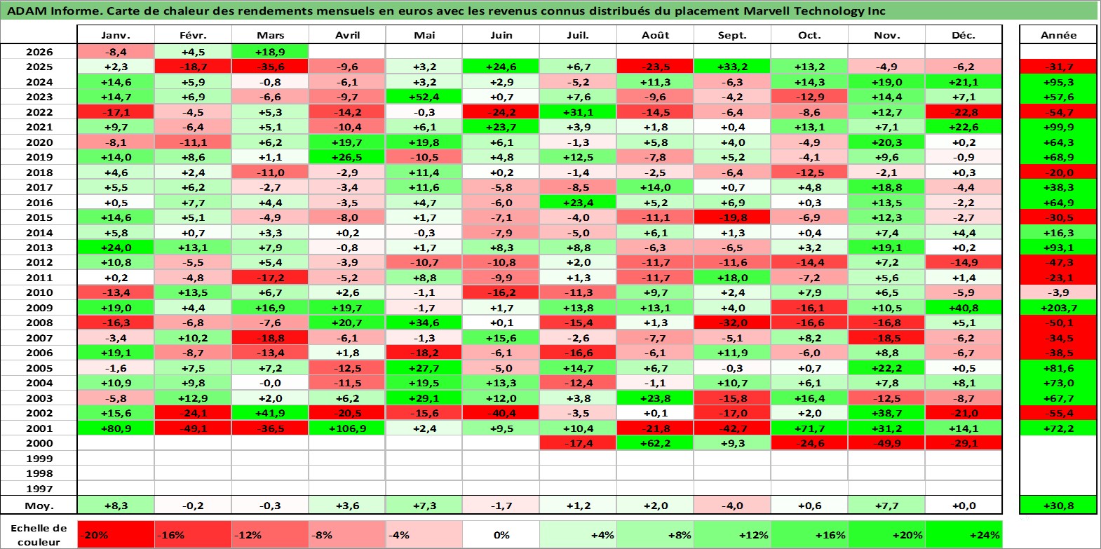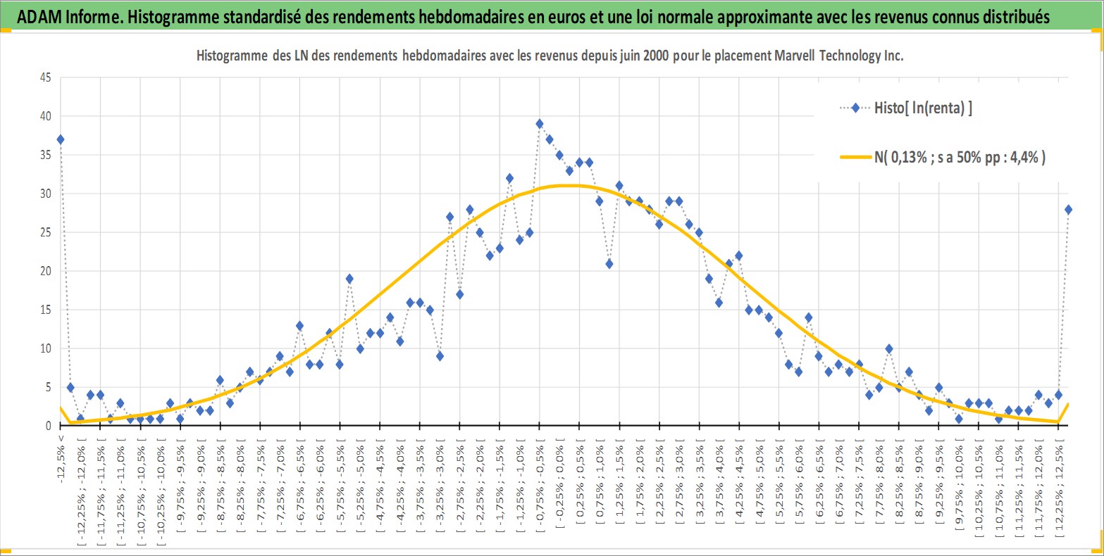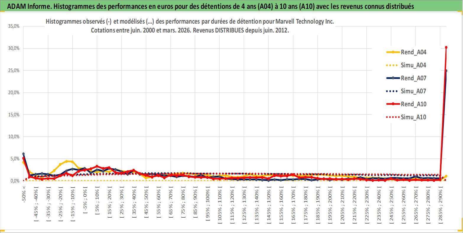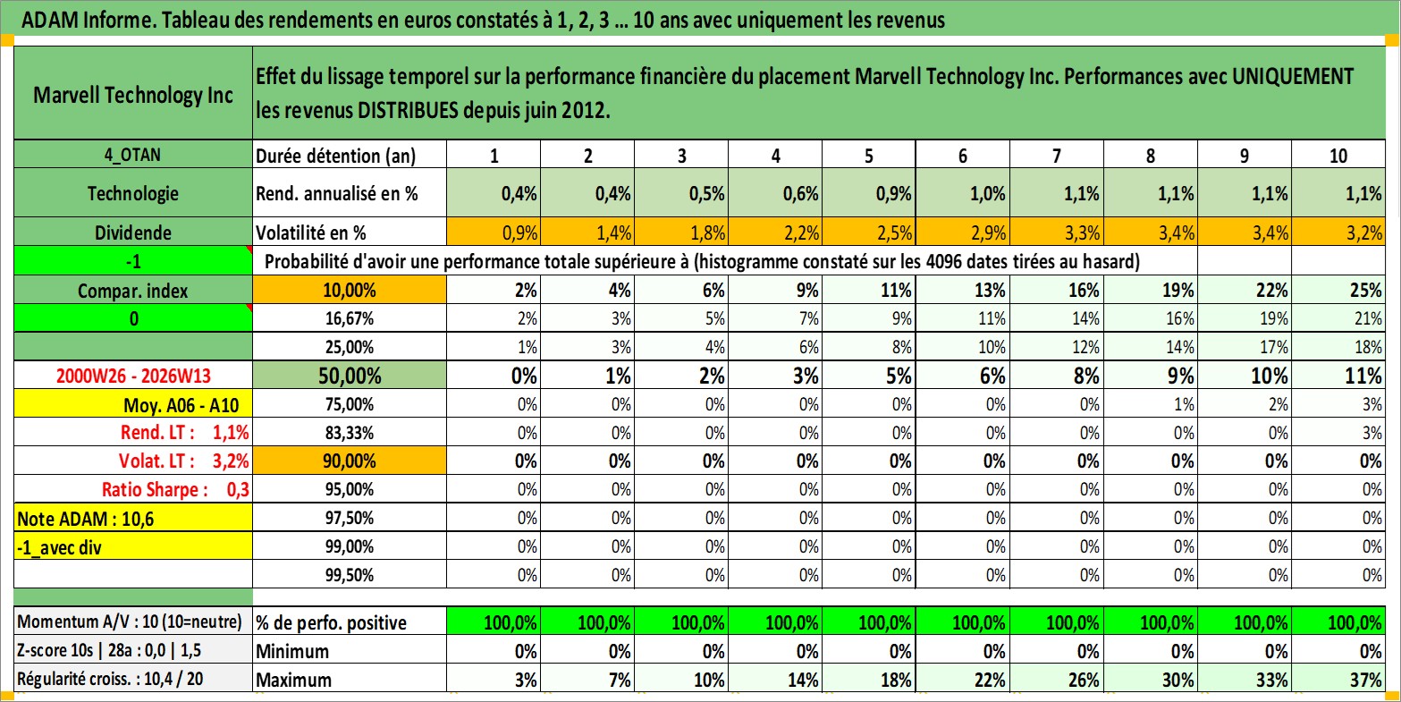 Site dédié aux investisseursPage dédiée sur site financeAnalyse des valorisations hebdomadaires de l'action Marvell Technology Inc. Cet actif est cote en USD. Les valorisations sont en contrevaleur EURO et couvrent les semaines 2000W26 a 2026W13. Les revenus de cet actif financier sont pris en compte depuis la semaine 2012W25. La note globale ESG de cet actif est estimee a 10.0 (apres rebasage entre 0 et 20).