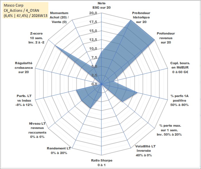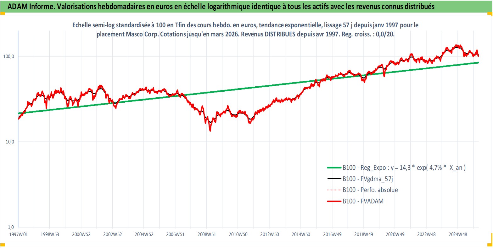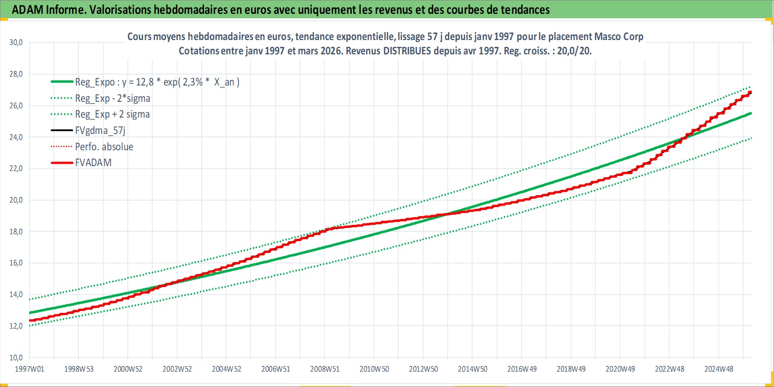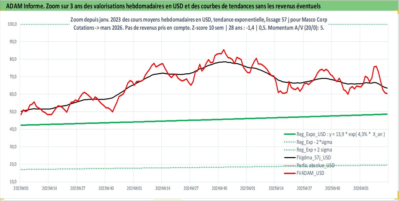 Site dédié aux investisseursPage dédiée sur site financeAnalyse des valorisations hebdomadaires de l'action Masco Corp. Cet actif est cote en USD. Les valorisations sont en contrevaleur EURO et couvrent les semaines 1997W01 a 2026W13. Les revenus de cet actif financier sont pris en compte depuis la semaine 1997W14. La note globale ESG de cet actif est estimee a 9.0 (apres rebasage entre 0 et 20).