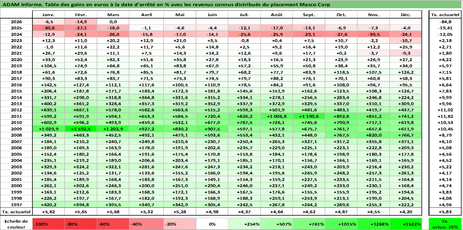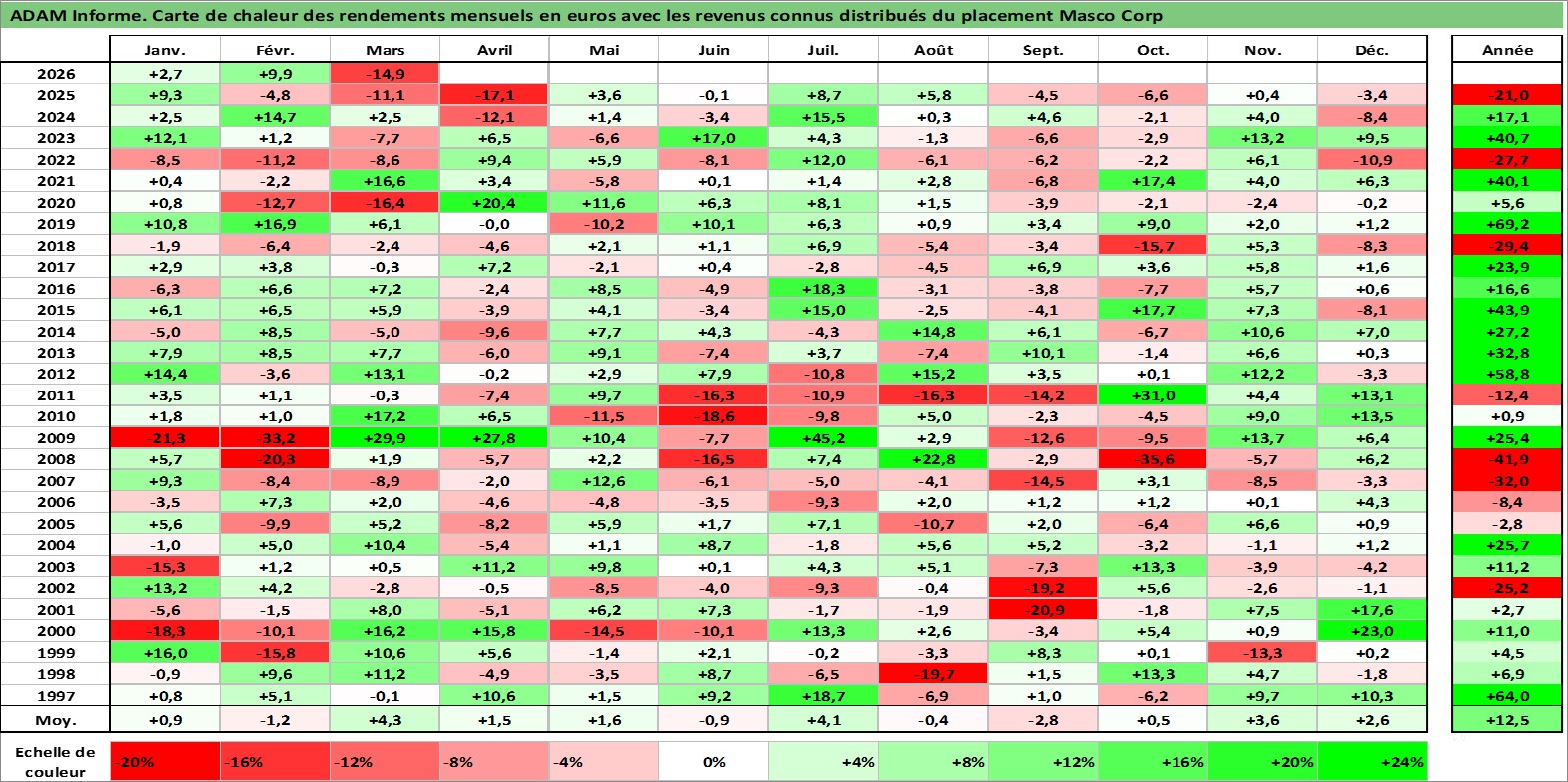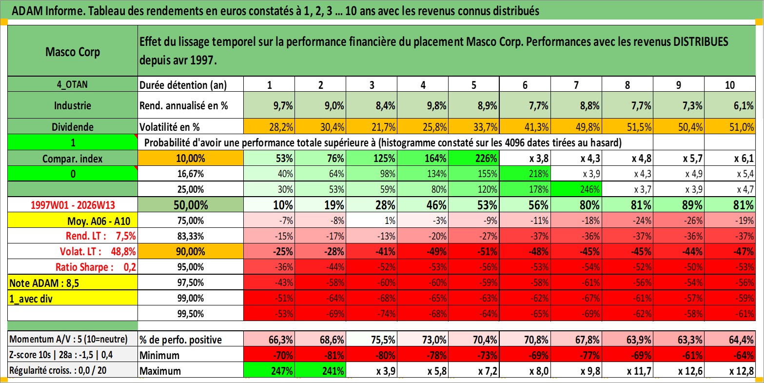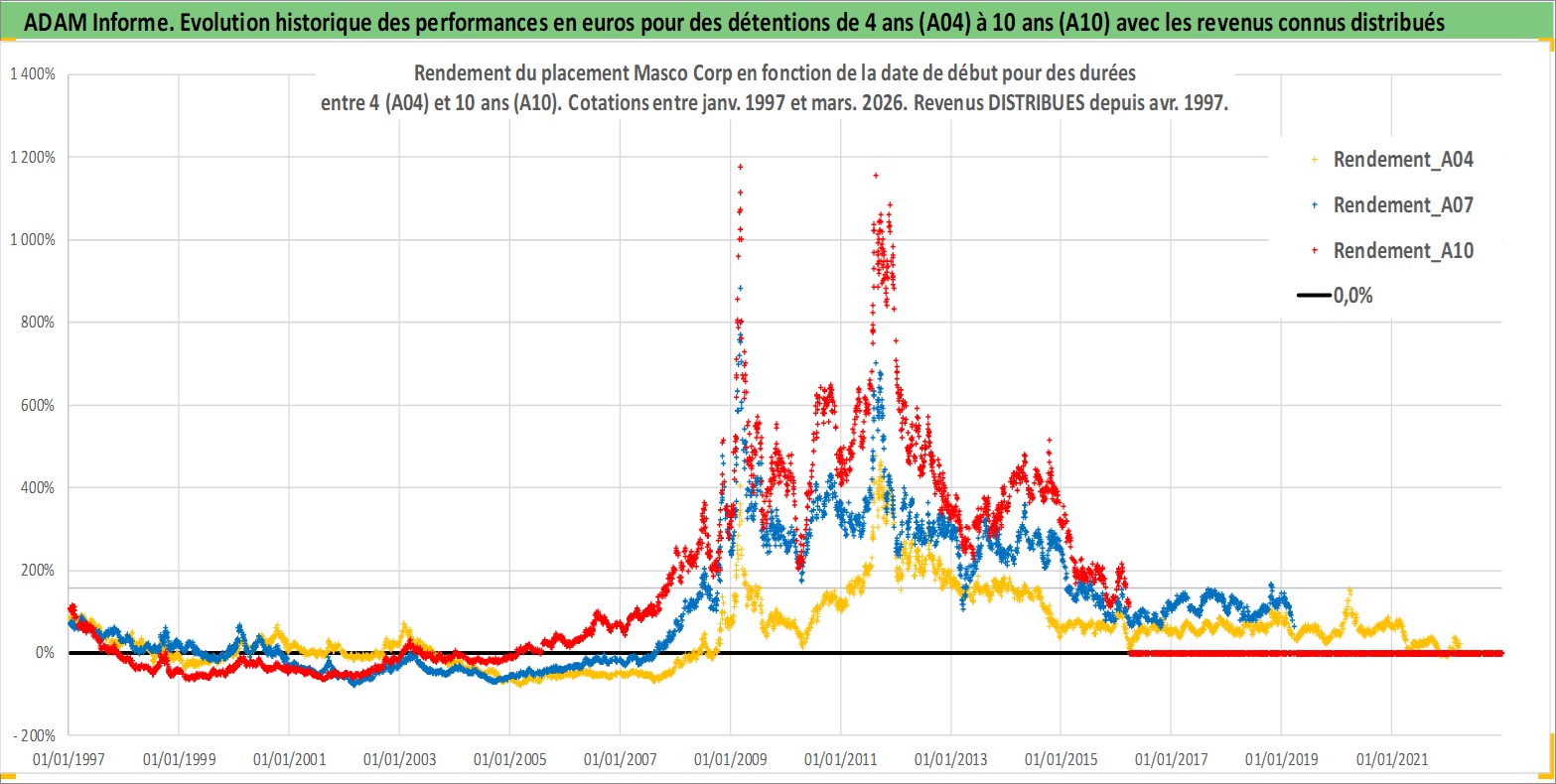 Site dédié aux investisseursPage dédiée sur site financeAnalyse des valorisations hebdomadaires de l'action Masco Corp. Cet actif est cote en USD. Les valorisations sont en contrevaleur EURO et couvrent les semaines 1997W01 a 2026W13. Les revenus de cet actif financier sont pris en compte depuis la semaine 1997W14. La note globale ESG de cet actif est estimee a 9.0 (apres rebasage entre 0 et 20).