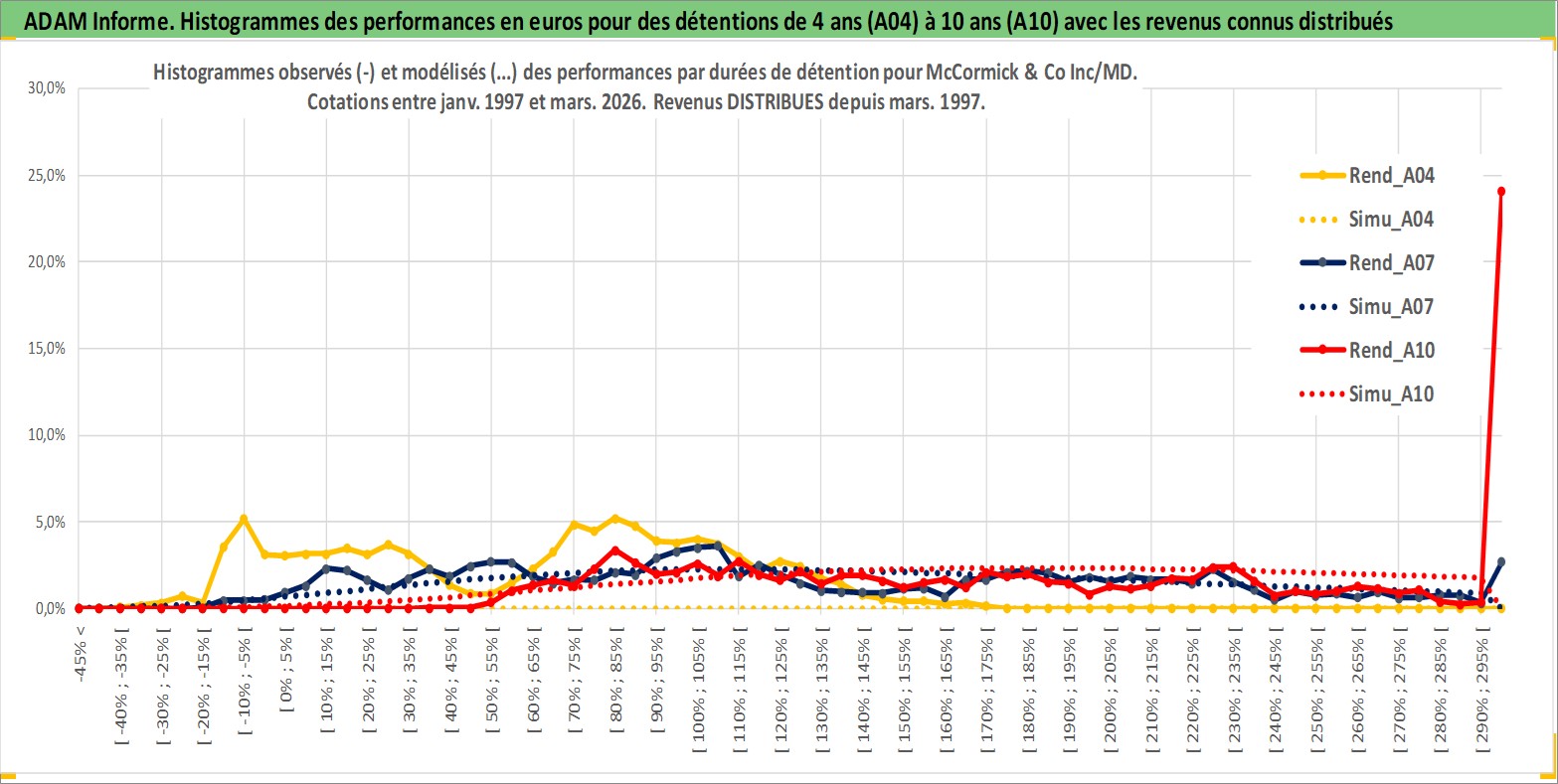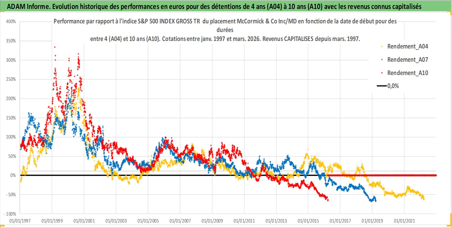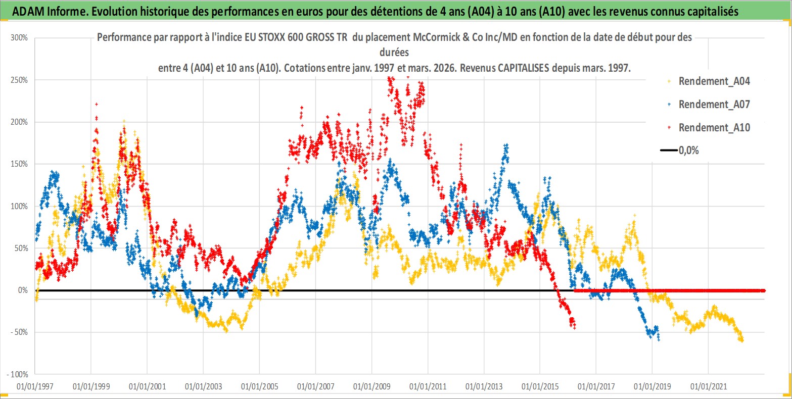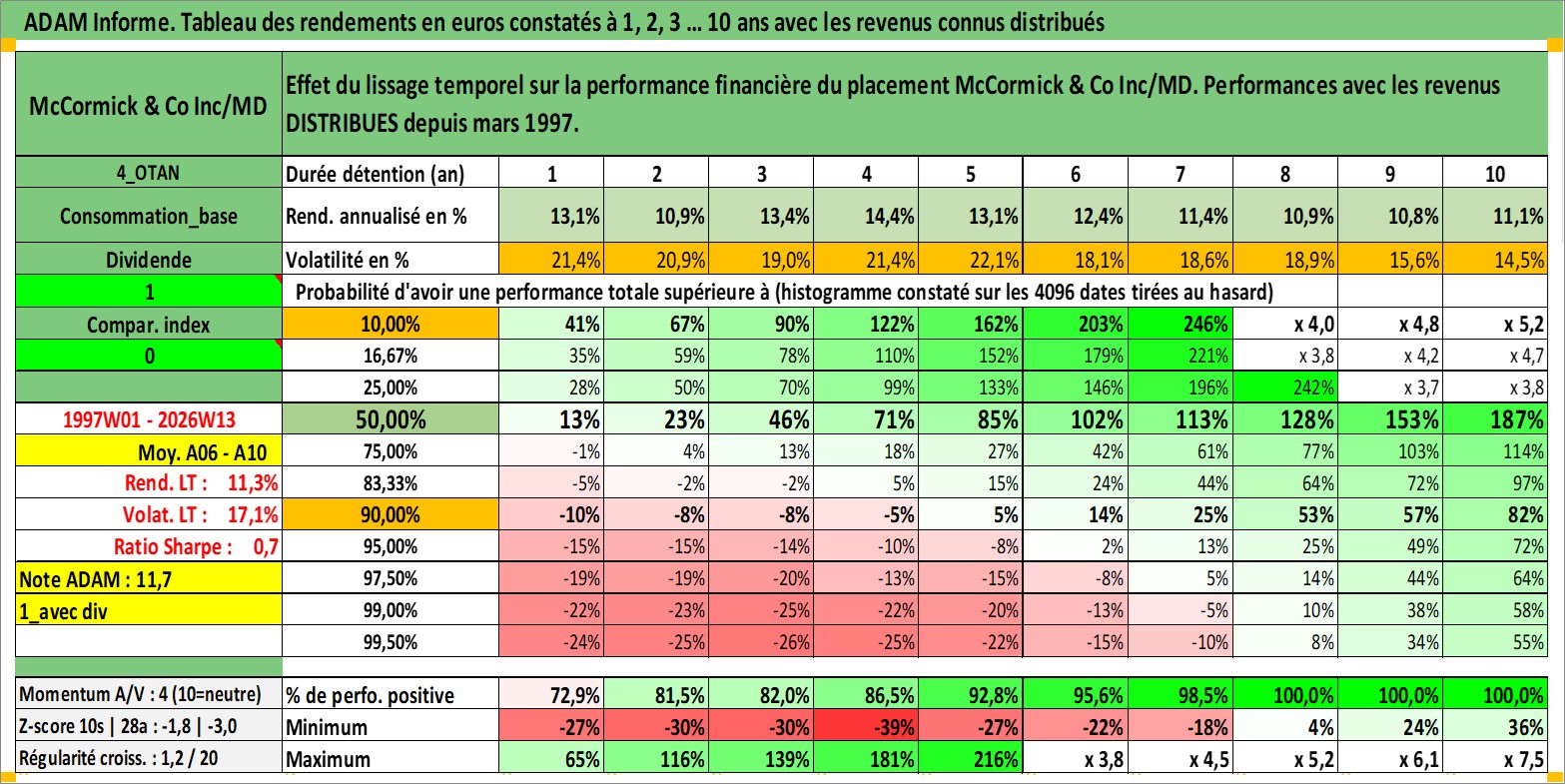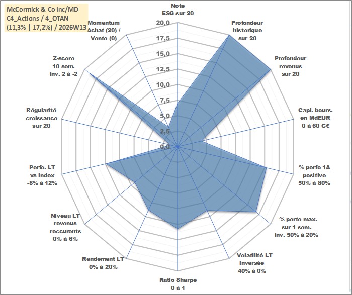 Site dédié aux investisseursPage dédiée sur site financeAnalyse des valorisations hebdomadaires de l'action McCormick & Co Inc/MD. Cet actif est cote en USD. Les valorisations sont en contrevaleur EURO et couvrent les semaines 1997W01 a 2026W13. Les revenus de cet actif financier sont pris en compte depuis la semaine 1997W13. La note globale ESG de cet actif est estimee a 7.0 (apres rebasage entre 0 et 20).