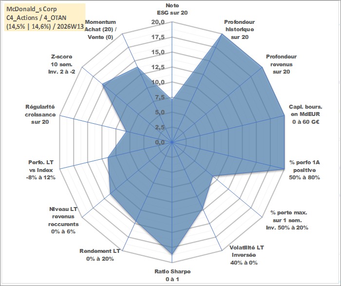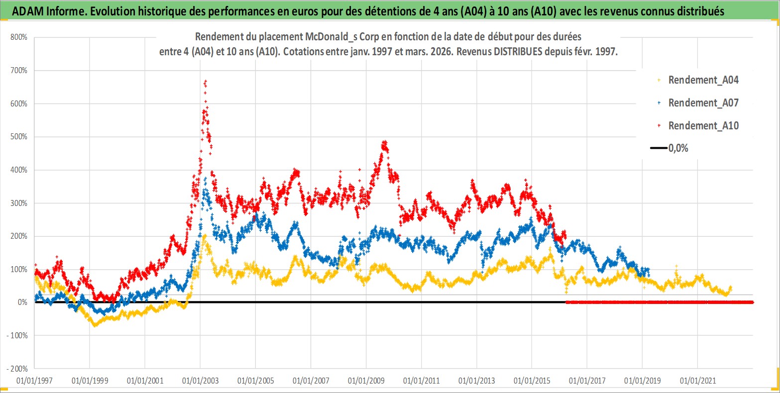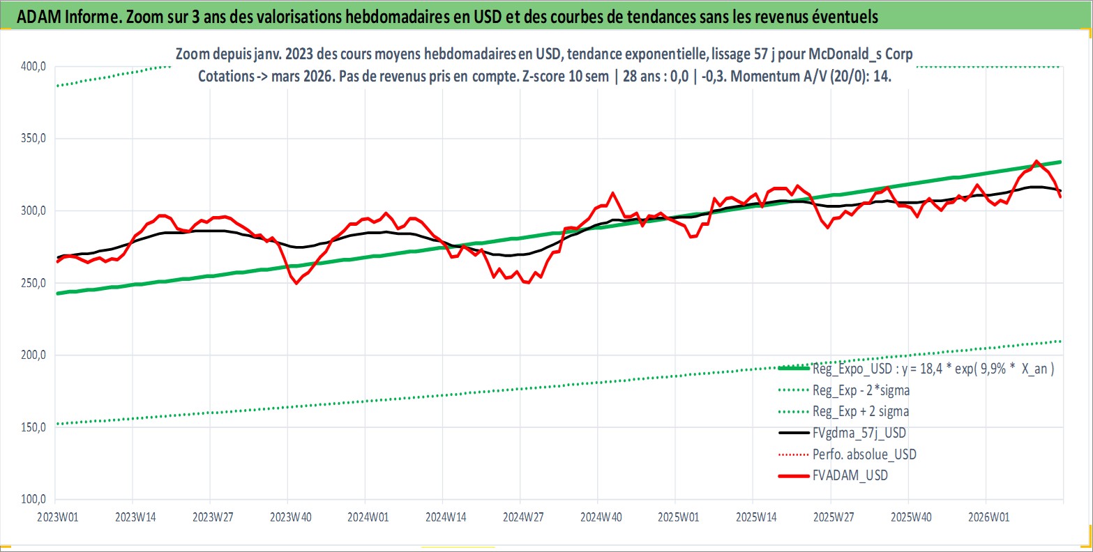 Site dédié aux investisseursPage dédiée sur site financeAnalyse des valorisations hebdomadaires de l'action McDonald_s Corp. Cet actif est cote en USD. Les valorisations sont en contrevaleur EURO et couvrent les semaines 1997W01 a 2026W13. Les revenus de cet actif financier sont pris en compte depuis la semaine 1997W09. La note globale ESG de cet actif est estimee a 7.0 (apres rebasage entre 0 et 20).