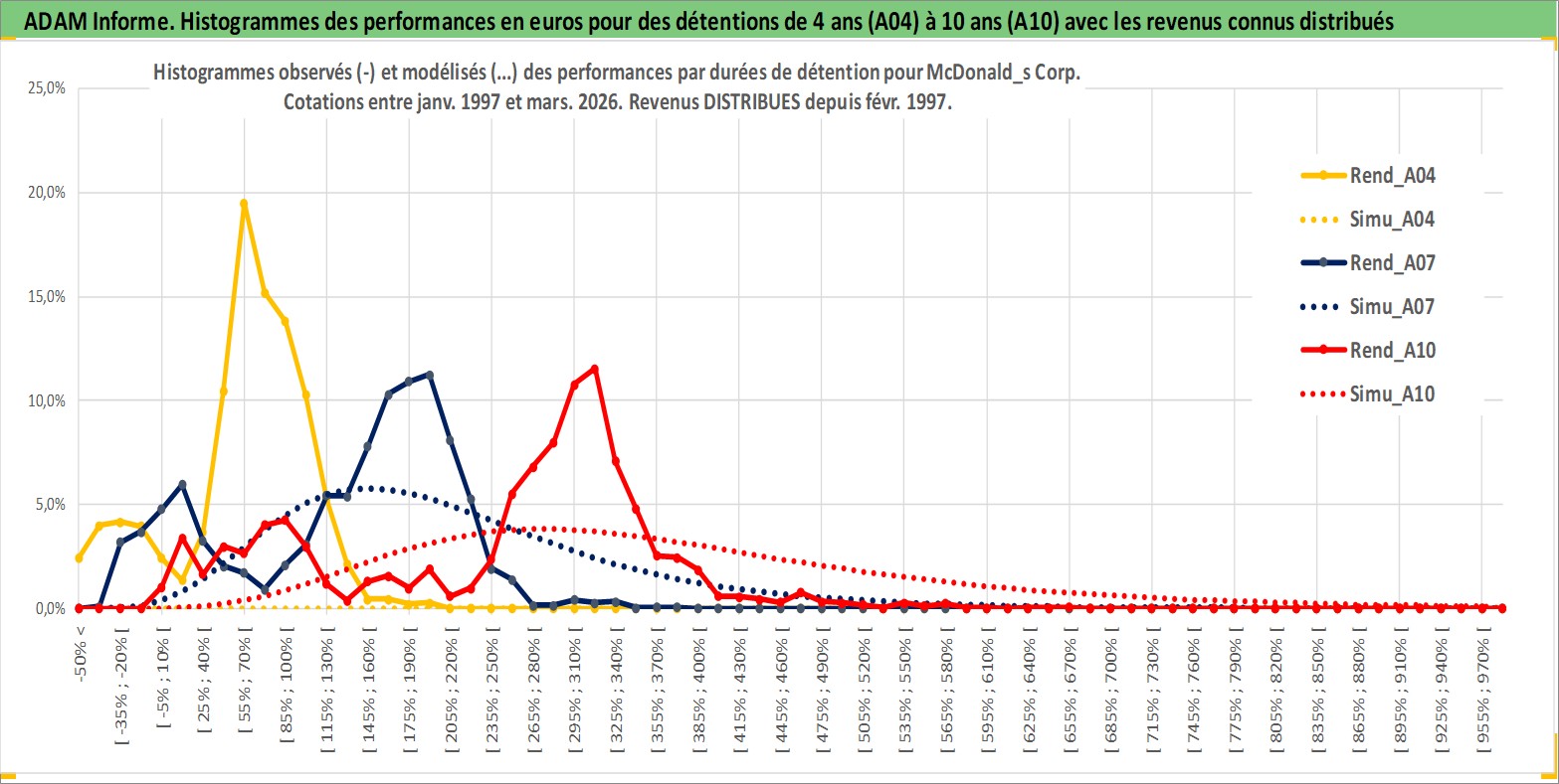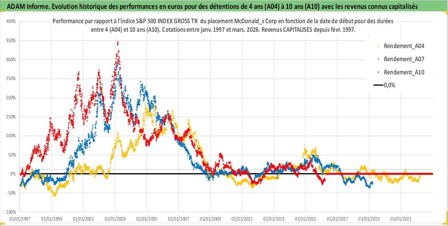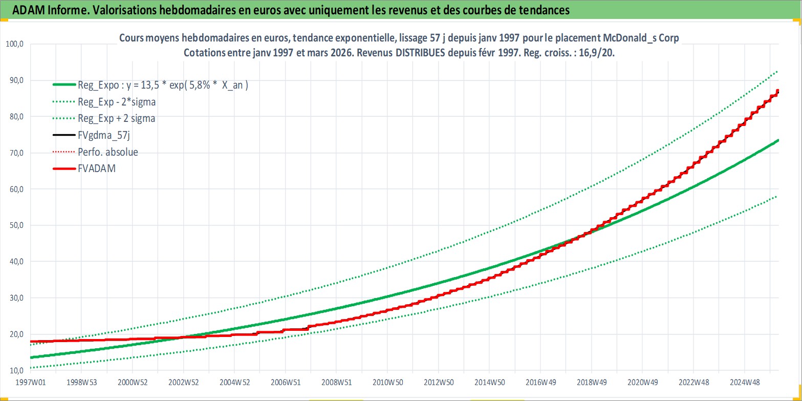 Site dédié aux investisseursPage dédiée sur site financeAnalyse des valorisations hebdomadaires de l'action McDonald_s Corp. Cet actif est cote en USD. Les valorisations sont en contrevaleur EURO et couvrent les semaines 1997W01 a 2026W13. Les revenus de cet actif financier sont pris en compte depuis la semaine 1997W09. La note globale ESG de cet actif est estimee a 7.0 (apres rebasage entre 0 et 20).