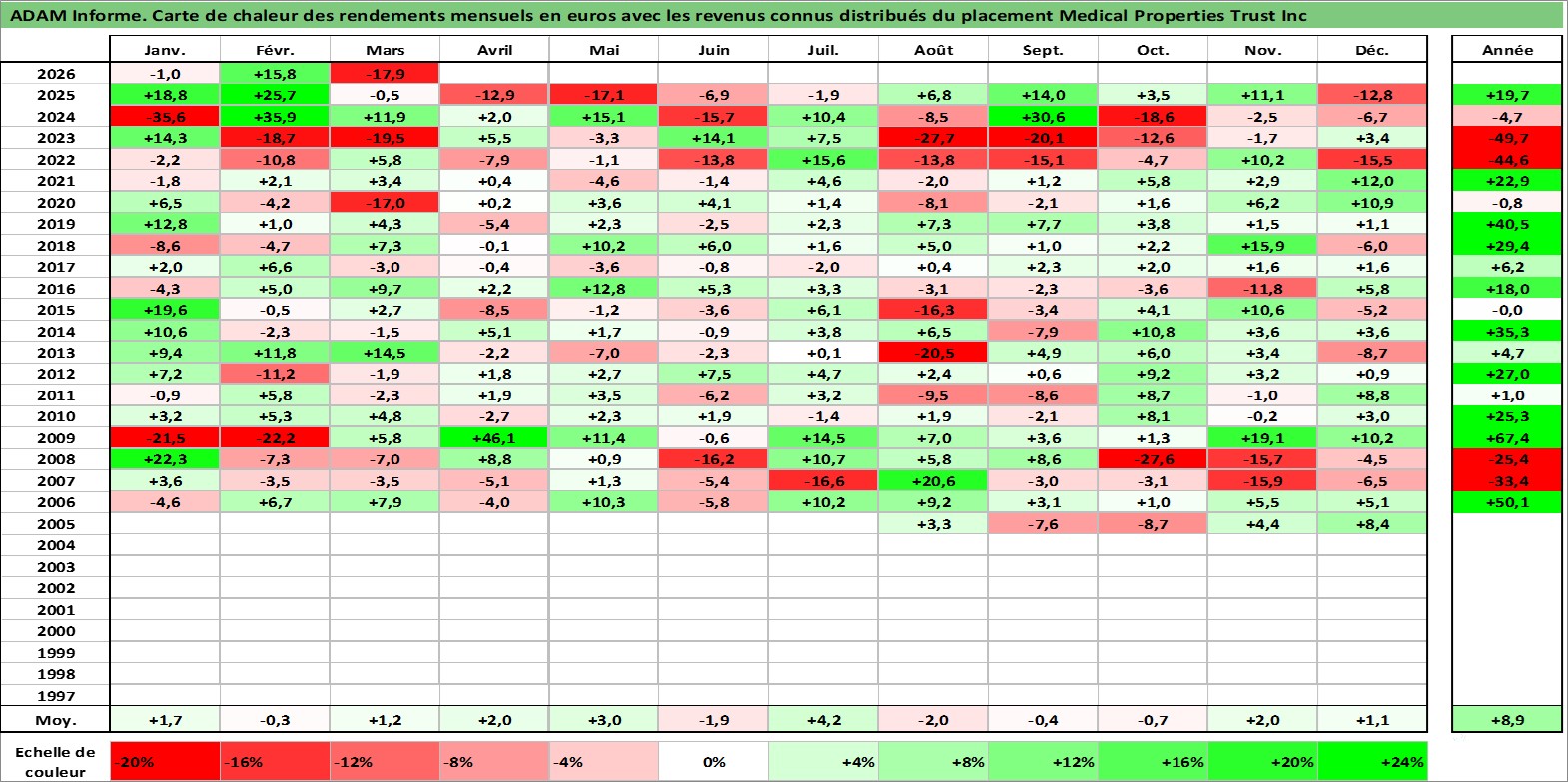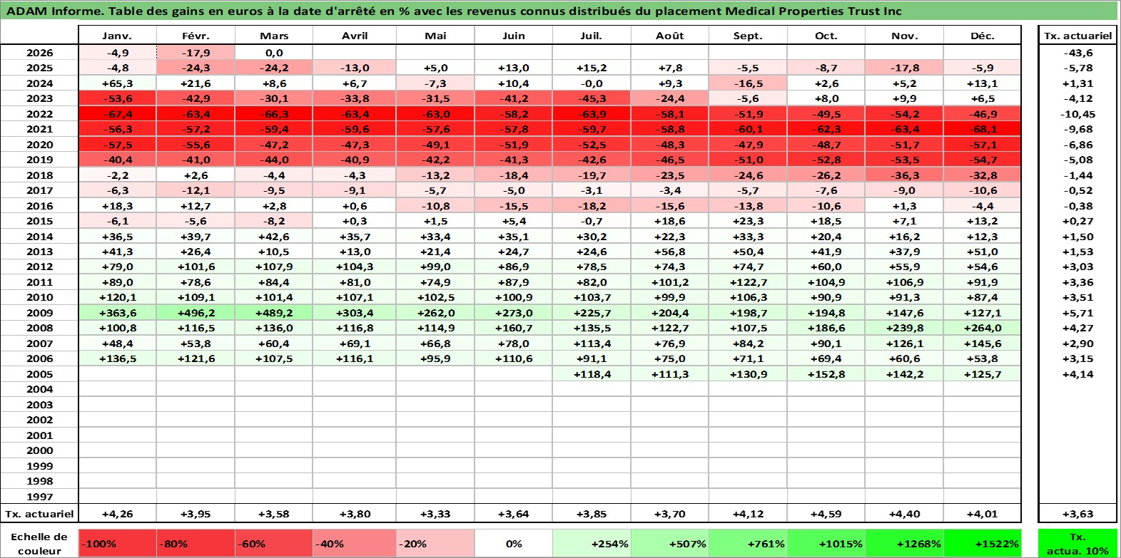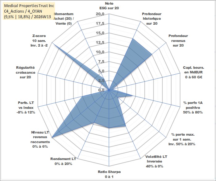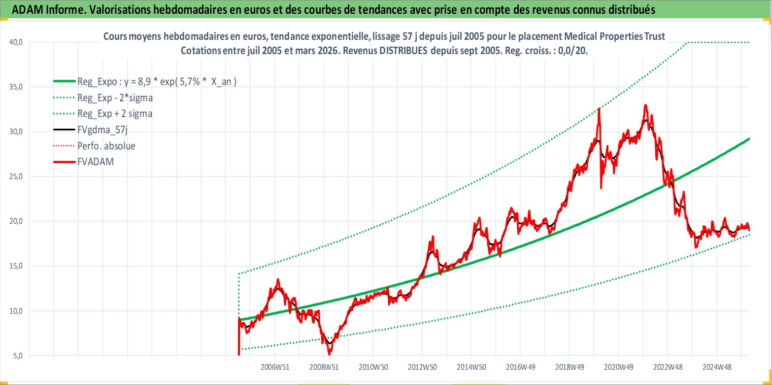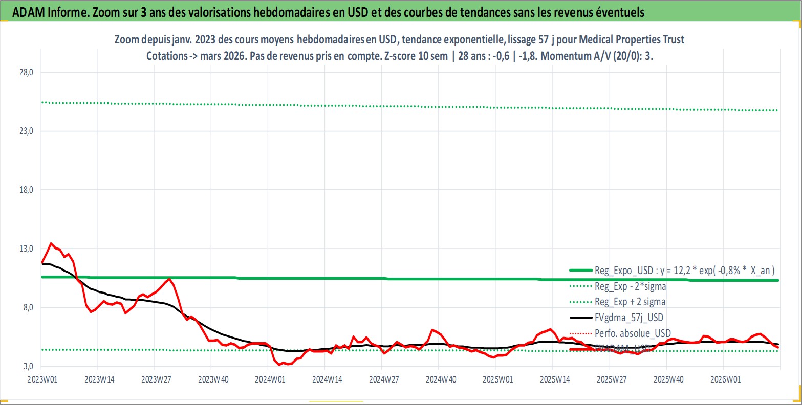 Site dédié aux investisseursPage dédiée sur site financeAnalyse des valorisations hebdomadaires de l'action Medical Properties Trust Inc. Cet actif est cote en USD. Les valorisations sont en contrevaleur EURO et couvrent les semaines 2005W27 a 2026W13. Les revenus de cet actif financier sont pris en compte depuis la semaine 2005W37. La note ESG de cet actif n'est pas connue.
