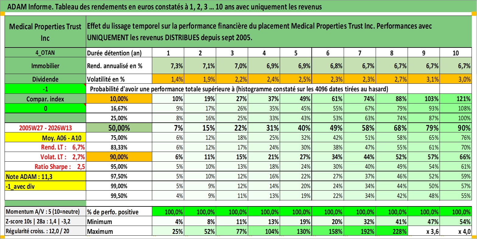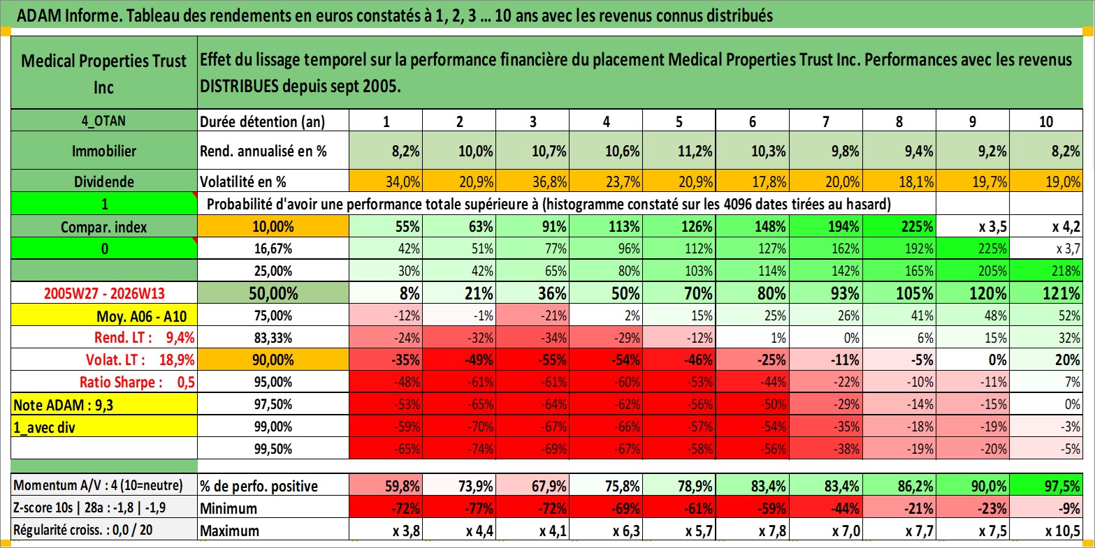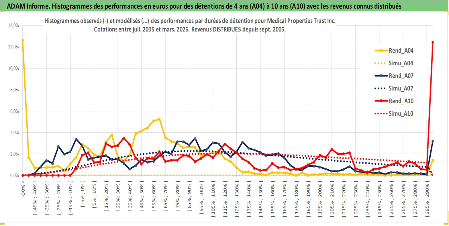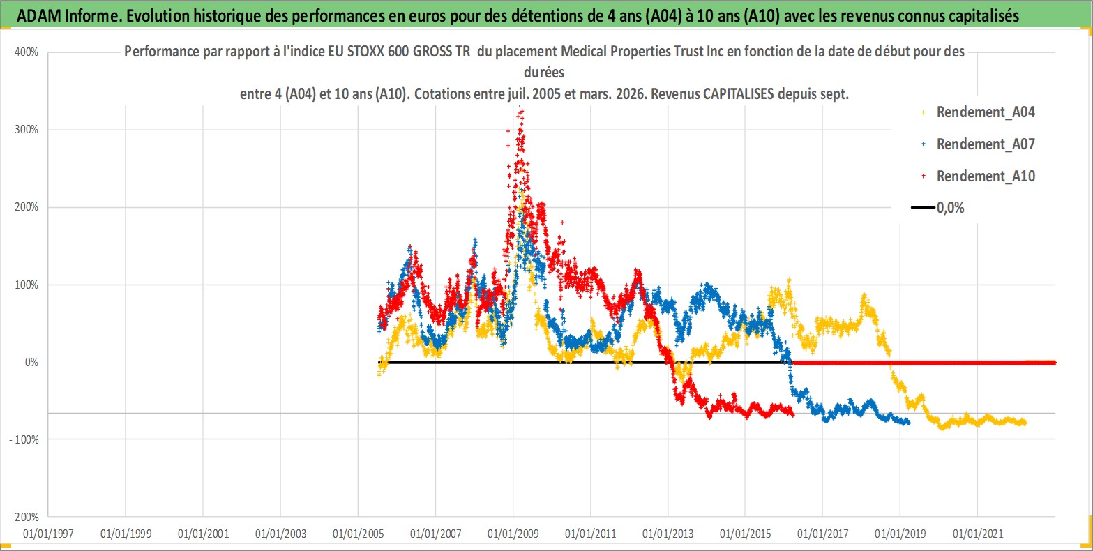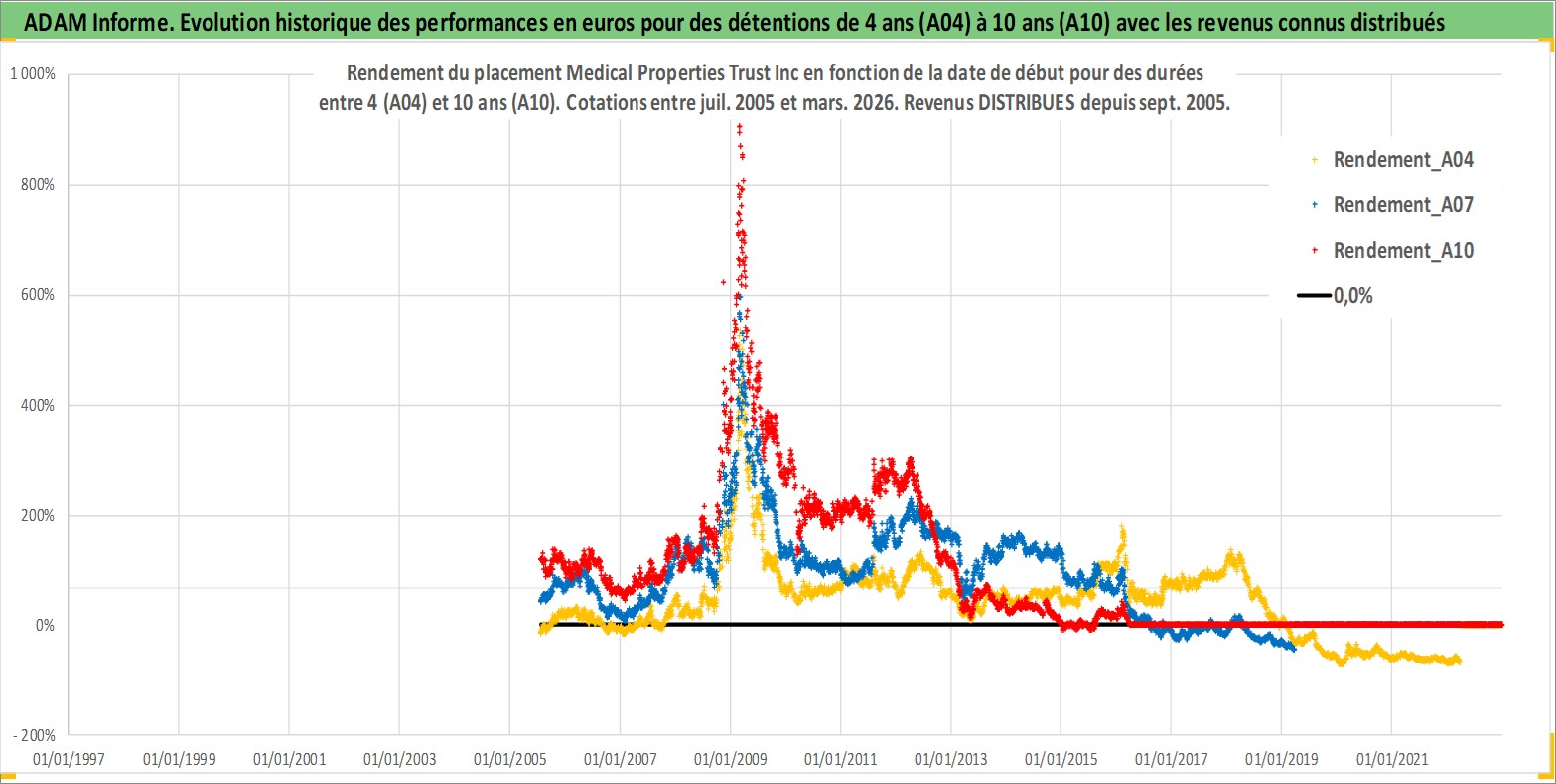 Site dédié aux investisseursPage dédiée sur site financeAnalyse des valorisations hebdomadaires de l'action Medical Properties Trust Inc. Cet actif est cote en USD. Les valorisations sont en contrevaleur EURO et couvrent les semaines 2005W27 a 2026W13. Les revenus de cet actif financier sont pris en compte depuis la semaine 2005W37. La note ESG de cet actif n'est pas connue.