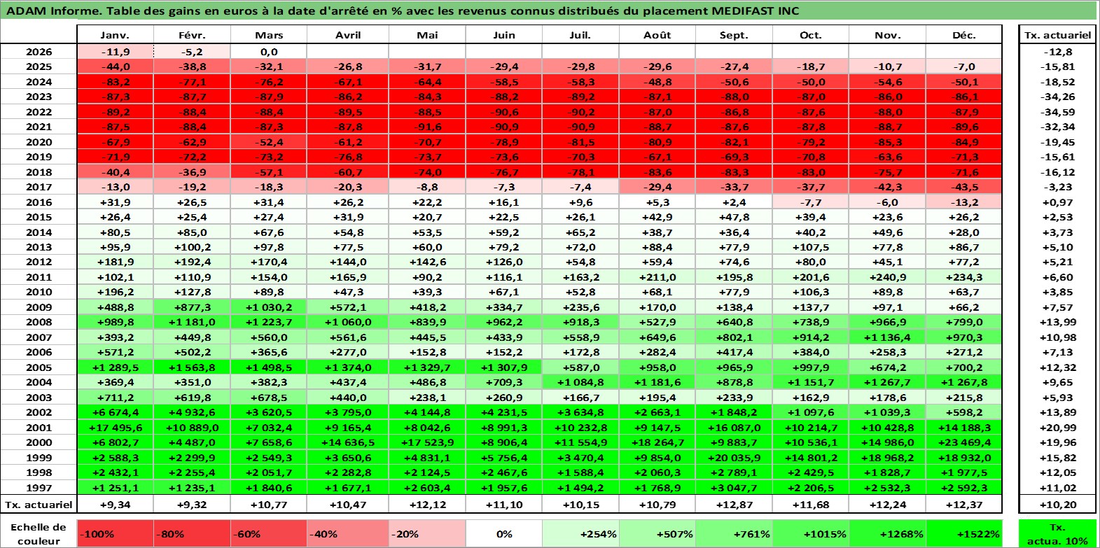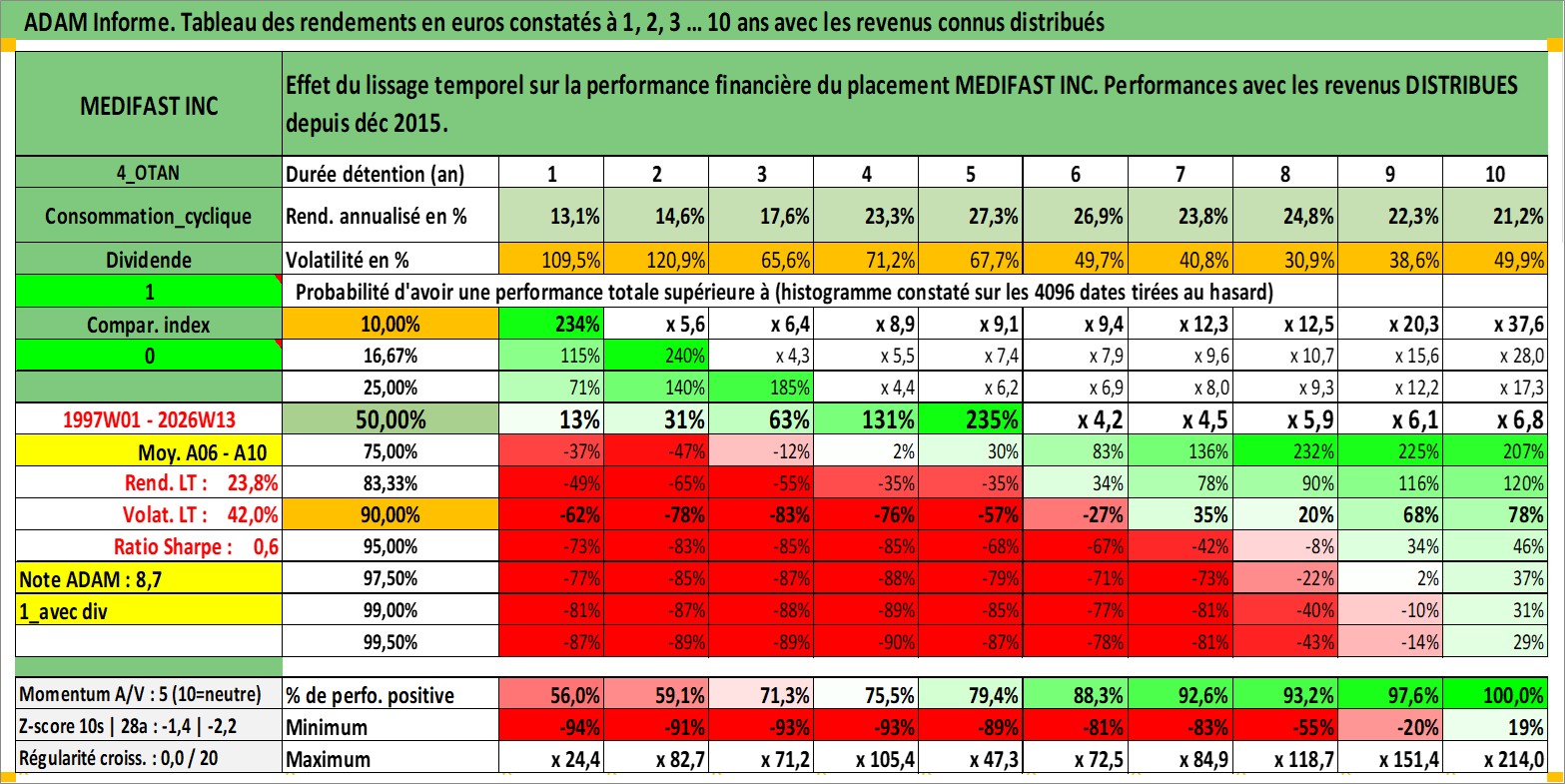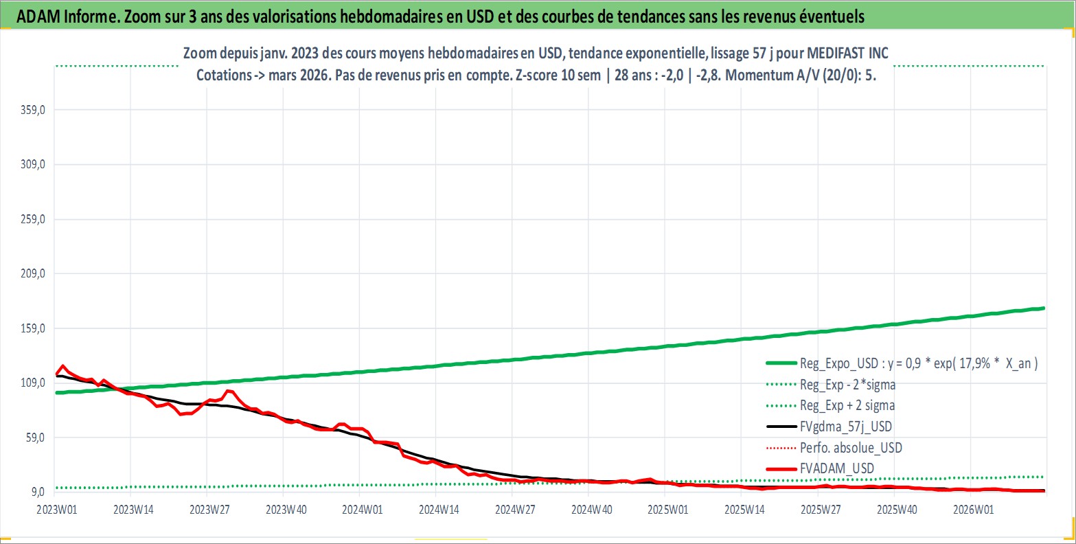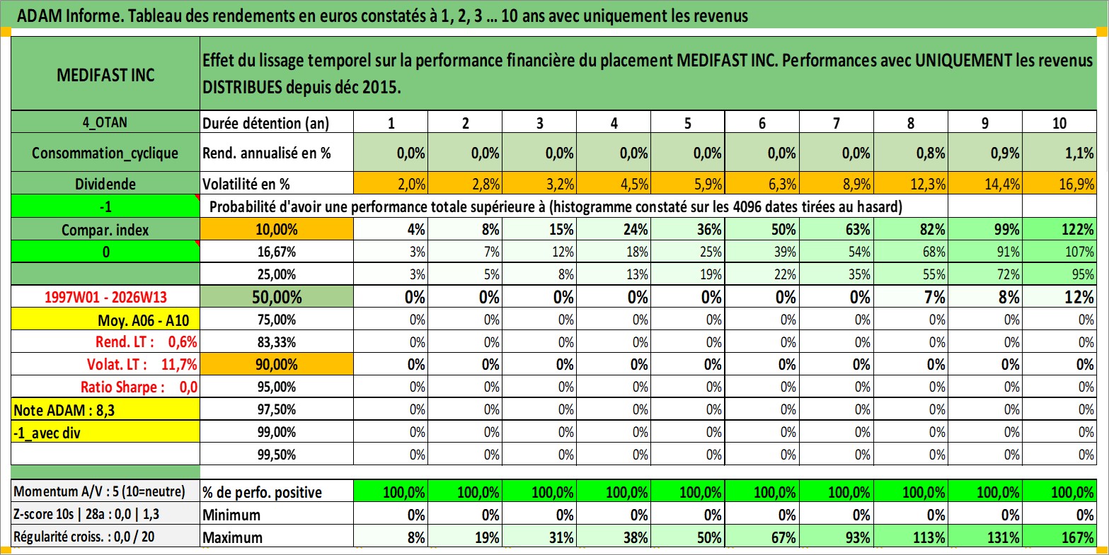 Site dédié aux investisseursPage dédiée sur site financeAnalyse des valorisations hebdomadaires de l'action MEDIFAST INC. Cet actif est cote en USD. Les valorisations sont en contrevaleur EURO et couvrent les semaines 1997W01 a 2026W13. Les revenus de cet actif financier sont pris en compte depuis la semaine 2015W52. La note ESG de cet actif n'est pas connue.