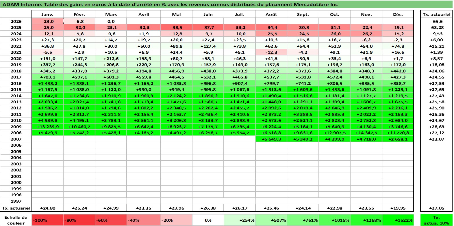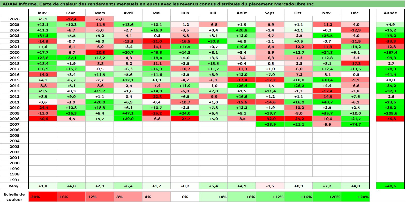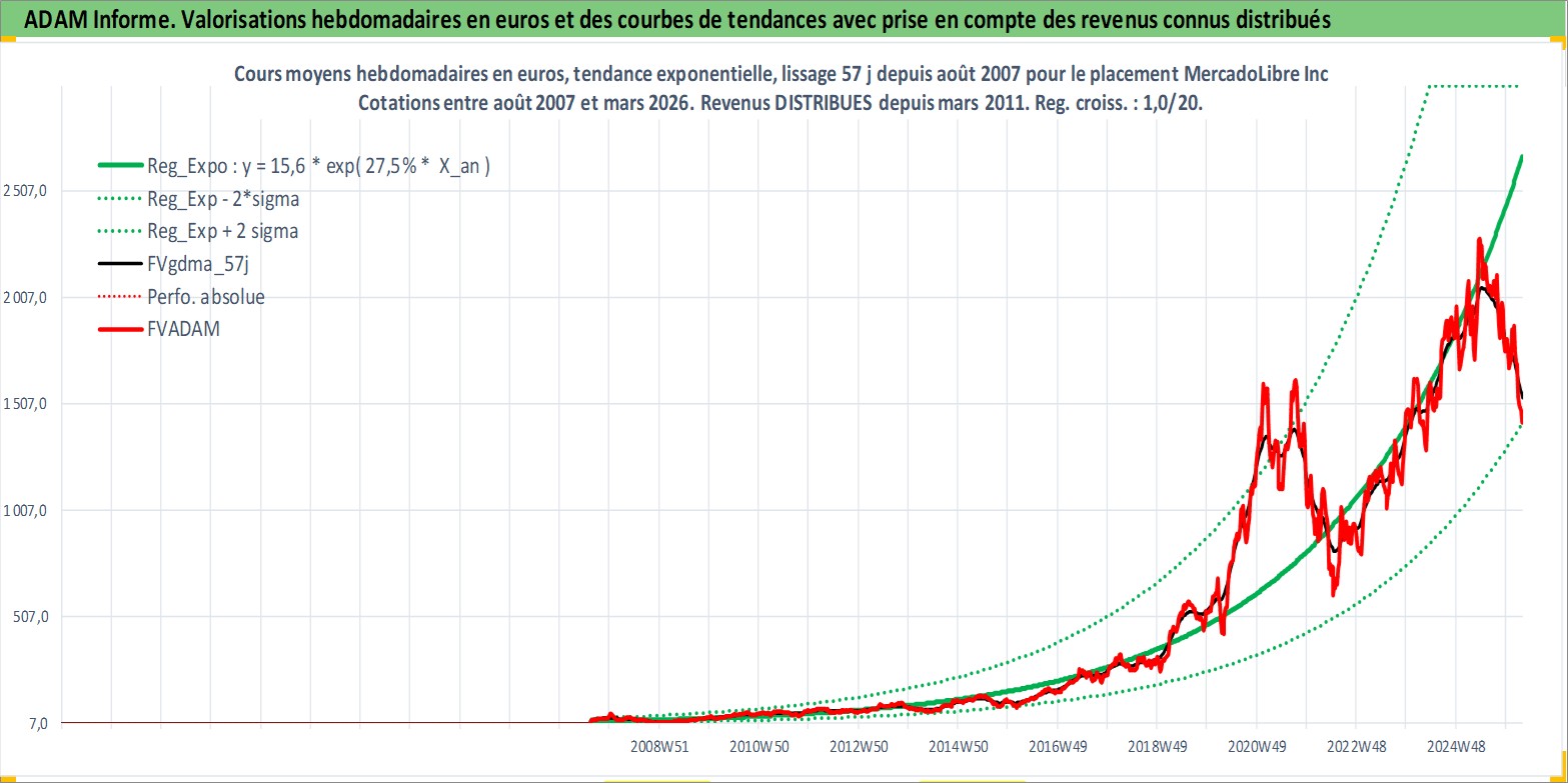 Site dédié aux investisseursPage dédiée sur site financeAnalyse des valorisations hebdomadaires de l'action MercadoLibre Inc. Cet actif est cote en USD. Les valorisations sont en contrevaleur EURO et couvrent les semaines 2007W32 a 2026W13. Les revenus de cet actif financier sont pris en compte depuis la semaine 2011W13. La note ESG de cet actif n'est pas connue.