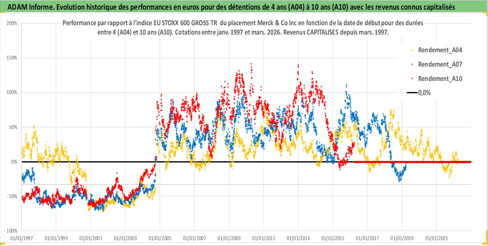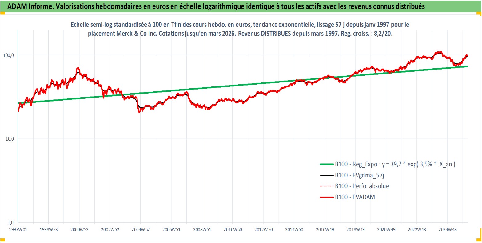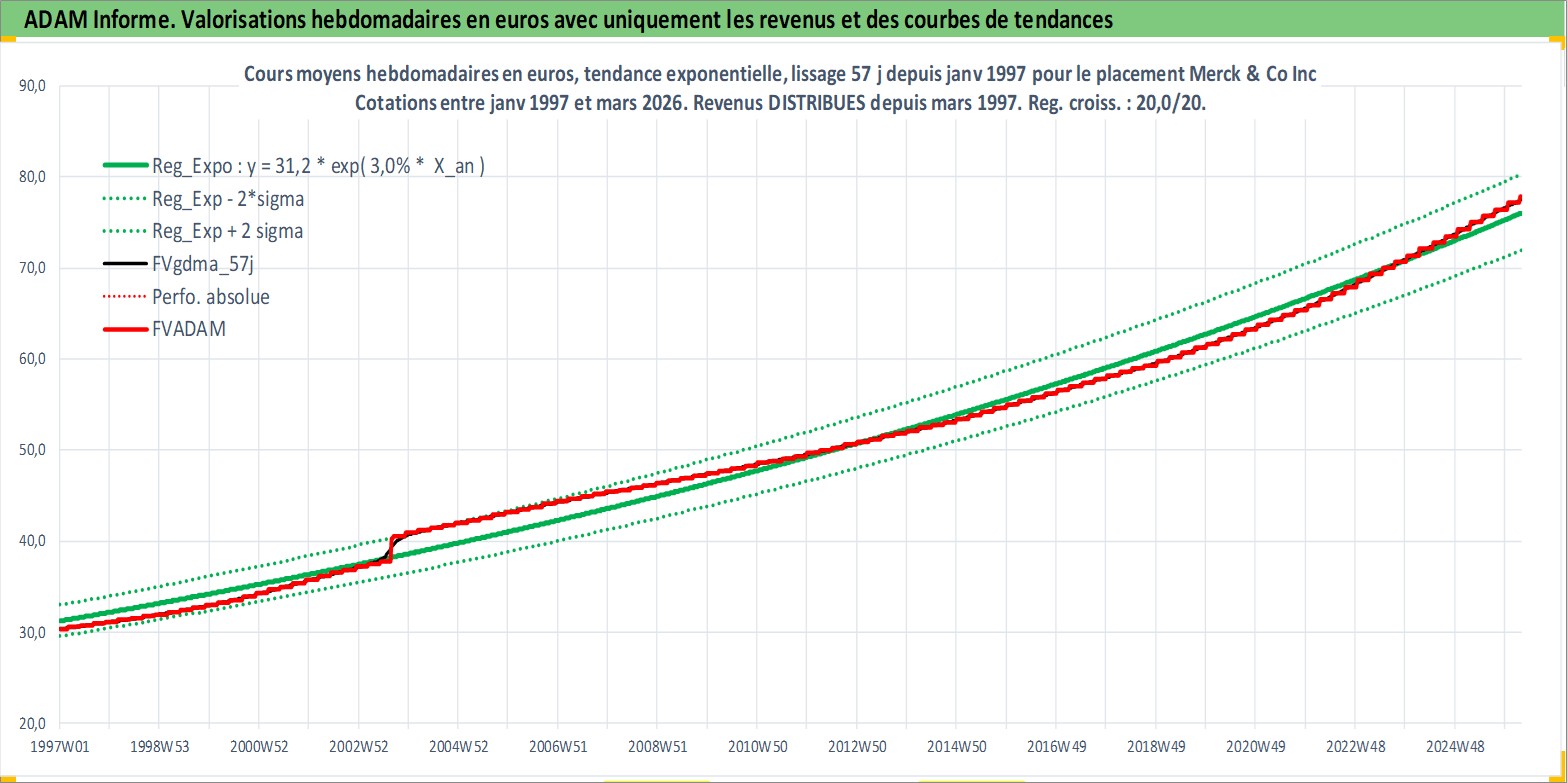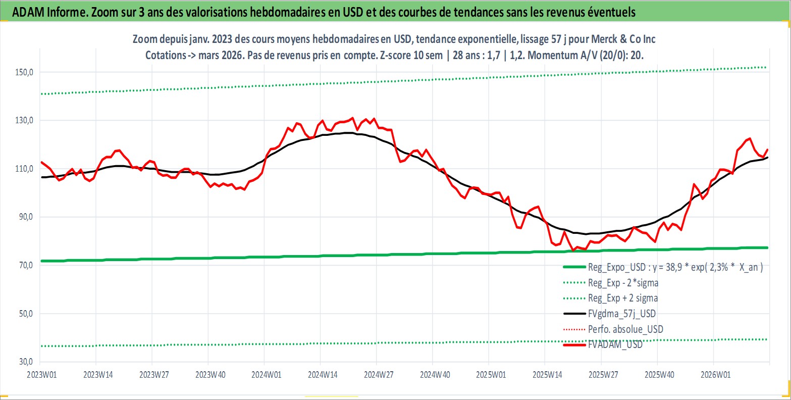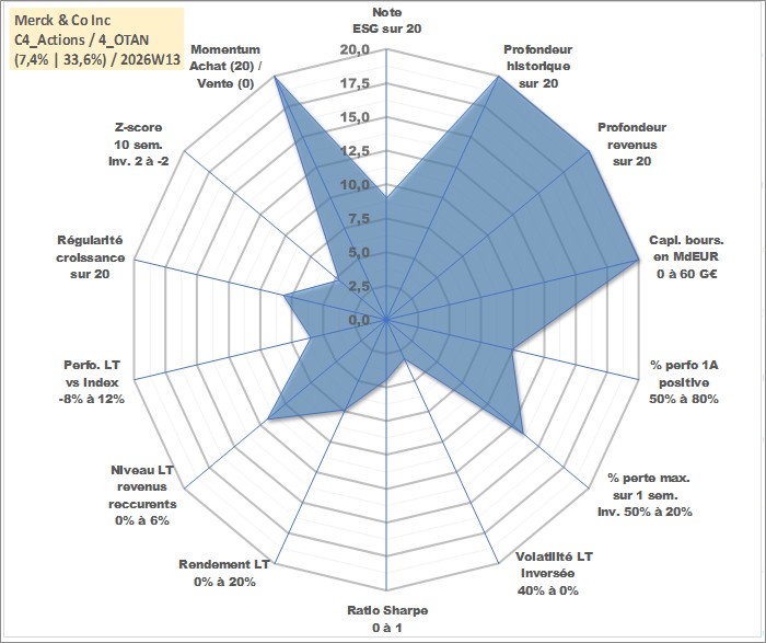 Site dédié aux investisseursPage dédiée sur site financeAnalyse des valorisations hebdomadaires de l'action Merck & Co Inc. Cet actif est cote en USD. Les valorisations sont en contrevaleur EURO et couvrent les semaines 1997W01 a 2026W13. Les revenus de cet actif financier sont pris en compte depuis la semaine 1997W10. La note globale ESG de cet actif est estimee a 9.0 (apres rebasage entre 0 et 20).