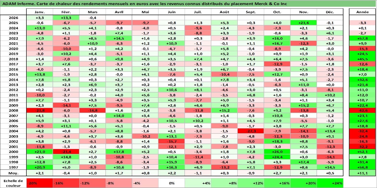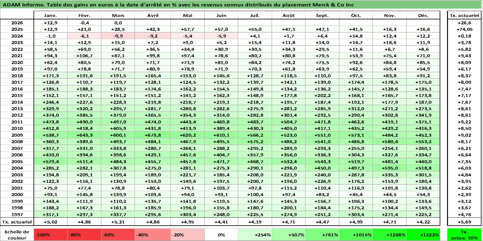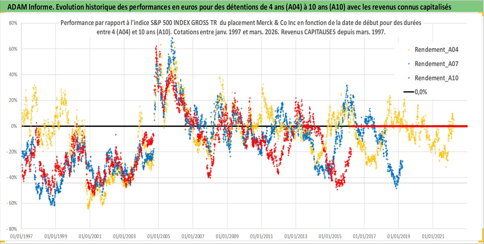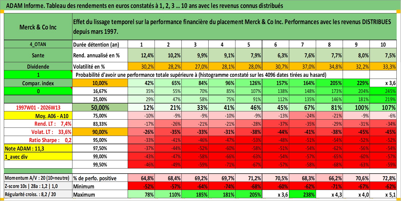 Site dédié aux investisseursPage dédiée sur site financeAnalyse des valorisations hebdomadaires de l'action Merck & Co Inc. Cet actif est cote en USD. Les valorisations sont en contrevaleur EURO et couvrent les semaines 1997W01 a 2026W13. Les revenus de cet actif financier sont pris en compte depuis la semaine 1997W10. La note globale ESG de cet actif est estimee a 9.0 (apres rebasage entre 0 et 20).