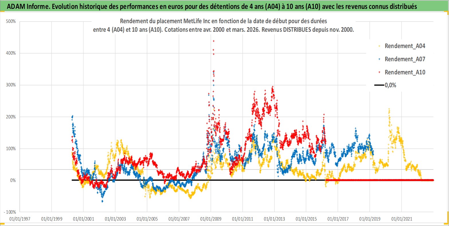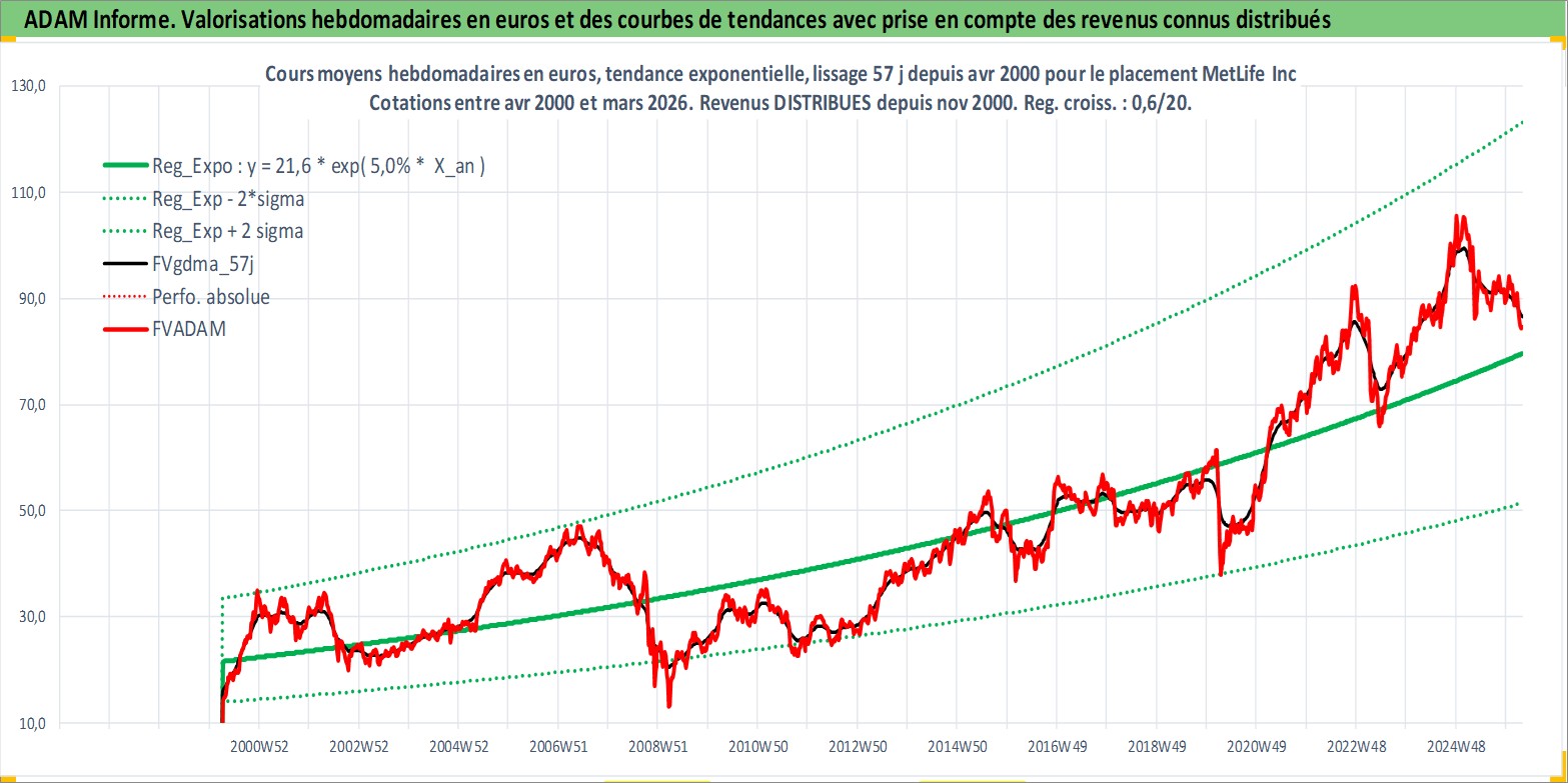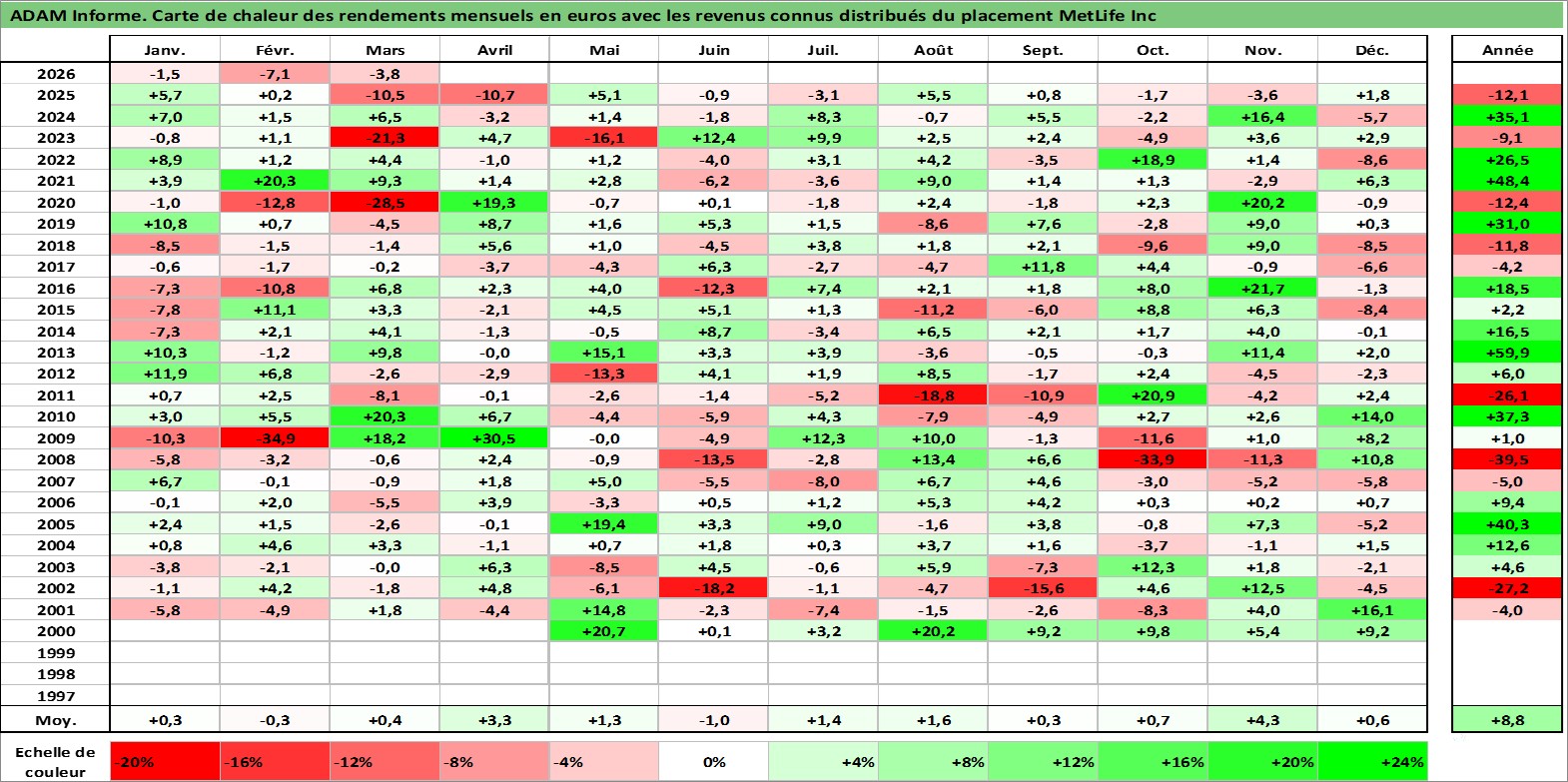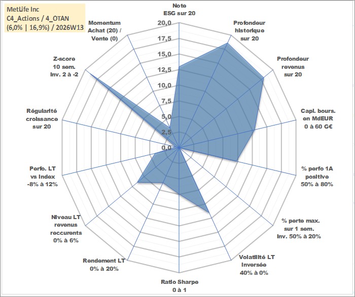 Site dédié aux investisseursPage dédiée sur site financeAnalyse des valorisations hebdomadaires de l'action MetLife Inc. Cet actif est cote en USD. Les valorisations sont en contrevaleur EURO et couvrent les semaines 2000W14 a 2026W13. Les revenus de cet actif financier sont pris en compte depuis la semaine 2000W44. La note globale ESG de cet actif est estimee a 13.0 (apres rebasage entre 0 et 20).