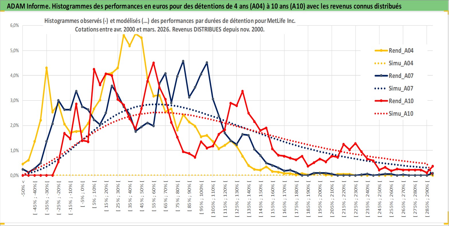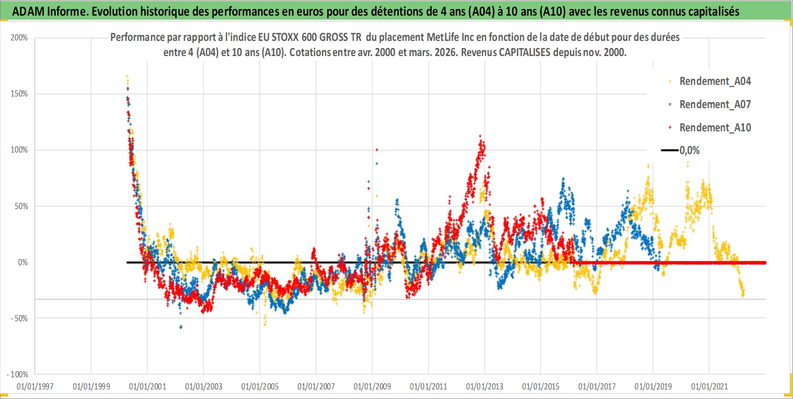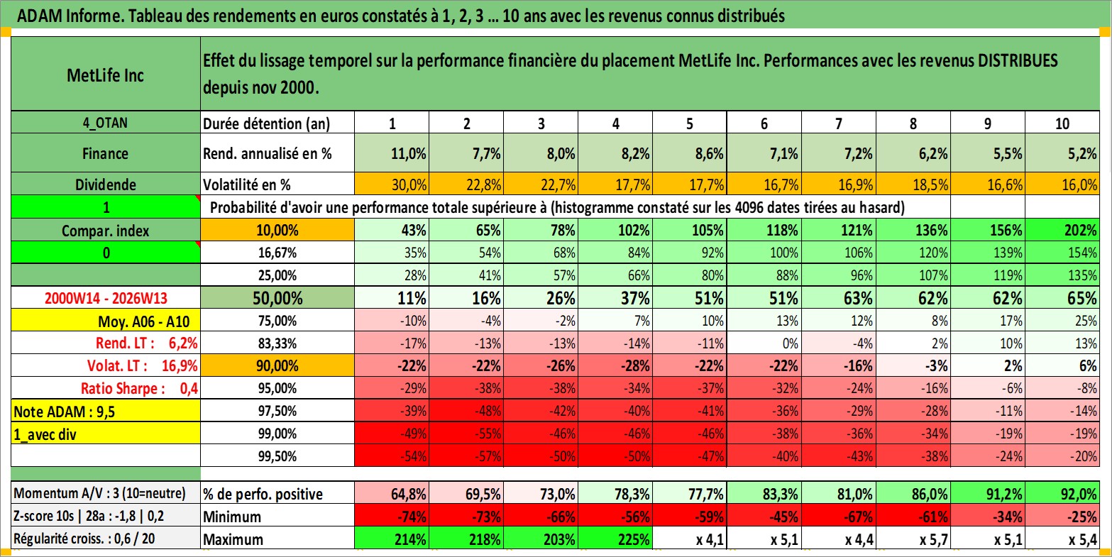 Site dédié aux investisseursPage dédiée sur site financeAnalyse des valorisations hebdomadaires de l'action MetLife Inc. Cet actif est cote en USD. Les valorisations sont en contrevaleur EURO et couvrent les semaines 2000W14 a 2026W13. Les revenus de cet actif financier sont pris en compte depuis la semaine 2000W44. La note globale ESG de cet actif est estimee a 13.0 (apres rebasage entre 0 et 20).