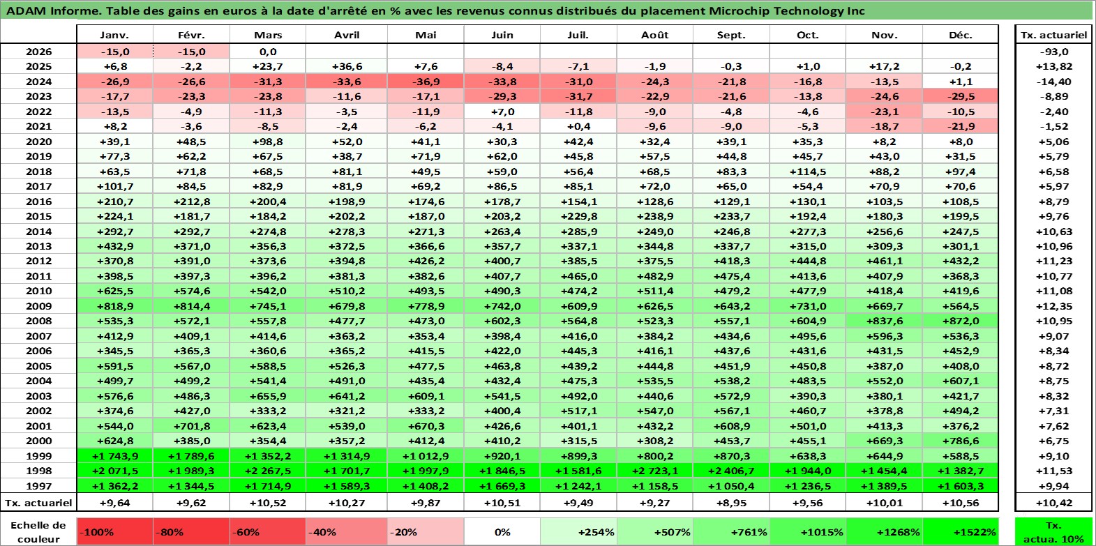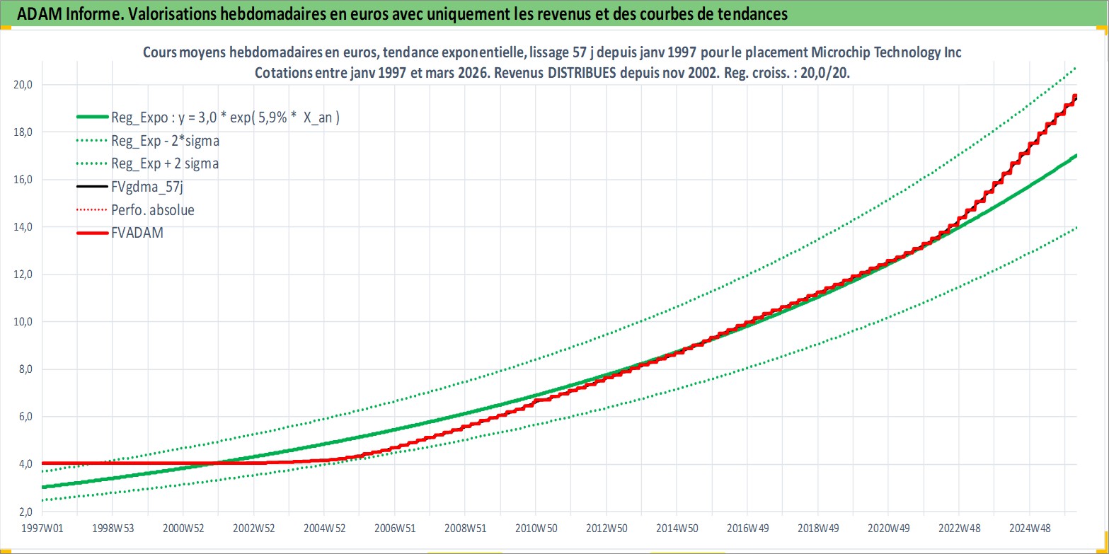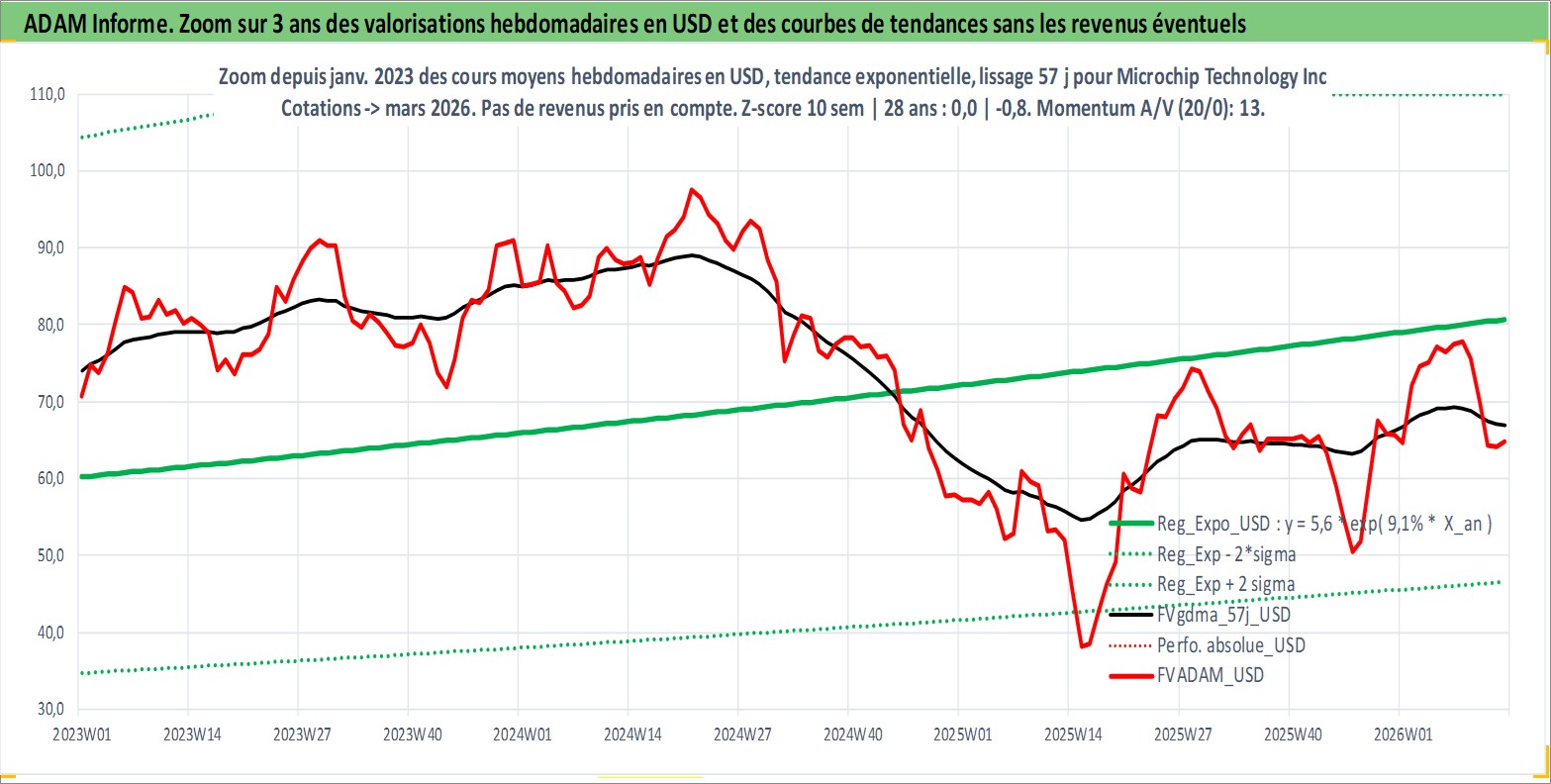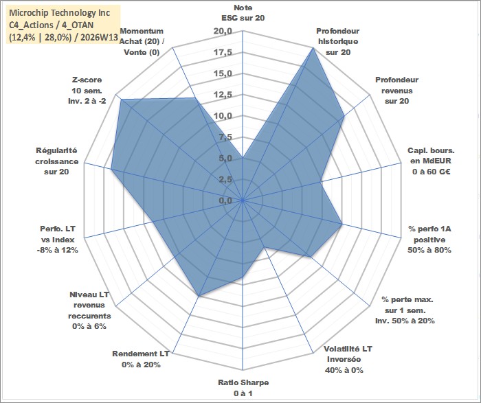Site dédié aux investisseursPage dédiée sur site financeAnalyse des valorisations hebdomadaires de l'action Microchip Technology Inc. Cet actif est cote en USD. Les valorisations sont en contrevaleur EURO et couvrent les semaines 1997W01 a 2026W13. Les revenus de cet actif financier sont pris en compte depuis la semaine 2002W45. La note globale ESG de cet actif est estimee a 5.0 (apres rebasage entre 0 et 20).