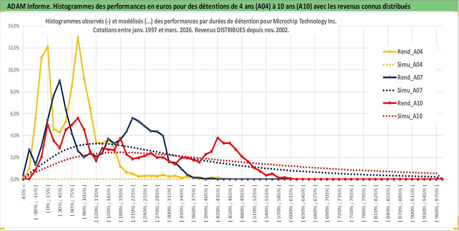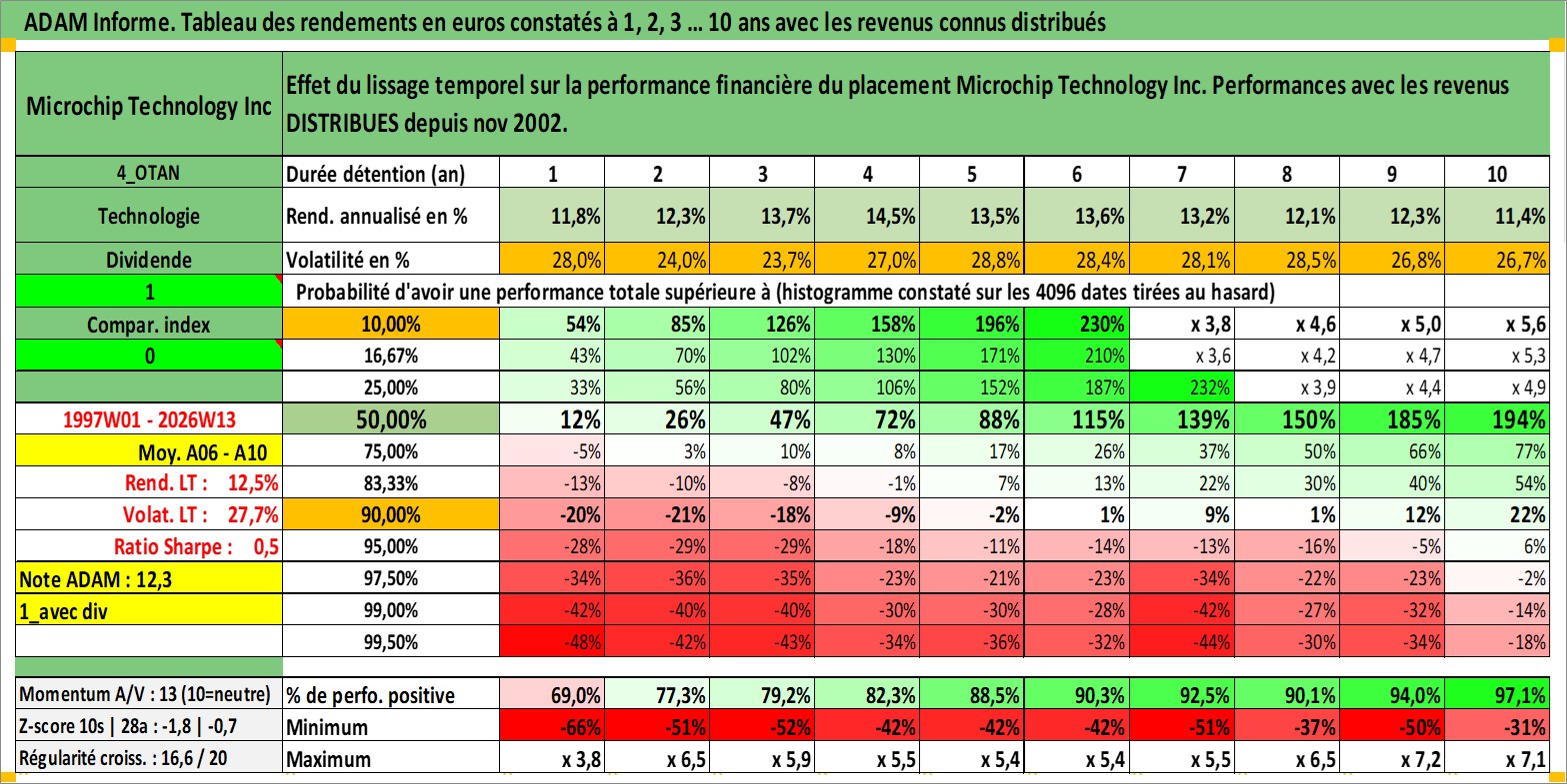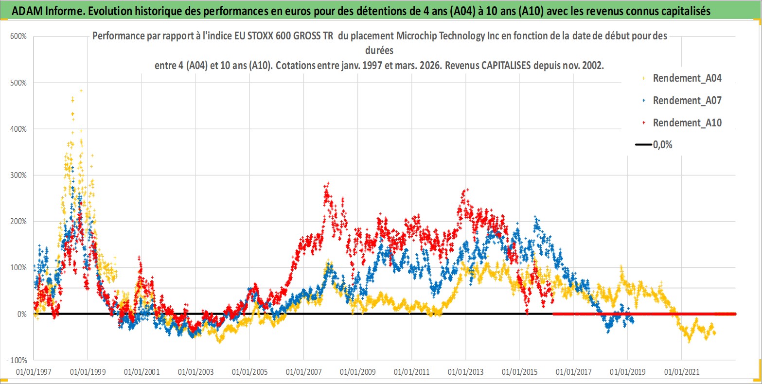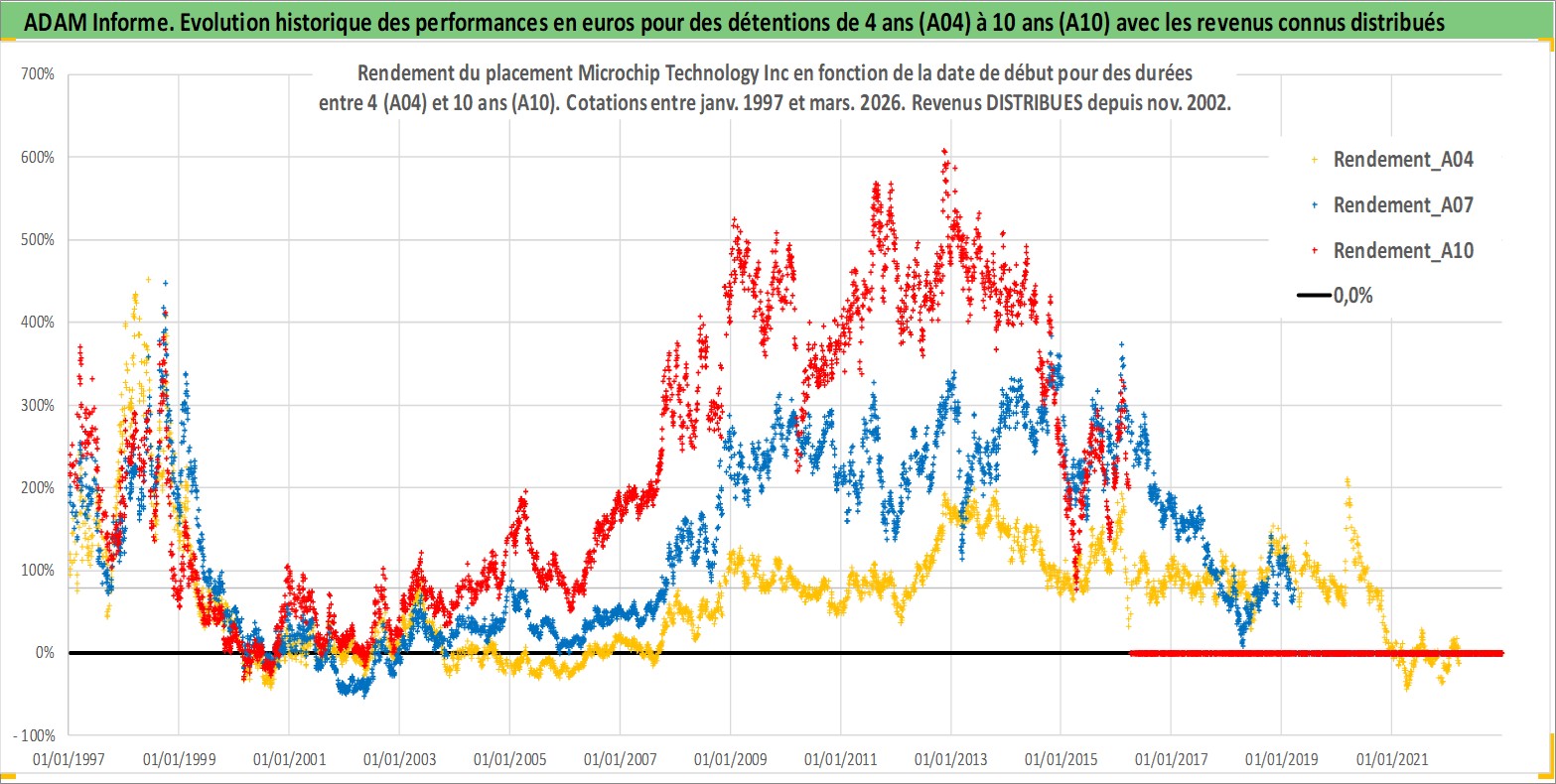 Site dédié aux investisseursPage dédiée sur site financeAnalyse des valorisations hebdomadaires de l'action Microchip Technology Inc. Cet actif est cote en USD. Les valorisations sont en contrevaleur EURO et couvrent les semaines 1997W01 a 2026W13. Les revenus de cet actif financier sont pris en compte depuis la semaine 2002W45. La note globale ESG de cet actif est estimee a 5.0 (apres rebasage entre 0 et 20).