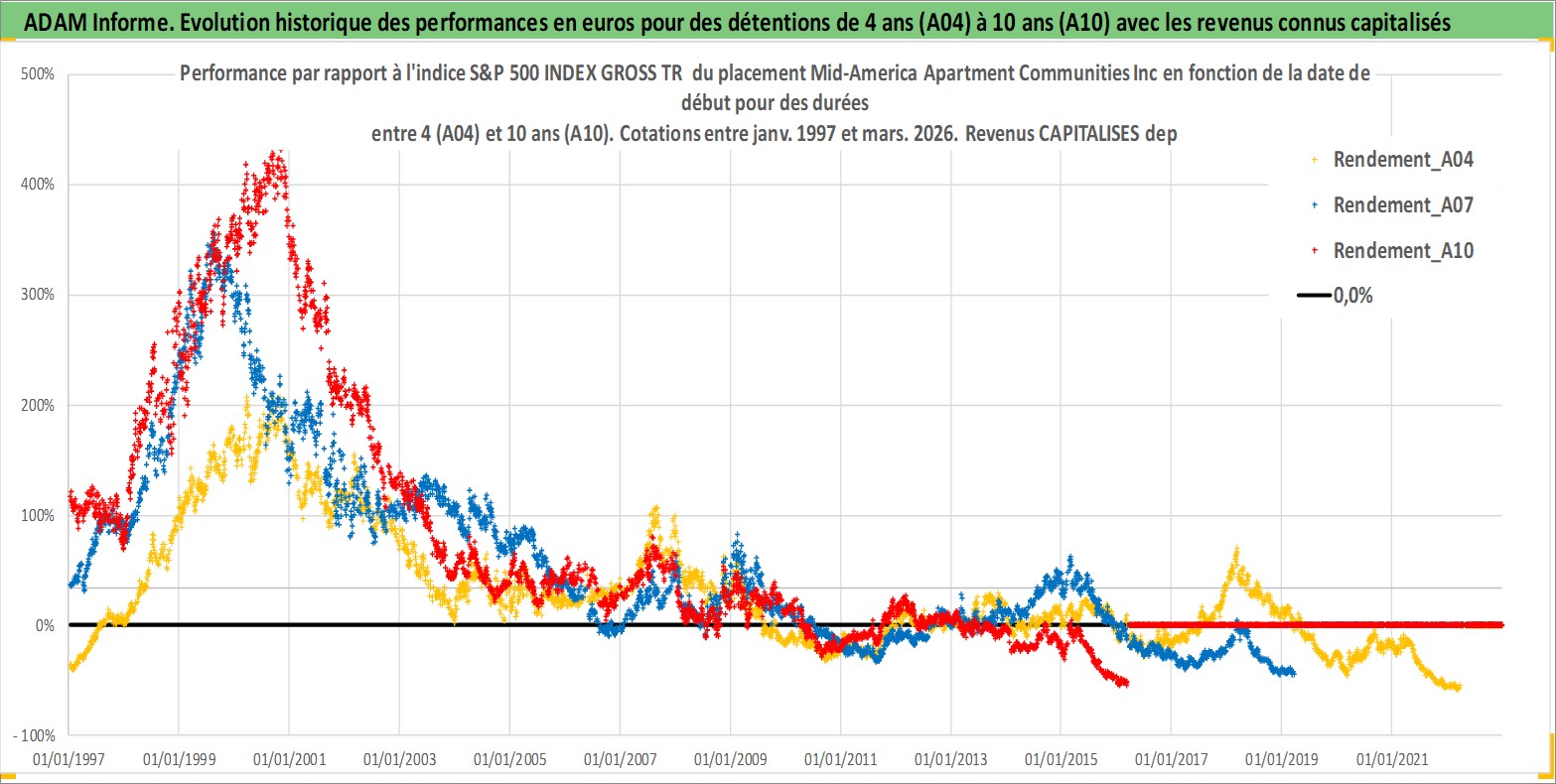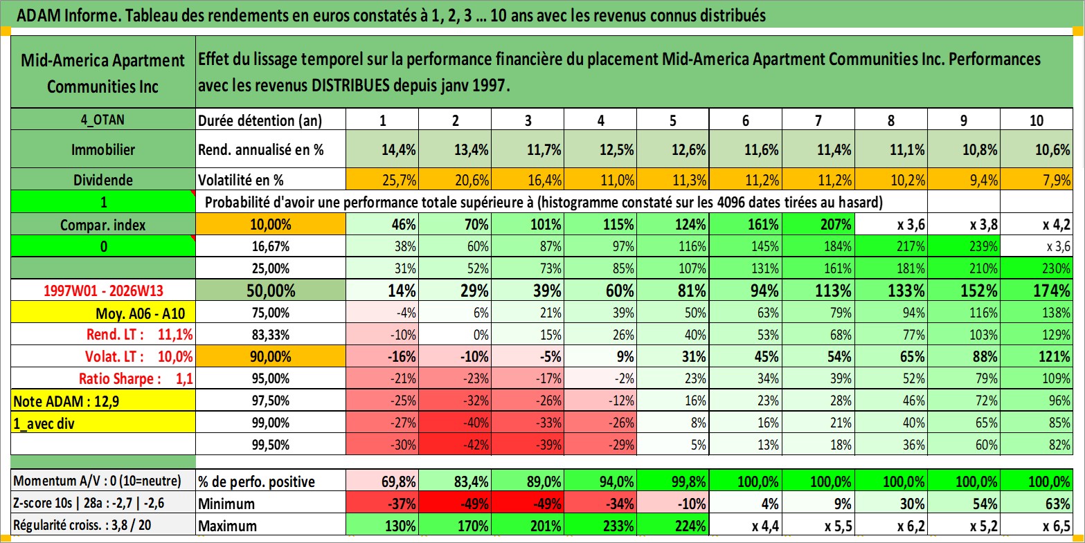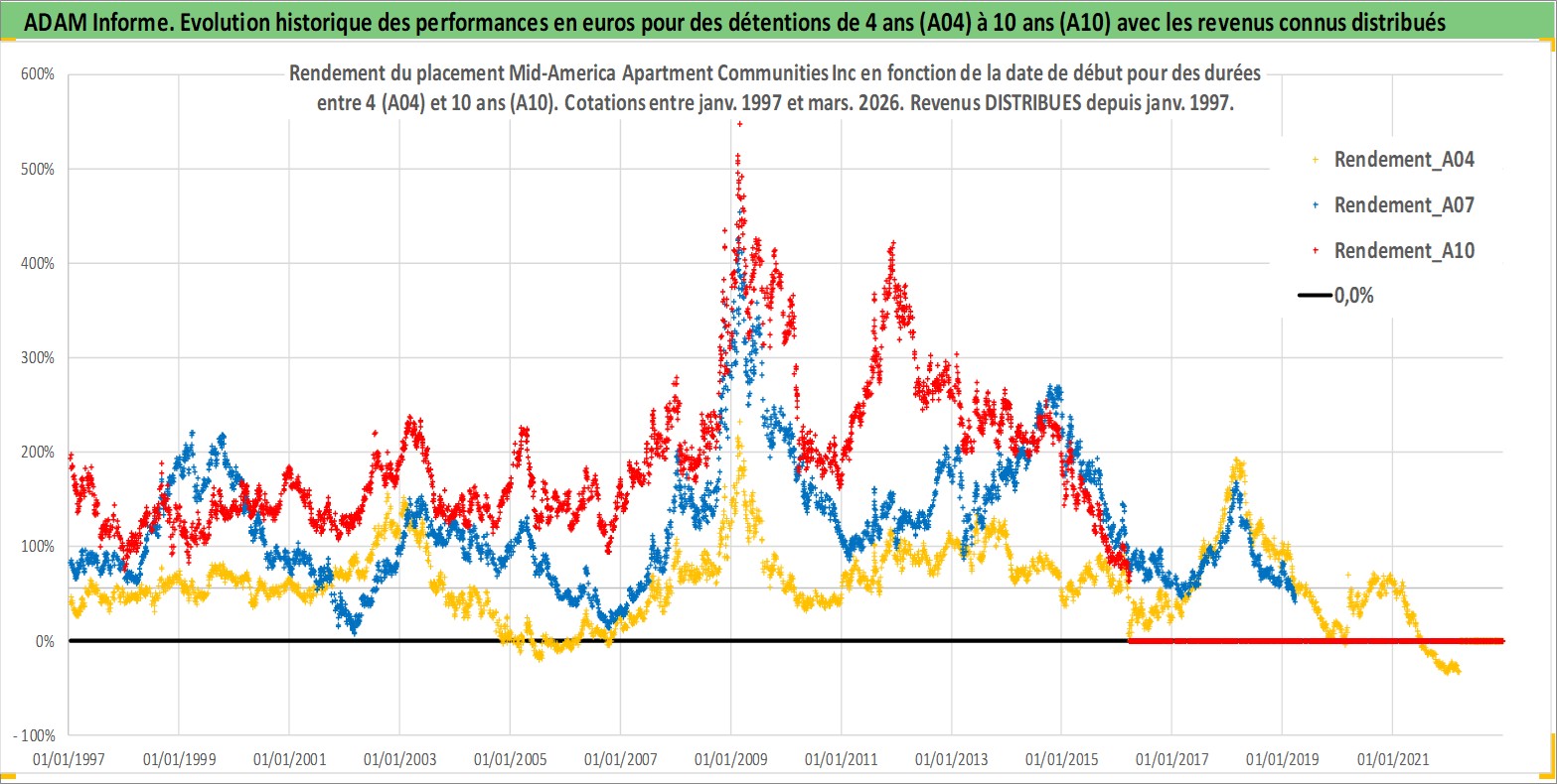 Site dédié aux investisseursPage dédiée sur site financeAnalyse des valorisations hebdomadaires de l'action Mid-America Apartment Communities Inc. Cet actif est cote en USD. Les valorisations sont en contrevaleur EURO et couvrent les semaines 1997W01 a 2026W13. Les revenus de cet actif financier sont pris en compte depuis la semaine 1997W04. La note globale ESG de cet actif est estimee a 13.0 (apres rebasage entre 0 et 20).