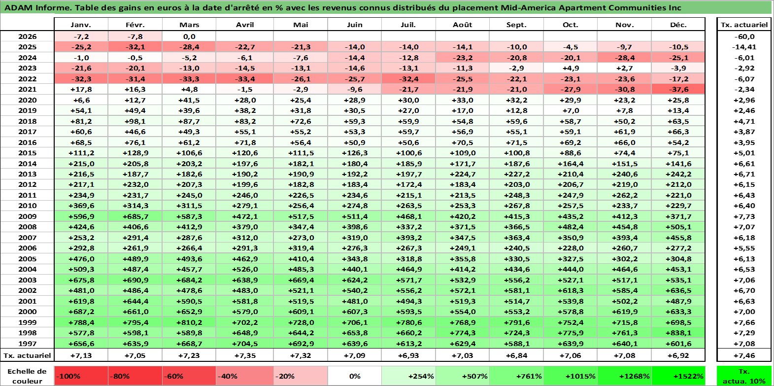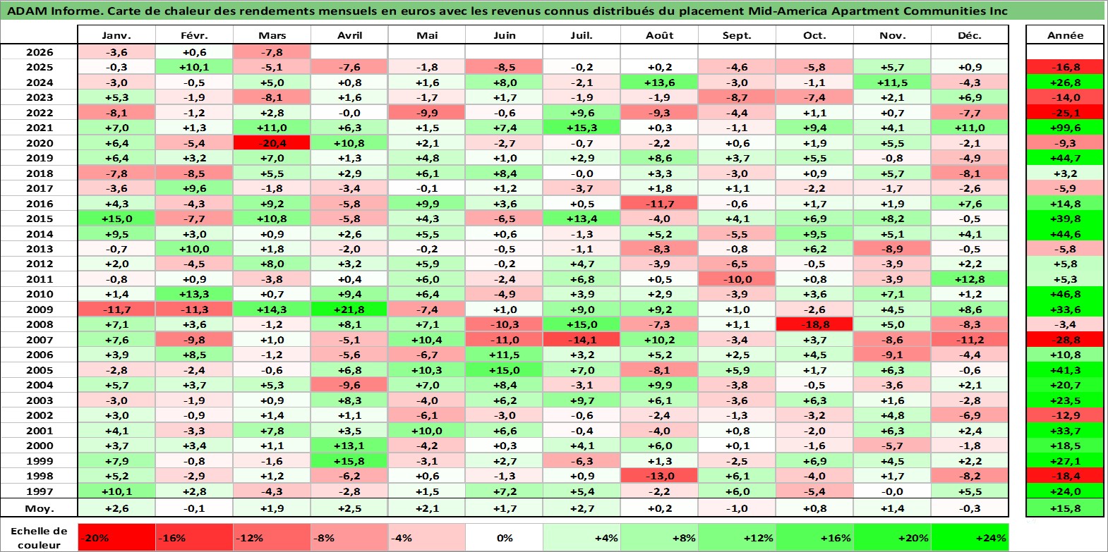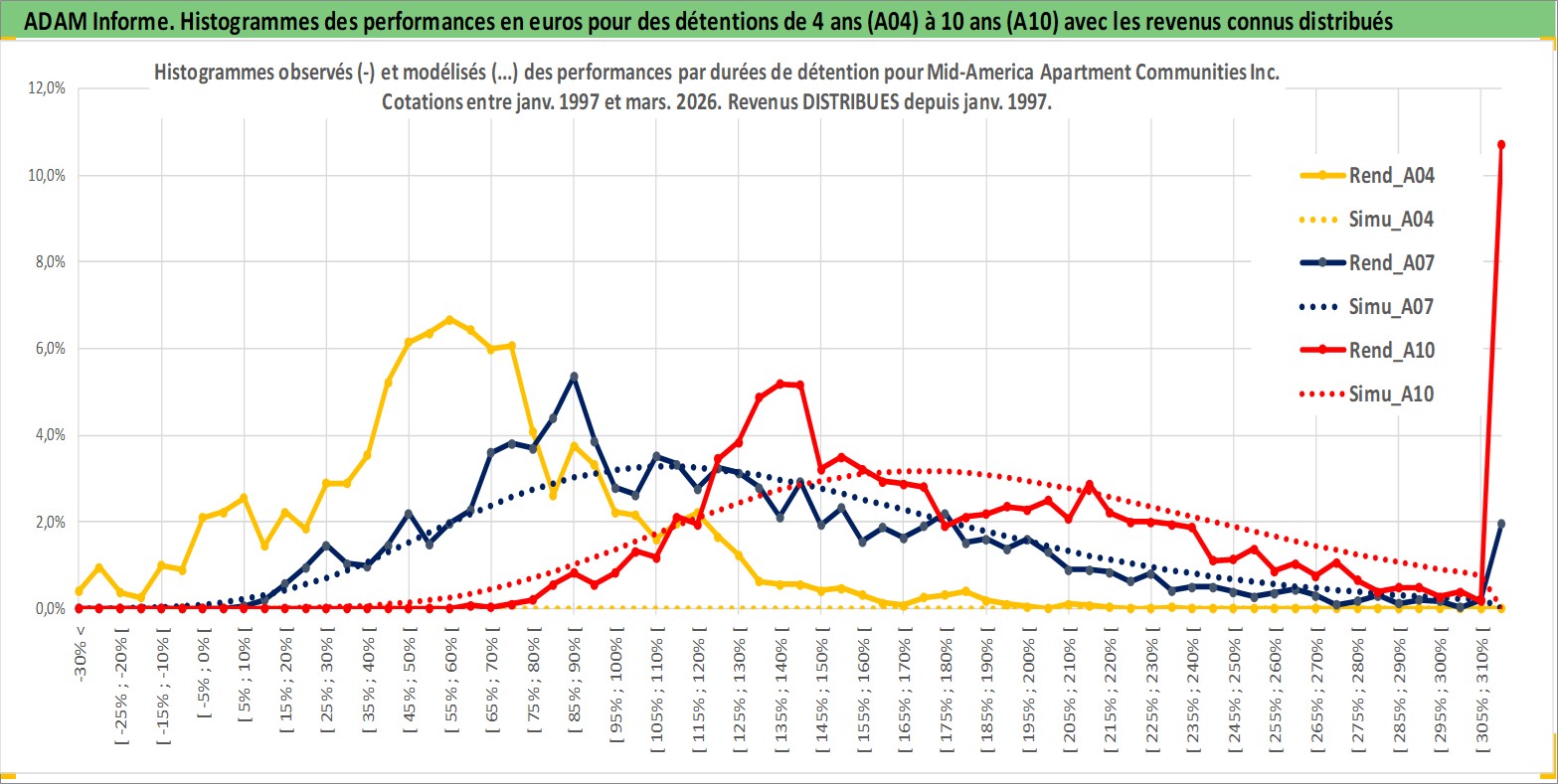 Site dédié aux investisseursPage dédiée sur site financeAnalyse des valorisations hebdomadaires de l'action Mid-America Apartment Communities Inc. Cet actif est cote en USD. Les valorisations sont en contrevaleur EURO et couvrent les semaines 1997W01 a 2026W13. Les revenus de cet actif financier sont pris en compte depuis la semaine 1997W04. La note globale ESG de cet actif est estimee a 13.0 (apres rebasage entre 0 et 20).