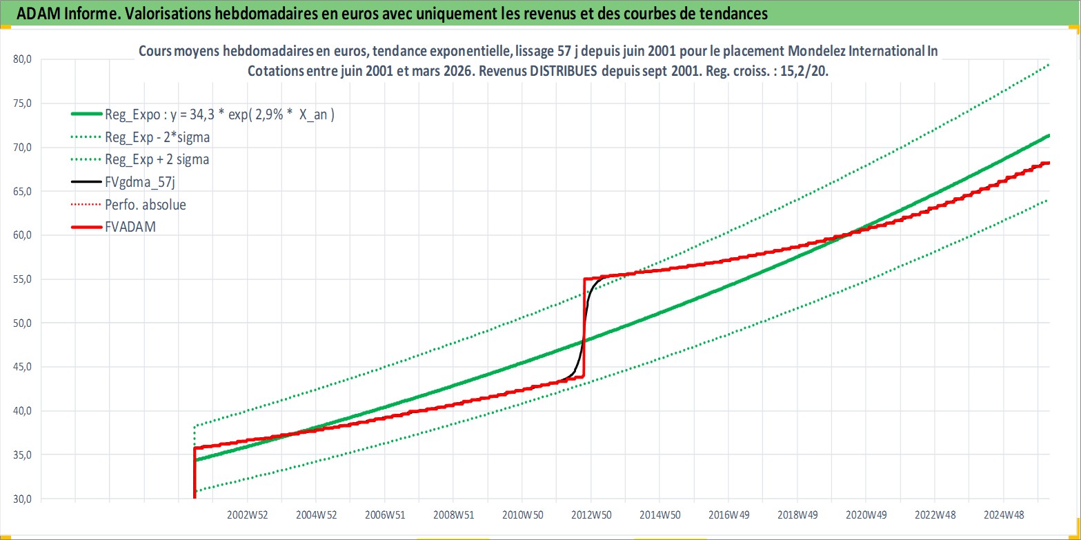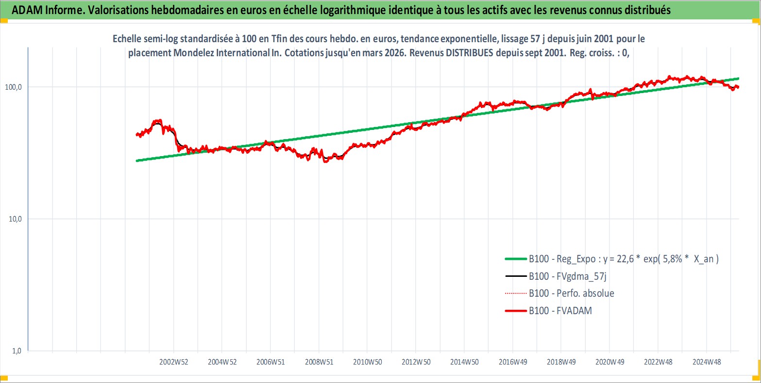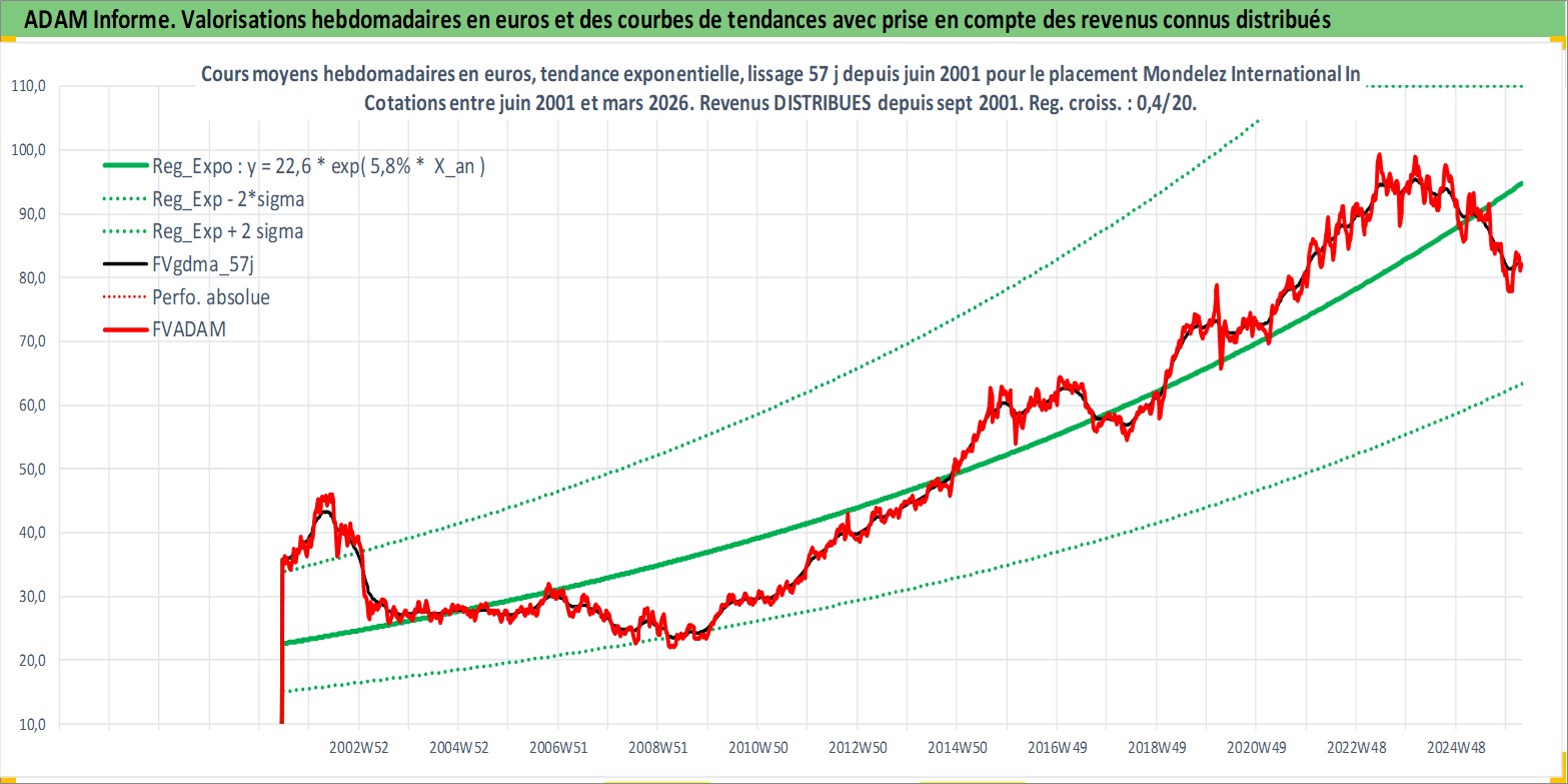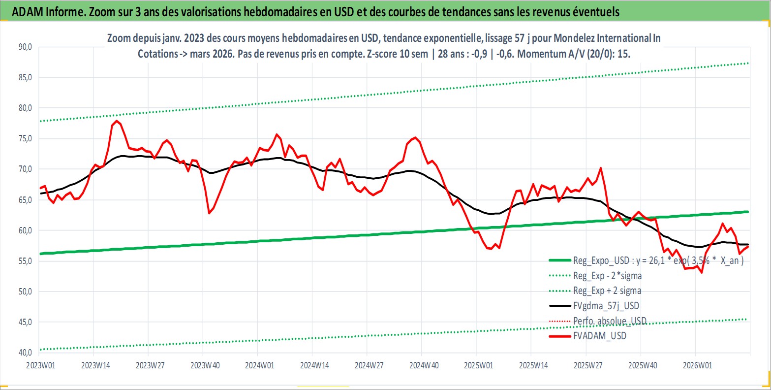 Site dédié aux investisseursPage dédiée sur site financeAnalyse des valorisations hebdomadaires de l'action Mondelez International Inc. Cet actif est cote en USD. Les valorisations sont en contrevaleur EURO et couvrent les semaines 2001W24 a 2026W13. Les revenus de cet actif financier sont pris en compte depuis la semaine 2001W37. La note globale ESG de cet actif est estimee a 8.0 (apres rebasage entre 0 et 20).
