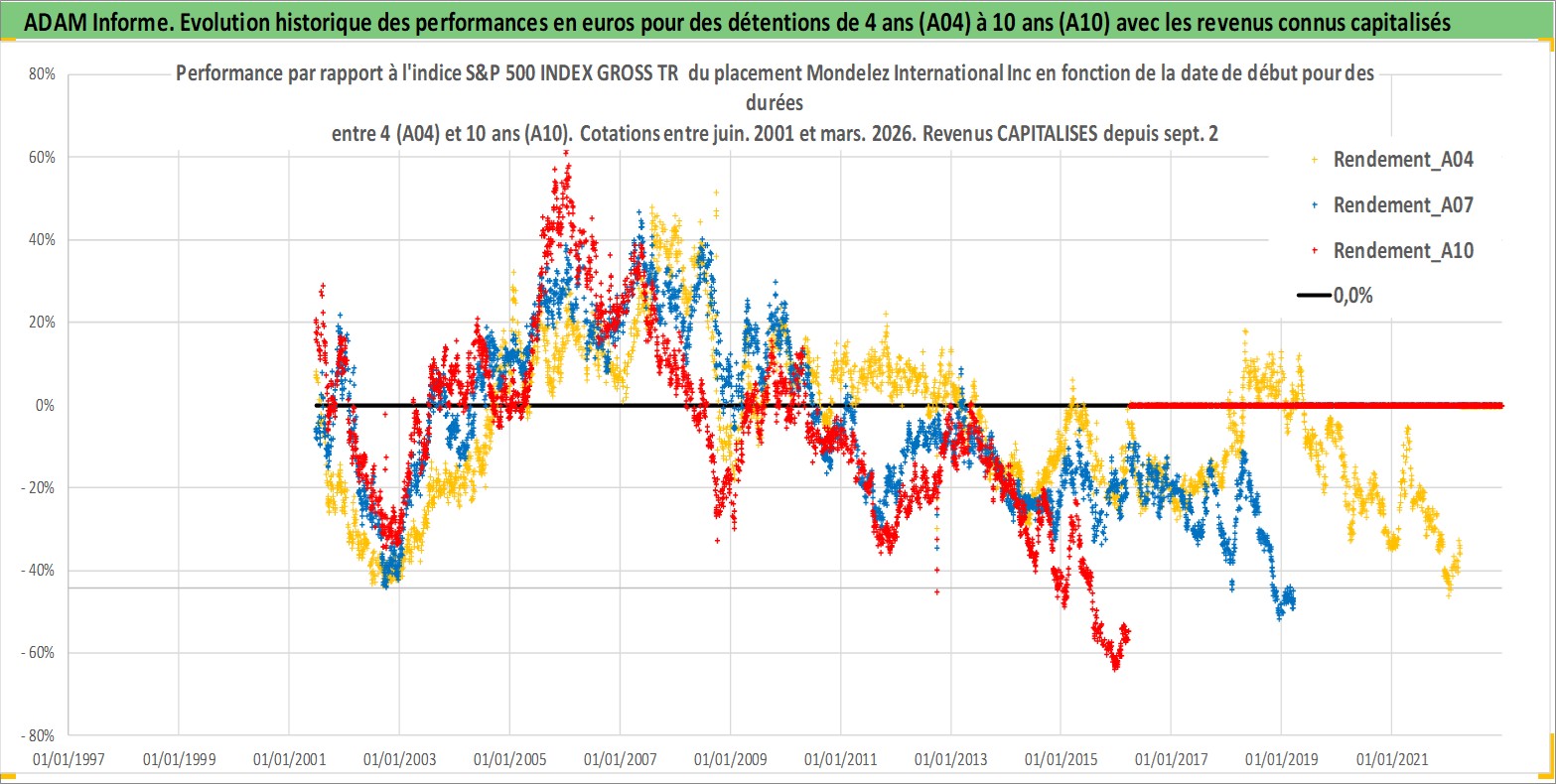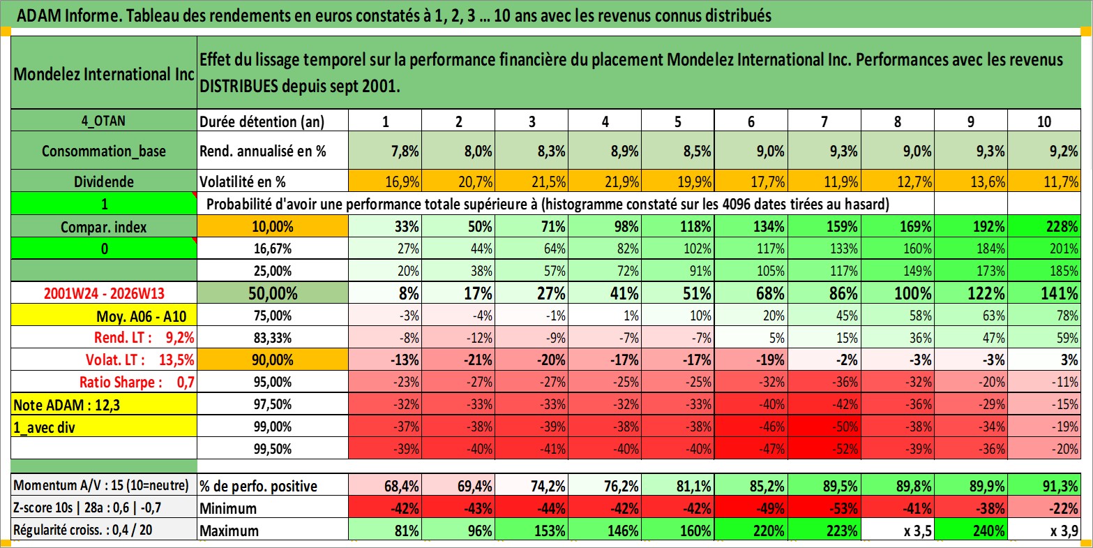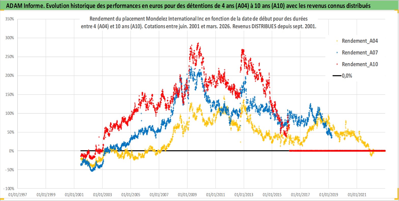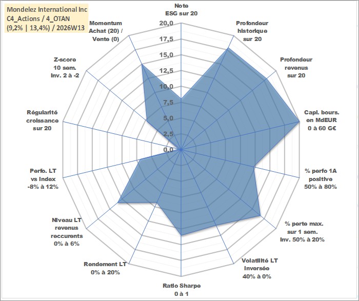 Site dédié aux investisseursPage dédiée sur site financeAnalyse des valorisations hebdomadaires de l'action Mondelez International Inc. Cet actif est cote en USD. Les valorisations sont en contrevaleur EURO et couvrent les semaines 2001W24 a 2026W13. Les revenus de cet actif financier sont pris en compte depuis la semaine 2001W37. La note globale ESG de cet actif est estimee a 8.0 (apres rebasage entre 0 et 20).